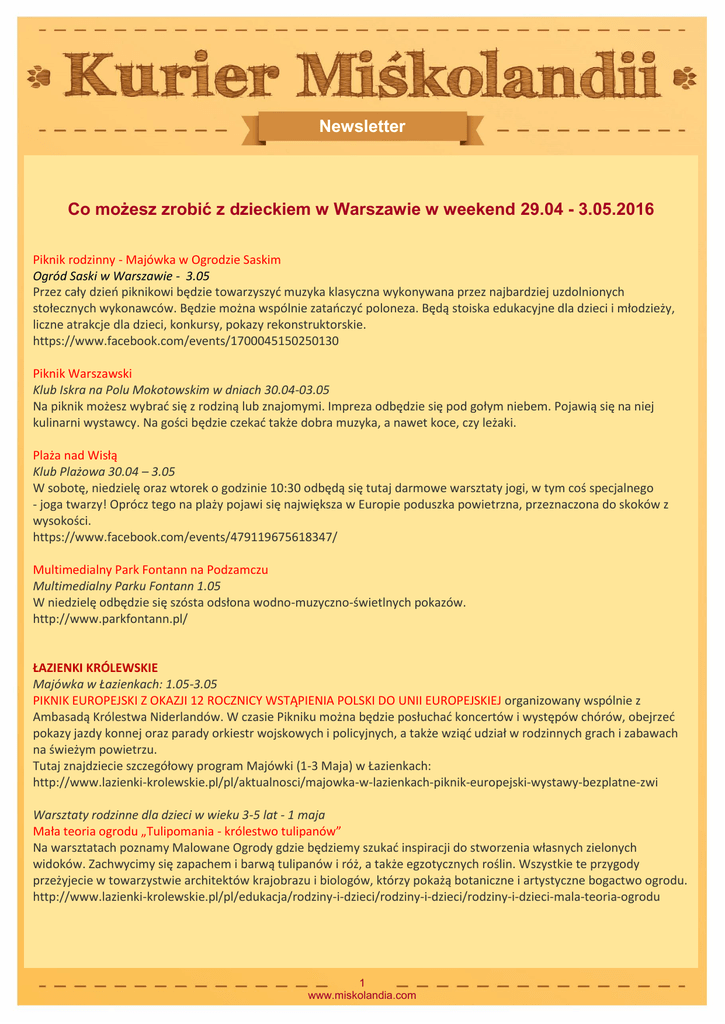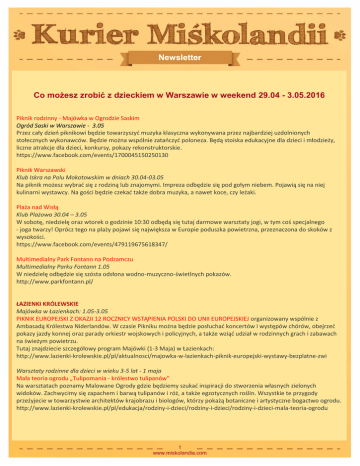 Newsletter Co możesz zrobić z dzieckiem w Warszawie w weekend 29.04 - 3.05.2016 Piknik rodzinny - Majówka w Ogrodzie Saskim Ogród Saski w Warszawie - 3.05 Przez cały dzień piknikowi będzie towarzyszyć muzyka klasyczna wykonywana przez najbardziej uzdolnionych stołecznych wykonawców. Będzie można wspólnie zatańczyć poloneza. Będą stoiska edukacyjne dla dzieci i młodzieży, liczne atrakcje dla dzieci, konkursy, pokazy rekonstruktorskie. https://www.facebook.com/events/1700045150250130 Piknik Warszawski Klub Iskra na Polu Mokotowskim w dniach 30.04-03.05 Na piknik możesz wybrać się z rodziną lub znajomymi. Impreza odbędzie się pod gołym niebem. Pojawią się na niej kulinarni wystawcy. Na gości będzie czekać także dobra muzyka, a nawet koce, czy leżaki. Plaża nad Wisłą Klub Plażowa 30.04 – 3.05 W sobotę, niedzielę oraz wtorek o godzinie 10:30 odbędą się tutaj darmowe warsztaty jogi, w tym coś specjalnego - joga twarzy! Oprócz tego na plaży pojawi się największa w Europie poduszka powietrzna, przeznaczona do skoków z wysokości. https://www.facebook.com/events/479119675618347/ Multimedialny Park Fontann na Podzamczu Multimedialny Parku Fontann 1.05 W niedzielę odbędzie się szósta odsłona wodno-muzyczno-świetlnych pokazów. http://www.parkfontann.pl/ ŁAZIENKI KRÓLEWSKIE Majówka w Łazienkach: 1.05-3.05 PIKNIK EUROPEJSKI Z OKAZJI 12 ROCZNICY WSTĄPIENIA POLSKI DO UNII EUROPEJSKIEJ organizowany wspólnie z Ambasadą Królestwa Niderlandów. W czasie Pikniku można będzie posłuchać koncertów i występów chórów, obejrzeć pokazy jazdy konnej oraz parady orkiestr wojskowych i policyjnych, a także wziąć udział w rodzinnych grach i zabawach na świeżym powietrzu. Tutaj znajdziecie szczegółowy program Majówki (1-3 Maja) w Łazienkach: http://www.lazienki-krolewskie.pl/pl/aktualnosci/majowka-w-lazienkach-piknik-europejski-wystawy-bezplatne-zwi Warsztaty rodzinne dla dzieci w wieku 3-5 lat - 1 maja Mała teoria ogrodu „Tulipomania - królestwo tulipanów” Na warsztatach poznamy Malowane Ogrody gdzie będziemy szukać inspiracji do stworzenia własnych zielonych widoków. Zachwycimy się zapachem i barwą tulipanów i róż, a także egzotycznych roślin. Wszystkie te przygody przeżyjecie w towarzystwie architektów krajobrazu i biologów, którzy pokażą botaniczne i artystyczne bogactwo ogrodu. http://www.lazienki-krolewskie.pl/pl/edukacja/rodziny-i-dzieci/rodziny-i-dzieci/rodziny-i-dzieci-mala-teoria-ogrodu 1 www.miskolandia.com Newsletter MUZEUM SZTUKI NOWOCZESNEJ W WARSZAWIE Warsztaty dla dzieci w wieku 6-12 lat – 30.04 Cykl działania otwarte „Zawód Artysta” Na wystawie „Po co wojny są na świecie” z przymrużeniem oka spróbujecie określić kim jest artysta, jakie są różnice między artystami profesjonalnymi i artystami-outsiderami, a co ich łączy. Prace znajdujące się na wystawie będą inspiracją do wspólnych działań plastycznych http://artmuseum.pl/pl/wydarzenia/dzialania-otwarte-warsztaty-dla-dzieci-zawod-artysta Warsztaty dla dzieci w wieku 6-12 lat – 1.05 Cykl działania otwarte „Pożegnanie z Emilką” Pożegnamy Emilkę. Po raz ostatni w Emilce, staniemy się architektami, poszukiwaczami, odkrywcami, twórcami - jednym słowem ARTYSTAMI! Zaprojektujecie i wybudujecie makietę przyszłej siedziby Muzeum Sztuki Nowoczesnej. http://artmuseum.pl/pl/wydarzenia/dzialania-otwarte-warsztaty-dla-dzieci-pozegnanie-z-emilka CENTRUM NAUKI KOPERNIK Warsztaty Familijne dla dzieci w wieku 5-8 lat. – 2.05. Dzieci razem z rodzicami wspólnie przeprowadzają doświadczenia, testują, szukają odpowiedzi na trudne pytania. „Dlaczego instrumenty grają?” http://www.kopernik.org.pl/warsztaty/warsztaty-familijne/ Minilaby dla dzieci w wieku 9-13 lat (do 29 maja): Minilab Robotyczny „ZANIK PAMIĘCI” Czy roboty potrafią nauczyć się obcego języka? Czy tak samo jak ludzie pamiętają zdarzenia z przeszłości? A może też grozi im zanik pamięci? W trakcie zajęć dowiecie się jak zaprogramować robota, aby mówił i wykonywał różne zadania. Minilab Fizyczny „ŚWIAT W NIEKOLORZE” Czy powinniśmy wierzyć własnych oczom? Na zajęciach w laboratorium fizycznym zasiejemy w tobie wątpliwość, że trawa jest zielona, a pomidor czerwony. Pokażemy ci, że kolor nie jest cechą przedmiotu, chociaż nasze codzienne doświadczenie oraz język przeciwstawiają się temu twierdzeniu. Podczas zajęć wykonamy doświadczenia dotyczące światła i kolorów i zagramy w ciekawą grę. Minilab Chemiczny „CHEMICZNA POMARAŃCZA” Zapachy otaczają nas wszędzie i niosą wiele znaczeń. Mogą być przyjemne lub nie, szkodliwe lub lecznicze, przywoływać miłe wspomnienia lub wywoływać poczucie strachu. Z niektórych właściwości zapachów korzystamy w życiu codziennym. Na zajęciach odkryjesz, co zyskasz destylując skórkę pomarańczową oraz jak otrzymać zapachy za pomocą reakcji chemicznych. Dowiesz się też, co wspólnego z cytrusami ma druk 3D. Minilab Biologiczny „FOTOSYNTEZA W KULKACH” Jakim światłem najlepiej oświetlać kwiatki w domu? Czy ślimaki potrafią kraść geny? Dlaczego zjadając glony są w stanie przeprowadzać fotosyntezę? Dlaczego niektóre stułbie są zielone i co mają wspólnego z roślinami. Weź udział i zamknij glony w kulkach, przekonaj się, jakie substancje są potrzebne do przeprowadzenia fotosyntezy, zobacz chloroplasty, wyizoluj barwniki roślinne i przekonaj się, jak dzięki nim można przewidzieć wysokość plonów. http://www.kopernik.org.pl/laboratoria/minilaby/ PLANETARIUM CENTRUM NAUKI KOPERNIK Seanse dla dzieci: - Polaris, - Ziemia, księżyc i słońce, - Rejs po niebie, - Astronauta, - Jesteśmy kosmitami, - Trzeci wymiar życia, - Pod jednym niebem, - Sekrety kartonowej rakiety, - Czarne dziury. Podróż w nieznane, - Rejs po niebie. http://www.kopernik.org.pl/planetarium/ 2 www.miskolandia.com Newsletter MUZEUM NARODOWE W WARSZAWIE W