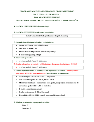 PROGRAM NAUCZANIA PRZEDMIOTU OBOWIĄZKOWEGO NA WYDZIALE LEKARSKIM I ROK AKADEMICKI 2016/2017 PRZEWODNIK DYDAKTYCZNY dla STUDENTÓW II ROKU STUDIÓW 1. NAZWA PRZEDMIOTU : Parazytologia 2. NAZWA JEDNOSTKI realizującej przedmiot: Katedra i Zakład Biologii i Parazytologii Lekarskiej 3. Adres jednostki odpowiedzialnej za dydaktykę: Adres: ul. Fredry 10, 61-701 Poznań Tel. /Fax 61 854 62 36 Strona WWW http://www.parasit.ump.edu.pl E-mail [email protected] 4. Kierownik jednostki: prof. zw. dr hab. Anna C. Majewska 5. Osoba zaliczająca przedmiot w E-indeksie z dostępem do platformy WISUS prof. zw. dr hab. Anna C. Majewska 6. Osoba odpowiedzialna za dydaktykę na Wydziale Lekarskim I z dostępem do platformy WISUS ( listy studentów) ( koordynator przedmiotu) : Nazwisko prof. zw. dr hab. Anna C. Majewska Tel. kontaktowy: 61 854 62 36, 61 854 60 76 Możliwość kontaktu - konsultacje (dni, godz., miejsce) od poniedziałku do czwartku; godz. 9.00-14.00; w Katedrze E-mail: [email protected] Osoba zastępująca dr Piotr Nowosad Kontakt tel. 61 854 6080, e-mail: [email protected] 7. Miejsce przedmiotu w programie studiów: Rok: II Semestr: 3 8. Liczba godzin ogółem: 25 liczba pkt.ECTS: 1 Semestr zimowy/letni liczba godzin Jednostki uczestniczące w nauczaniu przedmiotu Katedra i Zakład Biologii i Parazytologii Lekarskiej Razem: W Ć Ćwiczenia kategoria 5 20 B 5 20 S 9. SYLABUS ( proszę wypełnić wszystkie pola w tabeli) Nazwa przedmiotu/ modułu Wydział Nazwa kierunku studiów Poziom kształcenia Forma studiów Język przedmiotu Rodzaj przedmiotu Parazytologia Lekarski I lekarski jednolite studia magisterskie stacjonarne polski obowiązkowy fakultatywny Rok studiów/semestr 1 2 3 4 5 6 7 8 9 I II III IV V VI 10 11 12 Liczba godzin zajęć dydaktycznych z podziałem na formy prowadzenia zajęć 25 godz., w tym: 5 godz. wykładów i 20 godz. ćwiczeń Założenia i cele przedmiotu Celem jest poznanie zagadnień parazytologii lekarskiej: złożoności układu pasożyt-żywiciel, klasyfikacji pasożytów oraz budowy, cykli rozwojowych, epidemiologii, geograficznego zasięgu występowania i diagnostyki pasożytów człowieka oraz podstawowych objawów przez nie wywoływanych. Symbol efektów kształce nia zgodnie ze OPIS KIERUNKOWYCH EFEKTÓW KSZTAŁCENIA Metody weryfikacji osiągnięcia zamierzonych efektów kształcenia: standard ami WIEDZA (ZGODNIE ZE SZCZEGÓŁOWYMI EFEKTAMI KSZTAŁCENIA) C.W12 Klasyfikuje drobnoustroje (pasożyty) C.W13 Zna epidemiologię zarażeń grzybami (mikrosporydiami) i pasożytami, z uwzględnieniem geograficznego zasięgu ich występowania C.W15 Zna inwazyjne dla człowieka formy lub stadia rozwojowe wybranych pasożytniczych grzybów, pierwotniaków, helmintów i stawonogów, z uwzględnieniem geograficznego zasięgu ich występowania C.W16 Omawia zasadę funkcjonowania układu pasożyt-żywiciel oraz zna podstawowe objawy chorobowe wywoływane przez pasożyty C.W18 Zna i rozumie podstawy diagnostyki parazytologicznej D.W15 Zna zasady pracy w grupie E.W37 Zna rodzaje materiałów biologicznych wykorzystywanych w diagnostyce laboratoryjnej oraz zasady pobierania materiału do badań E.W38 Zna podstawy teoretyczne i praktyczne diagnostyki laboratoryjnej sprawdzian zaliczeniowy bieżące odpytywanie na ćwiczeniach; sprawdzian praktyczny i zaliczeniowy bieżące odpytywanie na ćwiczeniach; sprawdzian praktyczny i zaliczeniowy bieżące odpytywanie na ćwiczeniach; sprawdzian zaliczeniowy bieżące odpytywanie na ćwiczeniach; sprawdzian zaliczeniowy obserwacja w trakcie zajęć, sprawdzian praktyczny (multimedialny quiz z diagnostyki parazytologicznej) bieżące odpytywanie na ćwiczeniach; sprawdzian praktyczny i zaliczeniowy bieżące odpytywanie na ćwiczeniach; sprawdzian zaliczeniowy UMIEJĘTNOŚCI (ZGODNIE ZE SZCZEGÓŁOWYMI EFEKTAMI KSZTAŁCENIA) A.U1 Obsługuje mikroskop optyczny – także w zakresie korzystania z immersji C.U7 Rozpoznaje najczęściej spotykane pasożyty człowieka na podstawie ich budowy, cykli życiowych oraz objawów chorobowych C.U9. Przygotowuje preparat i rozpoznaje patogeny pod mikroskopem D.U11 Komunikuje się ze współpracownikami zespołu, udzielając konstruktywnej Obserwacja w trakcie ćwiczeń sprawdzian praktyczny: multimedialny quiz z diagnostyki parazytologicznej Obserwacja w trakcie ćwiczeń sprawdzian informacji zwrotnej i wsparcia praktyczny: multimedialny quiz z diagnostyki parazytologicznej KOMPETENCJE SPOŁECZNE (ZGODNIE Z OGÓLNYMI EFEKTAMI KSZTAŁCENIA) PUNKTY ECTS 1 TREŚCI MERYTORYCZNE PRZEDMIOTU: układ pasożyt-żywiciel, klasyfikacja, budowa, cykle rozwojowe, diagnostyka i epidemiologia, podstawowe objawy chorób pasożytniczych Tematyka Klasyfikacja pasożytów i układ pasożyt-żywiciel Układ pasożyt-żywiciel i środowiskowe uwarunkowania chorób pasożytniczych Środowiskowe uwarunkowania chorób pasożytniczych Pierwotniaki i mikrosporydia układu pokarmowego i moczowopłciowego (Giardia intestinalis, Trichomonas vaginalis, Entamoeba histolytica, E. dispar, E. coli, Cryptosporidium spp., Balantidium coli, Enterocytozoon bieneusi, Encephalitozoon intestinalis, E. hellem, E. cuniculi) Pierwotniaki tkanek i płynów ustrojowych tkanek (Trypanosoma brucei gambiense, T. b. rhodesiense, T. cruzi, Leishmania spp., Plasmodium spp., Toxoplasma gondii, Naegleria fowleri, Acanthamoeba spp.) Helminty układu pokarmowego i tkanek - przywry i tasiemce (Clonorchis sinensis, Schistosoma spp., Paragonimus westermani, Diphyllobothrium latum, Taenia saginata, T. solium, Hymenolepis nana, Echinococcus granulosus, E. multilocularis) Helminty układu pokarmowego i tkanek - nicienie (Ascaris lumbricoides, Trichuris trichiura, Enterobius vermicularis, Strongyloides stercoralis, Toxocara sp., Trichinella spp., jaja helmintów – umiejętność rozpoznawania) Pasożytnicze stawonogi (Argas sp., Ixodes ricinus, Sarcoptes scabiei, Demodex sp., Pediculus sp., Pthirus pubis, Cimex lectularius, Pulex irritans), wykonywanie prepa