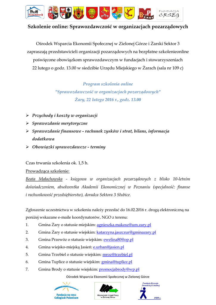 Szkolenie online: Sprawozdawczość w organizacjach pozarządowych Ośrodek Wsparcia Ekonomii Społecznej w Zielonej Górze i Żarski Sektor 3 zapraszają przedstawicieli organizacji pozarządowych na bezpłatne szkolenieonline poświęcone obowiązkom sprawozdawczym w fundacjach i stowarzyszeniach 22 lutego o godz. 13.00 w siedzibie Urzędu Miejskiego w Żarach (sala nr 109 c) Program szkolenia online "Sprawozdawczość w organizacjach pozarządowych" Żary, 22 lutego 2016 r., godz. 13.00 Przychody i koszty w organizacji Sprawozdanie merytoryczne Sprawozdanie finansowe - rachunek zysków i strat, bilans, informacja dodatkowa Obowiązki sprawozdawcze - terminy Czas trwania szkolenia ok. 1,5 h. Prowadząca szkolenie: Beata Małachowska - księgowa w organizacjach pozarządowych z blisko 10-letnim doświadczeniem, absolwentka Akademii Ekonomicznej w Poznaniu (specjalność: finanse i rachunkowość przedsiębiorstw), doradca Sektora 3 Słubice. Zgłoszenie uczestnictwa w szkoleniu należy przesłać do 16.02.2016 r. drogą elektroniczną na poniżej wskazane e-maile koordynatorów, NGO z terenu: 1. Gmina Żary o statusie miejskim: [email protected] 2. Gmina Żary o statusie wiejskim: [email protected] 3. Gmina Przewóz o statusie wiejskim: [email protected] 4. Gmina wiejsko-miejską Jasień: [email protected] 5. Gmina Trzebiel o statusie wiejskim: [email protected] 6. Gmina Tuplice o statusie wiejskim: [email protected] 7. Gmina Brody o statusie wiejskim: [email protected] Ośrodek Wsparcia Ekonomii Społecznej w Zielonej Górze