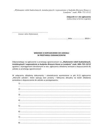 „Wykonanie robót budowlanych, instalacyjnych i wyposażenia w budynku Bravura House w Londynie” znak: WBr-752-15/12 Załącznik nr 1 do ogłoszenia (należy złożyć w formie oryginału) .................................................................... (nazwa i adres Wykonawcy) ...................................., dnia ....................... 2013 r. WNIOSEK O DOPUSZCZENIE DO UDZIAŁU W PRZETARGU OGRANICZONYM Odpowiadając na ogłoszenie o przetargu ograniczonym na „Wykonanie robót budowlanych, instalacyjnych i wyposażenia w budynku Bravura House w Londynie” znak: WBr-752-15/12 zgodnie z wymaganiami określonymi w ww. ogłoszeniu składamy wniosek o dopuszczenie do udziału w przetargu ograniczonym W załączeniu składamy dokumenty i oświadczenia wymienione w pkt III.2) ogłoszenia „Warunki udziału”, które opisują stan prawny i faktyczny aktualny na dzień składania wniosków o dopuszczenie do udziału w postępowaniu: 1) ……………………………………............................................................................................... .......................................................................................................................................... 2) ……………………………………............................................................................................... .......................................................................................................................................... 3) ……………………………………............................................................................................... .......................................................................................................................................... 4) ……………………………………............................................................................................... .......................................................................................................................................... 5) ……………………………………............................................................................................... .......................................................................................................................................... 6) ……………………………………............................................................................................... .......................................................................................................................................... 7) ……………………………………............................................................................................... .......................................................................................................................................... 8) ……………………………………............................................................................................... „Wykonanie robót budowlanych, instalacyjnych i wyposażenia w budynku Bravura House w Londynie” znak: WBr-752-15/12 .......................................................................................................................................... 9) ……………………………………............................................................................................... .......................................................................................................................................... 10) …………………………………................................................................................................ .......................................................................................................................................... 11) …………………………………................................................................................................ .......................................................................................................................................... 12) …………………………………................................................................................................ .......................................................................................................................................... 13) …………………………………................................................................................................ .......................................................................................................................................... Wniosek wraz z załącznikami został złożony na ….. stronach. Adres Wykonawcy, na który należy przesyłać ewentualną korespondencję: ................................................................................................................................................ tel. ............................................................................ faks ...................................................... e-mail: ...................................................................... Osoba uprawniona do kontaktów z Zamawiającym ................................................................................................................................................ ............................................................. (podpis i pieczęć osoby uprawnionej do reprezentacji Wykonawcy) „Wykonanie robót budowlanych, instalacyjnych i wyposażenia w budynku Bravura House w Londynie” znak: WBr-752-15/12 Załącznik nr 2 do ogłoszenia (należy złożyć w formie oryginału) …………………………………….…… (nazwa i adres Wykonawcy) ...................................., dnia ....................... 2013 r. OŚWIADCZENIE WYKONAWCY o spełnieniu warunków udziału w postępowaniu określonych w art. 22 ust. 1 ustawy z