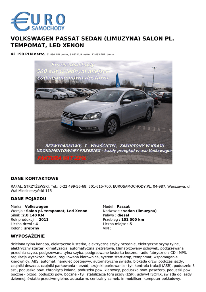 VOLKSWAGEN PASSAT SEDAN (LIMUZYNA) SALON PL. TEMPOMAT, LED XENON 42 190 PLN netto, 51 894 PLN brutto, 9 832 EUR netto, 12 093 EUR brutto DANE KONTAKTOWE RAFAŁ, STRZYŻEWSKI, Tel.: 0-22 499-56-68, 501-615-700, EUROSAMOCHODY.PL, 04-987, Warszawa, ul. Wał Miedzieszyński 115 DANE POJAZDU Marka : Volkswagen Wersja : Salon pl. tempomat, Led Xenon Silnik :2.0 140 KM Rok produkcji : 2011 Liczba drzwi : 4 Kolor : srebrny Model : Passat Nadwozie : sedan (limuzyna) Paliwo : diesel Przebieg : 151 000 km Liczba miejsc : 5 VIN : WYPOSAŻENIE dzielona tylna kanapa, elektryczne lusterka, elektryczne szyby przednie, elektryczne szyby tylne, elektryczny starter, klimatyzacja: automatyczna 2-strefowa, klimatyzowany schowek, podgrzewana przednia szyba, podgrzewana tylna szyba, podgrzewane lusterka boczne, radio fabryczne z CD i MP3, regulacja wysokości fotela, regulowana kierownica, system start-stop, tempomat, wspomaganie kierownicy, ABS, automat. hamulec postojowy, automatyczne światła, blokada drzwi podczas jazdy, czujniki deszczu, czujniki parkowania - przód, czujniki parkowania - tył, kontrola trakcji (ASR), poduszek: 8 szt., poduszka pow. chroniąca kolana, poduszka pow. kierowcy, poduszka pow. pasażera, poduszki pow. boczne - przód, poduszki pow. boczne - tył, stabilizacja toru jazdy (ESP), uchwyt ISOFIX, światła do jazdy dziennej, światła przeciwmgielne, autoalarm, centralny zamek, immobiliser, komputer pokładowy, reflektory halogenowe, reflektory ksenonowe, wyjście aux, światła LED WYPOSAŻENIE DODATKOWE bezwypadkowy, gwarancja, książka serwisowa, możliwa zamiana, serwisowany w ASO, stan bardzo dobry OPIS POJAZDU Salon Polska WITAMY W NAJWIĘKSZYM W POLSCE SALONIE SAMOCHODÓW UŻYWANYCH SUPER PROMOCJA GWARANCJA TECHNICZNA NA 12 MIESIĘCY lub KOMPLET OPON ZIMOWYCH lub LETNICH GRATIS*(do wyczerpania zapasów, możliwość rozszerzenia gwarancji do 36 miesięcy) - 500 AUT Z GWARANCJĄ w jednym miejscu / różne marki , modele , wersje wyposażenia/ - 8 dni na zamianę auta - Sprawdzone pochodzenie pojazdów - bezwypadkowe - Gwarancja przebiegu - Gwarancja pełnej historii serwisowej - Samochody od I właściciela - dla klientów zamiejscowych rezerwacja auta do czasu przyjazdu - udzielamy 12-miesięcznej gwarancji technicznej, możliwość przedłużenia do 36-miesięcy /bez limitu kilometrów, ważna na terenie całej Polski + assistance- darmowe holowanie , potwierdzenie certyfikatem / Kupującemu oferujemy: 1. Jazdę próbną 2. Bezpłatny przegląd przedsprzedażowy obejmujący: - kontrolę amortyzatorów - hamulców - podwozia samochodu - pomiar geometrii - diagnoza komputerowa - pomiar grubości powłoki lakierniczej - możliwość sprawdzenia przed zakupem w serwisie lub stacji diagnostycznej lub za pośrednictwem niezależnego rzeczoznawcy na zlecenie kupującego /dla klientów zamiejscowych bez konieczności przyjazdu/. - wszystkie nasze samochody posiadają komplet dokumentów wymaganych do zarejestrowania bądź przerejestrowania samochodu - przyjmujemy auta w rozliczeniu oraz kupujemy /bez ograniczeń wiekowych/ - Zajmujemy się sprzedażą detaliczną oraz hurtową / zapraszamy do współpracy osoby prywatne, firmy również z branży i instytucje / -Kupujący otrzymuje fakturę VAT 23% /nie ponosi opłaty PCC w wysokości 2%/ -kredyt 0% wpłaty własnej,raty dopasowane do własnych potrzeb -leasing bez zaświadczeń ,również dla widniejących w BIK szybka obsługa na miejscu "Niniejsze ogłoszenia są wyłącznie informacją handlową i nie stanowią oferty w myśl art. 66, § 1. Kodeksu Cywilnego. Sprzedający nie odpowiada za ewentualne błędy lub nieaktualność ogłoszenia." Zapis ten został zamieszczony ze względu na możliwość niezamierzonych pomyłek. Jeżeli zauważysz nieścisłość napisz do nas. Szukasz pewnego używanego auta ? Tylko u nas sprawdzone samochody z polskich salonów To nie komis to salon aut używanych z wieloletnim doświadczeniem Więcej informacji na eurosamochody . pl ZADZWOŃ TERAZ!!! Rafał 501 615 700 Tomasz 512 345 150 Marcin 505 416 300 Piotr 501 087 038 Mariusz 500 130 727 QR CODE DLA OGŁOSZENIA Powered by TCPDF (www.tcpdf.org)