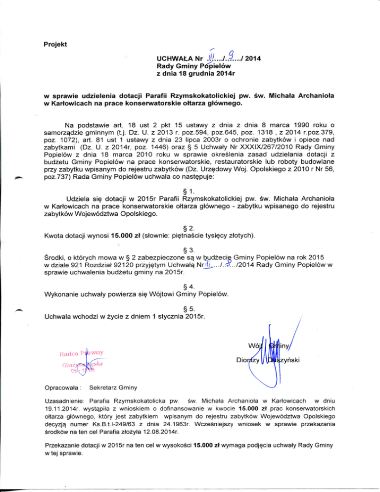 Projekt UCHWALA Nr .(//.. ../..?..../ 2014 Rady Gminy Popielow z dnia 18 grudnia 201 4r w sprawie udzielenia dotacji Parafii Rzymskokatolickiej pw. sw. Michata Archaniota w Kartowicach na prace konserwatorskie ottarza gtownego. Na podstawie art. 18 ust 2 pkt 15 ustawy z dnia z dnia 8 marca 1990 roku o samorza.dzie gminnym (t.j. Dz. U. z 2013 r. poz.594, poz.645, poz. 1318 , z 2014 r.poz.379, poz. 1072), art. 81 ust 1 ustawy z dnia 23 lipca 2003r o ochronie zabytkow i opiece nad zabytkami (Dz. U. z 2014r, poz. 1446) oraz § 5 Uchwaty Nr XXXIX/267/2010 Rady Gminy Popielow z dnia 18 marca 2010 roku w sprawie okreslenia zasad udzielania dotacji z budzetu Gminy Popielow na prace konserwatorskie, restauratorskie lub roboty budowlane przy zabytku wpisanym do rejestru zabytkow (Dz. Urzedowy Woj. Opolskiego z 2010 r Nr 56, poz.737) Rada Gminy Popielow uchwala co nastepuje: §1- Udziela sie dotacji w 2015r Parafii Rzymskokatolickiej pw. sw. Michata Archaniota w Kartowicach na prace konserwatorskie ottarza gtownego - zabytku wpisanego do rejestru zabytkow Wojewodztwa Opolskiego. §2. Kwota dotacji wynosi 15.000 zt (stownie: pietnascie tysiecy ztotych). §3Srodki, o ktorych mowa w § 2 zabezpieczone sa_ w budzecie Gminy Popielow na rok 2015 wdziale 921 Rozdziat 92120 przyjetym Uchwata. Nrj/[i_.../..<^../2014 Rady Gminy Popielow w sprawie uchwalenia budzetu gminy na 2015r. §4. Wykonanie uchwaty powierza sie Wojtowi Gminy Popielow. §5. Uchwala wchodzi w zycie z dniem 1 stycznia 2015r. Radca Opracowata : Sekretarz Gminy Uzasadnienie: Parafia Rzymskokatolicka pw. sw. Michala Archaniota w Kartowicach w dniu 19.11.2014r. wysta.pita z wnioskiem o dofinansowanie w kwocie 15.000 zt prac konserwatorskich ottarza gtownego, ktory jest zabytkiem wpisanym do rejestru zabytkow Wojewodztwa Opolskiego decyzja, numer Ks.B.t.l-249/63 z dnia 24.1963r. Wczesniejszy wniosek w sprawie przekazania srodkbw na ten eel Parafia ztozyta 12.08.2014r. Przekazanie dotacji w 2015r na ten eel w wysokosci 15.000 zt wyrnaga podjecia uchwaty Rady Gminy w tej sprawie.