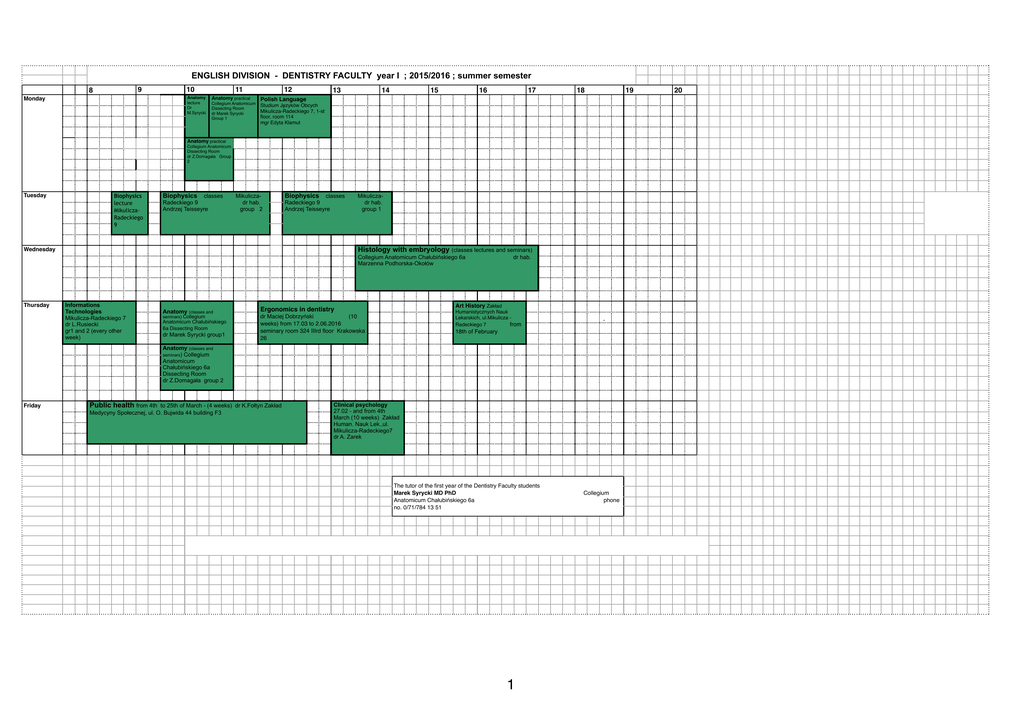 ENGLISH DIVISION - DENTISTRY FACULTY year I ; 2015/2016 ; summer semester 9 8 10 Anatomy lecture Dr M.Syrycki Monday 11 Anatomy practical Collegium Anatomicum Dissecting Room dr Marek Syrycki Group 1 12 13 14 15 16 17 18 19 Polish Language Studium Języków Obcych Mikulicza-Radeckiego 7, 1-st floor, room 114 mgr Edyta Klamut Anatomy practical Collegium Anatomicum Dissecting Room dr Z.Domagała Group 2 Tuesday Biophysics lecture MikuliczaRadeckiego 9 Biophysics classes Radeckiego 9 Andrzej Teisseyre Mikuliczadr hab. group 2 Biophysics classes Radeckiego 9 Andrzej Teisseyre Mikuliczadr hab. group 1 Histology with embryology (classes lectures and seminars) Wednesday Collegium Anatomicum Chałubińskiego 6a Marzenna Podhorska-Okołów Thursday Informations Technologies Mikulicza-Radeckiego 7 dr L.Rusiecki gr1 and 2 (every other week) Anatomy (classes and seminars) Collegium Anatomicum Chałubińskiego 6a Dissecting Room dr Marek Syrycki group1 dr hab. Art History Zakład Ergonomics in dentistry Humanistycznych Nauk Lekarskich, ul.Mikulicza Radeckiego 7 from dr Maciej Dobrzyński (10 weeks) from 17.03 to 2.06.2016 seminary room 324 IIIrd floor Krakowska 26 . 18th of February Anatomy (classes and seminars) Collegium Anatomicum Chałubińskiego 6a Dissecting Room dr Z.Domagała group 2 Friday Public health from 4th to 25th of March - (4 weeks) dr K.Fołtyn Zakład Medycyny Społecznej, ul. O. Bujwida 44 building F3 Clinical psychology 27.02 - and from 4th March (10 weeks) Zakład Human. Nauk Lek.,ul. Mikulicza-Radeckiego7 dr A. Zarek The tutor of the first year of the Dentistry Faculty students Marek Syrycki MD PhD Anatomicum Chałubińskiego 6a no. 0/71/784 13 51 1 Collegium phone 20 1 1