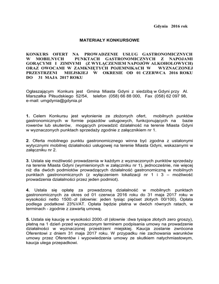 Gdynia 2016 rok MATERIAŁY KONKURSOWE KONKURS OFERT NA PROWADZENIE USŁUG GASTRONOMICZNYCH W MOBILNYCH PUNKTACH GASTRONOMICZNYCH Z NAPOJAMI GORĄCYMI I ZIMNYMI (Z WYŁĄCZENIEM NAPOJÓW ALKOHOLOWYCH) ORAZ OWOCAMI W ZAMKNIĘTYCH POJEMNIKACH W WYZNACZONEJ PRZESTRZENI MIEJSKIEJ W OKRESIE OD 01 CZERWCA 2016 ROKU DO 31 MAJA 2017 ROKU Ogłaszającym Konkurs jest Gmina Miasta Gdyni z siedzibą w Gdyni przy Al. Marszałka Piłsudskiego 52/54, telefon (058) 66 88 000, Fax (058) 62 097 98, e-mail: [email protected] mobilnych punktów 1. Celem Konkursu jest wyłonienie ze złożonych ofert, gastronomicznych w formie pojazdów usługowych, funkcjonujących na bazie rowerów lub skuterów, mogących prowadzić działalność na terenie Miasta Gdyni w wyznaczonych punktach sprzedaży zgodnie z załącznikiem nr 1. 2. Oferta mobilnego punktu gastronomicznego winna być zgodna z ustalonymi wytycznymi mobilnej działalności usługowej na terenie Miasta Gdyni, wskazanymi w załączniku nr 2. 3. Ustala się możliwość prowadzenia w każdym z wyznaczonych punktów sprzedaży na terenie Miasta Gdyni (wymienionych w załączniku nr 1), jednocześnie, nie więcej niż dla dwóch podmiotów prowadzących działalność gastronomiczną w mobilnych punktach gastronomicznych (z wyłączeniem lokalizacji nr 1 i 3 – możliwość prowadzenia działalności przez jeden podmiot). 4. Ustala się opłatę za prowadzoną działalność w mobilnych punktach gastronomicznych za okres od 01 czerwca 2016 roku do 31 maja 2017 roku w wysokości netto 1500.-zł (słownie: jeden tysiąc pięćset złotych 00/100). Opłata podlega podatkowi 23%VAT. Opłata będzie płatna w dwóch równych ratach, w terminach - zgodnie z zawartą umową. 5. Ustala się kaucję w wysokości 2000.-zł (słownie :dwa tysiące złotych zero groszy), płatną na 1 dzień przed wyznaczonym terminem podpisania umowy na prowadzenie działalności w wyznaczonej przestrzeni miejskiej. Kaucja zostanie zwrócona Oferentowi z dniem 31 maja 2017 roku. W przypadku nie zachowania warunków umowy przez Oferentów i wypowiedzenia umowy ze skutkiem natychmiastowym, kaucja ulega przepadkowi. 6. A. Oferenci składają oferty na wydruku w formie wizualizacji pojazdu wraz ze szczegółowym opisem, według załącznika nr 2, w języku polskim, umieszczone w zamkniętej kopercie z napisem: KONKURS OFERT NA PROWADZENIE USŁUG GASTRONOMICZNYCH W MOBILNYCH PUNKTACH GASTRONOMICZNYCH Z NAPOJAMI GORĄCYMI I ZIMNYMI (Z WYŁĄCZENIEM NAPOJÓW ALKOHOLOWYCH) ORAZ OWOCAMI W ZAMKNIĘTYCH POJEMNIKACH W WYZNACZONEJ PRZESTRZENI MIEJSKIEJ W OKRESIE OD 01 CZERWCA 2016 ROKU DO 31 MAJA 2017 ROKU w terminie do 23 maja 2016 roku do godziny 15.00, w Urzędzie Miasta Gdyni z siedzibą w Gdyni przy Al. Marszałka Piłsudskiego 52/54, pokój 426. B. Podpisana oferta powinna zawierać: - imię , nazwisko i adres oferenta (nazwę i siedzibę firmy, jeżeli oferent jest osobą prawną); -umocowanie do udziału w konkursie, jeżeli w imieniu oferenta występuje pełnomocnik; - datę sporządzenia oferty. C. Oferty winny być składane w terminie i miejscu określonym w ogłoszeniu o Konkursie. Oferty złożone po wyznaczonym terminie nie będą przyjmowane, bez względu na przyczynę opóźnienia. D. W momencie składania ofert, oferent lub osoba przez niego uprawniona oraz nadzorujący przebieg czynności pracownik Urzędu Miasta Gdyni podpiszą oświadczenie, potwierdzające dokonanie powyższej czynności wraz z dokładnym określeniem daty. 7. Złożone oferty nie podlegają zwrotowi. Składającemu ofertę nie przysługuje roszczenie o zwrot poniesionych kosztów na przygotowanie oferty. 8. Ustala się termin rozstrzygnięcia Konkursu na dzień 24 maja 2016 roku , na godzinę 11.00 (sala 101), w Urzędzie Miasta Gdyni z siedzibą przy Al.Marsz.Piłsudskiego 52/54. 9. Komisja Konkursowa odrzuca oferty jeżeli: - nie odpowiadają warunkom Konkursu; - zostały zgłoszone po wyznaczonym terminie; - nie zawierają parametrów wymienionych w załączniku nr 2. 10. Komisja w terminie nie dłuższym niż 7 dni od dnia przeprowadzenia i zakończenia Konkursu, zawiadomi wszystkich uczestników Konkursu o wynikach Konkursu. Załącznik nr 1 Lokalizacje mobilnych punktów gastronomicznych z napojami gorącymi i zimnymi (z wyłączeniem napojów alkoholowych) oraz owocami w zamkniętych pojemnikach w wyznaczonej przestrzeni miejskiej: 1.Orłowo- w pobliżu schronu (jedna lokalizacja) 2.Orłowo u zbiegu ulic Przebendowskich i Promenady Królowej Marysieńki 3.Orłowo od ul. Orłowskiej – Promenada Królowej Marysieńki (jedna lokalizacja) 4. w okolicach ul. Zawiszy Czarnego 5.Skwer Kościuszki – przy Pomniku Morświna 6.Skwer Kościuszki – przy Informacji Turystycznej 7.Skwer Kościuszki – ciąg pieszy w kierunku ul. Karola Borchardta /parking Hotelu Gdynia 8.ul.Dworcowa/Plac Konstytucji – przy SKM 9.ul.10 Lutego / ul. Władysława IV 10.Hala Targowa (ul. Wójta Radtkego/3-go Maja) 11.Al.Zwycięstwa – okolice Parku Naukowo-Technologicznego 12.ul.Górskiego – okolice Hali Widowiskowej 13.ul.Władysława IV – przy SKM 14. Bulwar Nadmorski 15.Park Kiloński 16.Kolibki – przy pomniku Orła Białego W przypadku lokalizacji pkt. 10, 11 i 12 Oferent zobowiązany jest do dokonania uzgodnień z zarządcą terenu. Wymienione wyżej lokalizacje przedstawione są na załącznikach graficznych. Załącznik nr 2 Wytyczne dotyczące wyglądu pojazdów - mobilnych punktów gastronomicznych z napojami ( z wyłączeniem napojów alkoholowych) oraz owocami w zamkniętych pojemnikach: Oferenci składają propozycje w formie wizualizacji szczegółowym opisem. pojazdu mobilnego wraz ze I. Pojazdy na bazie rowerów powinny spełniać następujące warunki: - wymiary maksymalne (po rozłożeniu): wysokość do 2,50m, szerokość do 1,50m, długość do 3,00m, - pojazdy powinny być wykonane z materiałów wysokiej jakości ( stal, drewno, dibond itp.) oraz wyprodukowane z wysoką dbałością o każdy detal k