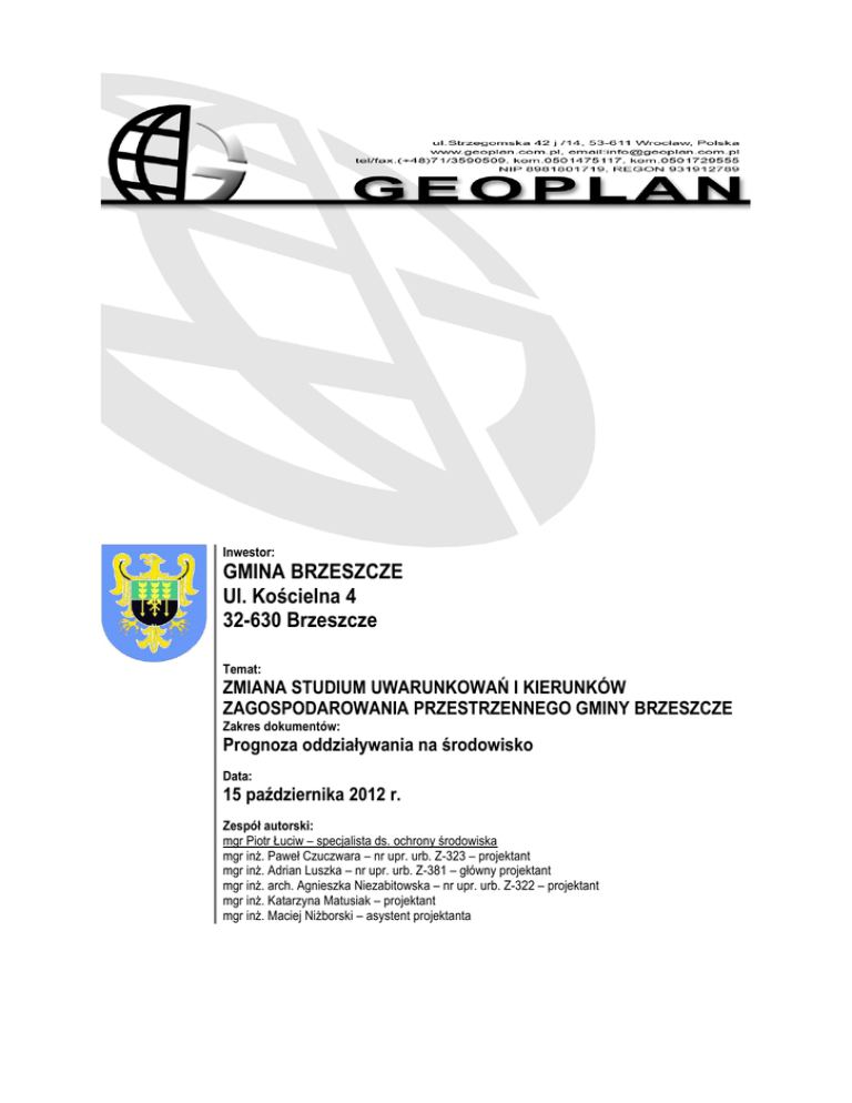 Inwestor: GMINA BRZESZCZE Ul. Kościelna 4 32-630 Brzeszcze Temat: ZMIANA STUDIUM UWARUNKOWAŃ I KIERUNKÓW ZAGOSPODAROWANIA PRZESTRZENNEGO GMINY BRZESZCZE Zakres dokumentów: Prognoza oddziaływania na środowisko Data: 15 października 2012 r. Zespół autorski: mgr Piotr Łuciw – specjalista ds. ochrony środowiska mgr inż. Paweł Czuczwara – nr upr. urb. Z-323 – projektant mgr inż. Adrian Luszka – nr upr. urb. Z-381 – główny projektant mgr inż. arch. Agnieszka Niezabitowska – nr upr. urb. Z-322 – projektant mgr inż. Katarzyna Matusiak – projektant mgr inż. Maciej Niżborski – asystent projektanta Prognoza oddziaływania na środowisko zmiany studium uwarunkowań i kierunków zagospodarowania przestrzennego gminy Brzeszcze. Spis treści 1. Cel i zakres prognozy ze wskazaniem powiązań z innymi dokumentami ................................................................3 2. Informacje o metodach zastosowanych przy sporządzaniu prognozy ....................................................................4 3. Analiza i ocena stanu środowiska z uwzględnieniem braku realizacji zmiany studium .........................................5 4. Rozwiązania mające na celu zapobieganie, ograniczanie lub kompensację przyrodniczą negatywnych oddziaływań na środowisko, mogących być rezultatem realizacji studium, w szczególności na cele i przedmiot obszaru Natura 2000 oraz integralność tego obszaru .............................................................................29 5. Rozwiązania alternatywne do rozwiązań zawartych w projekcie zmiany studium wraz z uzasadnieniem ich wyboru oraz opis metod dokonania oceny prowadzącej do tego wyboru, w tym także wskazania napotkanych trudności wynikających z niedostatków techniki lub luk we współczesnej wiedzy ...........................33 6. Informacje o możliwym transgranicznym oddziaływaniu na środowisko ..............................................................34 7. Informacje o przewidywanych metodach analizy realizacji postanowień studium oraz częstotliwości jej przeprowadzania ........................................................................................................................................................34 8. Streszczenie sporządzone w języku niespecjalistycznym.......................................................................................35 Strona | 2 Prognoza oddziaływania na środowisko zmiany studium uwarunkowań i kierunków zagospodarowania przestrzennego gminy Brzeszcze. 1. Cel i zakres prognozy ze wskazaniem powiązań z innymi dokumentami Prognozę oddziaływania na środowisko wykonano w celu oceny skutków wpływu na środowisko zmiany studium uwarunkowań i kierunków zagospodarowania przestrzennego Gminy Brzeszcze. Do sporządzenia zmiany projektowanego dokumentu przystąpiono na podstawie Uchwały Nr IX/71/11 Rady Miejskiej w Brzeszczach z dnia 21 czerwca 2011 roku w sprawie przystąpienia do sporządzenia zmiany studium uwarunkowań i kierunków zagospodarowania przestrzennego Gminy Brzeszcze oraz odnośnych przepisów ustawy z dnia 27 marca 2003 r. o planowaniu i zagospodarowaniu przestrzennym (Dz. U. z 2012 r. poz. 647). Projektowany dokument stanowi czwartą w kolejności zmianę studium – dokumentu opracowanego w roku 2003 i przyjętego Uchwałą Nr IX/90/2003 Rady Miejskiej w Brzeszczach z dnia 16 września 2003 r. w sprawie uchwalenia studium uwarunkowań i kierunków zagospodarowania przestrzennego Gminy Brzeszcze. Sporządzenie zmiany studium na celu wprowadzenie złoża kruszywa naturalnego "Rajsko 2" oraz umożliwienie na tym terenie eksploatacji. Obszar opracowania zlokalizowany jest w obrębie miejscowości Wilczkowice. Granicę obszaru objętego zmianą stanowią: od północy: granica gminy Brzeszcze, od zachodu: droga asfaltowa ul. Oświęcimska, od południa: droga gruntowa, od wschodu: pas terenu przy granicy zbiornika wodnego. Obszar objęty zmianą obejmuje powierzchnię ok. 26,6 ha. Granice terenów objętych sporządzeniem zmiany studium określa załącznik graficzny do uchwały (rysunek studium w skali 1:10 000). Wymóg wykonania prognozy oddziaływania na środowisko dokumentów takich jak studium, czy miejscowy plan zagospodarowania przestrzennego (lub ich zmiany) wynika z art. 51 ust. 1 ustawy z dnia 3 października 2008 r. o udostępnianiu informacji o środowisku i jego ochronie, udziale społeczeństwa w ochronie środowiska oraz o ocenach oddziaływania na środowisko (Dz. U. Nr 199, poz. 1227 ze zm.) zwanej dalej ustawą o udostępnianiu informacji. Zgodnie z art. 51 ust. 2 ustawy prognoza powinna zawierać: analizę oraz ocenę środowiska przyrodniczego ze wskazaniem istniejących problemów ochrony środowiska na obszarze opracowania, a także przewidywanych znaczących oddziaływań na środowisko, przedstawienie rozwiązań mających na celu zapobieganie, ograniczanie lub kompensację przyrodniczą negatywnych oddziaływań na obszar Natura 2000 a także na środowisko, mogących być rezultatem realizacji projektowanego dokumentu oraz rozwiązań alternatywnych do rozwiązań zawartych w projektowanym dokumencie (wraz z uzasadnieniem ich wyboru), opis metod dokonania oceny prowadzącej do tego wyboru, w tym także wskazania napotkanych trudności wynikających z niedostatków techniki lub luk we współczesnej wiedzy. W prognozie przedstawiono rozwiązania planistyczne oraz zidentyfikowano i oceniono przewidywane oddziaływania stanowiące skutki zmiany kierunków zagospodarowania przestrzennego na biotyczne i abiotyczne elementy środowiska oraz ludzi. Zmiana studium, a wraz z nią niniejsza prognoza powiązana jest ze studium uwarunkowań i kierunków zagospodarowania przestrzennego gminy Brzeszcze przyjętym w roku 2003 wraz ze zmianami, zwanym dalej studium. Dokument ten określa uwarunkowania i zasady zagospodarowania przestrzennego obszaru gminy. Strona | 3 Prognoza oddziaływania na środowisko zmia