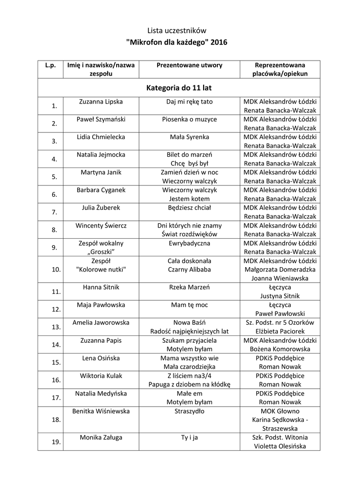 Lista uczestników "Mikrofon dla każdego" 2016 Kategoria do 11 lat