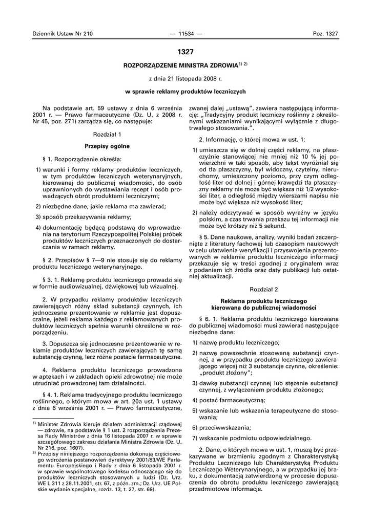 Dziennik Ustaw Nr 210 — 11534 — Poz. 1327 1327 ROZPORZÑDZENIE MINISTRA ZDROWIA1) 2) z dnia 21 listopada 2008 r. w sprawie reklamy produktów leczniczych Na podstawie art. 59 ustawy z dnia 6 wrzeÊnia 2001 r. — Prawo farmaceutyczne (Dz. U. z 2008 r. Nr 45, poz. 271) zarzàdza si´, co nast´puje: Rozdzia∏ 1 Przepisy ogólne § 1. Rozporzàdzenie okreÊla: 1) warunki i formy reklamy produktów leczniczych, w tym produktów leczniczych weterynaryjnych, kierowanej do publicznej wiadomoÊci, do osób uprawnionych do wystawiania recept i osób prowadzàcych obrót produktami leczniczymi; 2) niezb´dne dane, jakie reklama ma zawieraç; 3) sposób przekazywania reklamy; 4) dokumentacj´ b´dàcà podstawà do wprowadzenia na terytorium Rzeczypospolitej Polskiej próbek produktów leczniczych przeznaczonych do dostarczania w ramach reklamy. § 2. Przepisów § 7—9 nie stosuje si´ do reklamy produktu leczniczego weterynaryjnego. § 3. 1. Reklam´ produktu leczniczego prowadzi si´ w formie audiowizualnej, dêwi´kowej lub wizualnej. 2. W przypadku reklamy produktów leczniczych zawierajàcych ró˝ny sk∏ad substancji czynnych, ich jednoczesne prezentowanie w reklamie jest dopuszczalne, je˝eli reklama ka˝dego z reklamowanych produktów leczniczych spe∏nia warunki okreÊlone w rozporzàdzeniu. 3. Dopuszcza si´ jednoczesne prezentowanie w reklamie produktów leczniczych zawierajàcych t´ samà substancj´ czynnà, lecz ró˝ne postacie farmaceutyczne. 4. Reklama produktu leczniczego prowadzona w aptekach i w zak∏adach opieki zdrowotnej nie mo˝e utrudniaç prowadzonej tam dzia∏alnoÊci. § 4. 1. Reklama tradycyjnego produktu leczniczego roÊlinnego, o którym mowa w art. 20a ust. 1 ustawy z dnia 6 wrzeÊnia 2001 r. — Prawo farmaceutyczne, ——————— 1) 2) Minister Zdrowia kieruje dzia∏em administracji rzàdowej — zdrowie, na podstawie § 1 ust. 2 rozporzàdzenia Prezesa Rady Ministrów z dnia 16 listopada 2007 r. w sprawie szczegó∏owego zakresu dzia∏ania Ministra Zdrowia (Dz. U. Nr 216, poz. 1607). Przepisy niniejszego rozporzàdzenia dokonujà cz´Êciowego wdro˝enia postanowieƒ dyrektywy 2001/83/WE Parlamentu Europejskiego i Rady z dnia 6 listopada 2001 r. w sprawie wspólnotowego kodeksu odnoszàcego si´ do produktów leczniczych stosowanych u ludzi (Dz. Urz. WE L 311 z 28.11.2001, str. 67, z póên. zm.; Dz. Urz. UE Polskie wydanie specjalne, rozdz. 13, t. 27, str. 69). zwanej dalej „ustawà”, zawiera nast´pujàcà informacj´: „Tradycyjny produkt leczniczy roÊlinny z okreÊlonymi wskazaniami wynikajàcymi wy∏àcznie z d∏ugotrwa∏ego stosowania.”. 2. Informacj´, o której mowa w ust. 1: 1) umieszcza si´ w dolnej cz´Êci reklamy, na p∏aszczyênie stanowiàcej nie mniej ni˝ 10 % jej powierzchni w taki sposób, aby tekst wyró˝nia∏ si´ od t∏a p∏aszczyzny, by∏ widoczny, czytelny, nieruchomy, umieszczony poziomo, przy czym odleg∏oÊç liter od dolnej i górnej kraw´dzi t∏a p∏aszczyzny reklamy nie mo˝e byç wi´ksza ni˝ 1/2 wysokoÊci liter, a odleg∏oÊç mi´dzy wierszami napisu nie mo˝e byç wi´ksza ni˝ wysokoÊç liter; 2) nale˝y odczytywaç w sposób wyraêny w j´zyku polskim, a czas trwania przekazu tej informacji nie mo˝e byç krótszy ni˝ 5 sekund. § 5. Dane naukowe, analizy, wyniki badaƒ zaczerpni´te z literatury fachowej lub czasopism naukowych w celu u∏atwienia weryfikacji i przyswojenia prezentowanych w reklamie produktu leczniczego informacji przekazuje si´ w treÊci zgodnej z orygina∏em wraz z podaniem ich êród∏a oraz daty publikacji lub ostatniej aktualizacji. Rozdzia∏ 2 Reklama produktu leczniczego kierowana do publicznej wiadomoÊci § 6. 1. Reklama produktu leczniczego kierowana do publicznej wiadomoÊci musi zawieraç nast´pujàce niezb´dne dane: 1) nazw´ produktu leczniczego; 2) nazw´ powszechnie stosowanà substancji czynnej, a w przypadku produktu leczniczego zawierajàcego wi´cej ni˝ 3 substancje czynne, okreÊlenie: „produkt z∏o˝ony”; 3) dawk´ substancji czynnej lub st´˝enie substancji czynnej, z wy∏àczeniem produktu z∏o˝onego; 4) postaç farmaceutycznà; 5) wskazanie lub wskazania terapeutyczne do stosowania; 6) przeciwwskazania; 7) wskazanie podmiotu odpowiedzialnego. 2. Dane, o których mowa w ust. 1, muszà byç przekazywane w brzmieniu zgodnym z Charakterystykà Produktu Leczniczego lub Charakterystykà Produktu Leczniczego Weterynaryjnego, a w przypadku jej braku, z dokumentacjà zatwierdzonà w procesie dopuszczenia do obrotu produktu leczniczego zawierajàcà przedmiotowe informacje. Dziennik Ustaw Nr 210 — 11535 — 3. Dane, o których mowa w ust. 1, przedstawia si´ w formie: 1) audiowizualnej i wizualnej w sposób widoczny i czytelny; 2) dêwi´kowej w sposób wyraêny. § 7. 1. Reklama produktu leczniczego kierowana do publicznej wiadomoÊci w formie audiowizualnej, poza danymi okreÊlonymi w § 6 ust. 1, zawiera ostrze˝enie o nast´pujàcej treÊci: „Przed u˝yciem zapoznaj si´ z treÊcià ulotki do∏àczonej do opakowania bàdê skonsultuj si´ z lekarzem lub farmaceutà, gdy˝ ka˝dy lek niew∏aÊciwie stosowany zagra˝a Twojemu ˝yciu lub zdrowiu.”. 2. Ostrze˝enie, o którym mowa w ust. 1: 1) umieszcza si´ w dolnej cz´Êci reklamy, na p∏aszczyênie stanowiàcej nie mniej ni˝ 20 % jej powierzchni; 2) umieszcza si´ w taki sposób, aby tekst wyró˝nia∏ si´ od t∏a p∏aszczyzny, by∏ widoczny, czytelny, nieruchomy, umieszczony poziomo, przy czym odleg∏oÊç liter od dolnej i górnej kraw´dzi t∏a p∏aszczyzny reklamy nie mo˝e byç wi´ksza ni˝ 1/2 wysokoÊci liter, a odleg∏oÊç mi´dzy wierszami napisu nie mo˝e byç wi´ksza ni˝ wysokoÊç liter; 3) musi byç odczytane w sposób wyraêny w j´zyku polskim i ukazywaç si´ na ekranie nie krócej ni˝ 8 sekund. § 8. 1. Reklama produktu leczniczego kierowana do publicznej wiadomoÊci w formie dêwi´kowej, poza danymi okreÊlonymi w § 6 ust. 1, zawiera