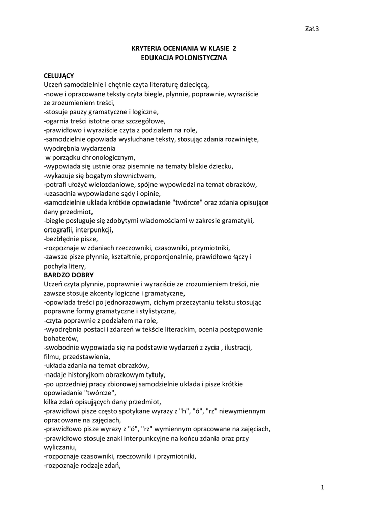 KRYTERIA OCENIANIA W KLASIE 2 EDUKACJA POLONISTYCZNA