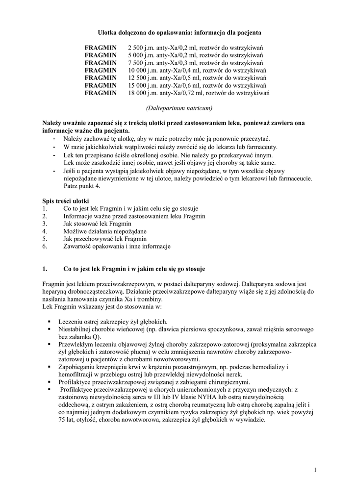 Ulotka dołączona do opakowania: informacja dla pacjenta FRAGMIN FRAGMIN FRAGMIN FRAGMIN FRAGMIN FRAGMIN FRAGMIN 2 500 j.m. anty-Xa/0,2 ml, roztwór do wstrzykiwań 5 000 j.m. anty-Xa/0,2 ml, roztwór do wstrzykiwań 7 500 j.m. anty-Xa/0,3 ml, roztwór do wstrzykiwań 10 000 j.m. anty-Xa/0,4 ml, roztwór do wstrzykiwań 12 500 j.m. anty-Xa/0,5 ml, roztwór do wstrzykiwań 15 000 j.m. anty-Xa/0,6 ml, roztwór do wstrzykiwań 18 000 j.m. anty-Xa/0,72 ml, roztwór do wstrzykiwań (Dalteparinum natricum) Należy uważnie zapoznać się z treścią ulotki przed zastosowaniem leku, ponieważ zawiera ona informacje ważne dla pacjenta. - Należy zachować tę ulotkę, aby w razie potrzeby móc ją ponownie przeczytać. - W razie jakichkolwiek wątpliwości należy zwrócić się do lekarza lub farmaceuty. - Lek ten przepisano ściśle określonej osobie. Nie należy go przekazywać innym. Lek może zaszkodzić innej osobie, nawet jeśli objawy jej choroby są takie same. - Jeśli u pacjenta wystąpią jakiekolwiek objawy niepożądane, w tym wszelkie objawy niepożądane niewymienione w tej ulotce, należy powiedzieć o tym lekarzowi lub farmaceucie. Patrz punkt 4. Spis treści ulotki 1. Co to jest lek Fragmin i w jakim celu się go stosuje 2. Informacje ważne przed zastosowaniem leku Fragmin 3. Jak stosować lek Fragmin 4. Możliwe działania niepożądane 5. Jak przechowywać lek Fragmin 6. Zawartość opakowania i inne informacje 1. Co to jest lek Fragmin i w jakim celu się go stosuje Fragmin jest lekiem przeciwzakrzepowym, w postaci dalteparyny sodowej. Dalteparyna sodowa jest heparyną drobnocząsteczkową. Działanie przeciwzakrzepowe dalteparyny wiąże się z jej zdolnością do nasilania hamowania czynnika Xa i trombiny. Lek Fragmin wskazany jest do stosowania w: Leczeniu ostrej zakrzepicy żył głębokich. Niestabilnej chorobie wieńcowej (np. dławica piersiowa spoczynkowa, zawał mięśnia sercowego bez załamka Q). Przewlekłym leczeniu objawowej żylnej choroby zakrzepowo-zatorowej (proksymalna zakrzepica żył głębokich i zatorowość płucna) w celu zmniejszenia nawrotów choroby zakrzepowozatorowej u pacjentów z chorobami nowotworowymi. Zapobieganiu krzepnięciu krwi w krążeniu pozaustrojowym, np. podczas hemodializy i hemofiltracji w przebiegu ostrej lub przewlekłej niewydolności nerek. Profilaktyce przeciwzakrzepowej związanej z zabiegami chirurgicznymi. Profilaktyce przeciwzakrzepowej u chorych unieruchomionych z przyczyn medycznych: z zastoinową niewydolnością serca w III lub IV klasie NYHA lub ostrą niewydolnością oddechową, z ostrym zakażeniem, z ostrą chorobą reumatyczną lub ostrą chorobą zapalną jelit i co najmniej jednym dodatkowym czynnikiem ryzyka zakrzepicy żył głębokich np. wiek powyżej 75 lat, otyłość, choroba nowotworowa, zakrzepica żył głębokich w wywiadzie. 1 2. Informacje ważne przed zastosowaniem leku Fragmin Kiedy nie stosować leku Fragmin: • jeśli pacjent ma uczulenie na dalteparynę sodową lub inną heparynę drobnocząsteczkową, lub heparynę niefrakcjonowaną, lub którykolwiek z pozostałych składników tego leku (wymienione w punkcie 6); • potwierdzona lub podejrzewana małopłytkowość poheparynowa na tle immunologicznym; • czynne krwawienie np. z przewodu pokarmowego lub naczyń mózgu; • zaburzenia krzepnięcia o ciężkim przebiegu; • ostre lub podostre bakteryjne zapalenie wsierdzia; • niedawno przebyte urazy lub zabiegi chirurgiczne w obrębie ośrodkowego układu nerwowego, oczu i (lub) uszu. Ze względu na zwiększone ryzyko krwawienia, dużych dawek dalteparyny sodowej (stosowanych na przykład w leczeniu ostrej zakrzepicy żył głębokich, zatorowości płucnej i niestabilnej choroby wieńcowej) nie wolno stosować u pacjentów, u których zostanie wykonane znieczulenie podpajęczynówkowe lub zewnątrzoponowe, lub inne zabiegi powodujące konieczność wykonania nakłucia lędźwiowego. Ostrzeżenia i środki ostrożności • U pacjentów przed znieczuleniem rdzeniowym (zewnątrzoponowym lub podpajęczynówkowym) lub nakłuciem lędźwiowym. Pacjenci otrzymujący takie leki przeciwzakrzepowe jak heparyny drobnocząsteczkowe lub heparynoidy, w celu zapobiegania powikłaniom zakrzepowo-zatorowym, są zagrożeni powstaniem krwiaka nadoponowego lub podpajęczynówkowego, który może spowodować długotrwałe lub trwałe porażenie. Ryzyko takich powikłań zwiększa się w przypadku wprowadzania na stałe cewnika do przestrzeni zewnątrzoponowej w celu podawania leków znieczulających oraz w razie równoczesnego stosowania leków wpływających na hemostazę, takich jak niesteroidowe leki przeciwzapalne, leki hamujące czynność płytek i inne leki przeciwzakrzepowe. Wydaje się, że traumatyzujące lub powtarzane nakłucie zewnątrzoponowe, lub lędźwiowe również zwiększa to ryzyko. Pacjentów takich należy obserwować, często sprawdzając ich stan biorąc pod uwagę objawy przedmiotowe i podmiotowe świadczące o zmianach neurologicznych. U pacjentów z: małopłytkowością, zaburzeniami czynności płytek, ciężką niewydolnością wątroby lub nerek, nieleczonym lub niereagującym na leczenie nadciśnieniem tętniczym lub retinopatią nadciśnieniową lub cukrzycową. Duże dawki dalteparyny sodowej, takie jak dawki konieczne w przypadku leczenia zakrzepicy żył głębokich, zatorowości płucnej lub niestabilnej choroby wieńcowej należy stosować ostrożnie u pacjentów, którzy niedawno przebyli zabieg chirurgiczny lub inne choroby mogące zwiększać ryzyko wystąpienia krwotoku. • U pacjentów w ramach profilaktyki zakrzepicy, wprowadzanie lub usuwanie cewnika do przestrzeni zewnątrzoponowej lub do rdzenia kręgowego należy wykonać po 10–12 godzinach od podania dawki dalteparyny. W przypadku pacjentów przyjmujących większe dawki leku Fragmin (np. 100-120 j.m./kg mc. co 12 godzin lub 200 j.m./kg mc. raz na dobę) odstęp czasu powinien wynosić co najmniej 