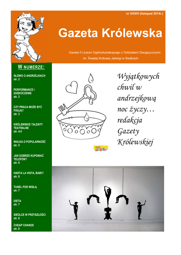 nr XXXIV (listopad 2014r.) Gazeta Królewska Gazeta II Liceum Ogólnokształcącego z Oddziałami Dwujęzycznymi im. Świętej Królowej Jadwigi w Siedlcach W NUMERZE : SŁOWO O ANDRZEJKACH str. 2 PERFORMANCE i ZASKOCZENIE str. 3 CZY PRACA MOŻE BYĆ PASJĄ? str. 3 KRÓLEWSKIE TALENTY TEATRALNE str. 4-5 WALKA O POPULARNOŚĆ str. 5 JAK DOBRZE KUPOWAĆ TELEFON? str. 6 HASTA LA VISTA, BABY! str. 6 TUNEL POD WISŁĄ str. 7 DIETA str. 7 SIEDLCE W PRZYSZŁOŚCI str. 8 CHEAP CHANGE str. 8 Wyjątkowych chwil w andrzejkową noc życzy… redakcja Gazety Królewskiej Gazeta Królewska nr XXXIV SŁÓW KILKA O ANDRZEJKACH - KAROLINA STEFANIUK Andrzejki obchodzone są w nocy z 29 na 30 listopada i są ściśle związane z imieninami Andzeja-30 listopada. Imię to pochodzi z języka greckiego-oznacza prawdziwego mężczyznę. Istnieje teoria, że to właśnie z tego kraju pochodzi andrzejkowy zwyczaj. Obrzędy andrzejkowe znane są głównie z XII w., jednak istnieją dowody, że tradycja ta jest jeszcze starsza. Andrzejki od kilku stuleci popularne były w Niemczech, Szwajcarii, na Słowacji, w Czechach, Rosji, na Ukrainie i Białorusi, w Rumunii, na Węgrzech i Litwie, w krajach śródziemnomorskich, a także na wyspach greckich. W Polsce obrzęd ten, a właściwie wzmianka o nim w literaturze, pochodzi z XVI w. Dawniej w Polsce podczas andrzejek oczywiście wróżono, jednak robiły to wyłącznie niezamężne dziewczęta. Ciekawe były swego przyszłego małżonka oraz tego kiedy znajdą swą miłość. Wierzono, że tej nocy magiczne drzwi tajemnicy się otwierają i uchylają rąbka tajemnicy dotyczącej przyszłej miłości. Początkowo dziewczęta wróżyły samotnie, aby nikt prócz nikt nie znał ich przyszłych losów. Oto kilka dość specyficznych i szalenie interesujących ówczesnych zwyczajów: - ciekawskie kobiety cały dzień nic nie jadły, aby wraz ze zmierzchem pomodlić się do świętego Andrzeja, aby ten za ich gorliwość ukazał im obraz przyszłego mężczyzny - zrywanie w święto Andrzeja gałązki wiśni bądź czereśni, jeśli gałąź zakwitała w Boże Narodzenie, oznaczało to szybkie nadejście miłości - wysiewanie w ziemi ziarna lnu lub konopi, które grabione było męskimi spodniami, jeśli ziarno wzrosło wiadomo było, że niedługo pojawi się też ukochany. Możemy sobie tylko wyobrazić jaka wielka rozpacz, płacz i zgrzytanie zębów towarzyszyło paniom jeśli wróżby się nie sprawdziły. Z czasem jednak zwyczaje się zmieniły-panie więc odprawiały wróżby wspólnie! - losowanie przedmiotów o symbolicznym znaczeniu (Uwaga! Najbardziej niechciany przedmiot do wylosowania: różaniec=staropanieństwo) - ustawianie butów dziewcząt od ściany do progu-but który jako pierwszy dotrze do progu wyznaczał tę, która jako pierwsza wyjdzie za mąż - lanie wosku przez klucz do wody, aby następnie odczytać informacje o ukochanym (do jakiego zwierzęcia jest podobny, czy dobrze zbudowany, a może jednak chucherko?) - dziewczęta ustawiały się w kole i wpuszczały do środka gąsiora. Ta, którą gąsior skubnął jako pierwsza miała wyjść za mąż - rzucanie psu jedzenia, czyli tej, której kawałek został zjedzony najpierw, wiadomo - jako pierwsza miała mieć męża. Obecnie zwyczaje andrzejkowe nie są odprawiane już tak często jak kiedyś. Mają też nieco inną formę: wróży się oczywiście z wosku czy ustawiania butów, lecz nikt już raczej nie bierze tych wróżb całkowicie poważnie. Chyba,że są to dzieci, a Asia cieszy się, że wylosowała imię Patrysia jako miłości swego życia. Często zamiast wróżb udajemy się w ten dzień na imprezy czy bale. Może dziewczyny w naszej szkole chcą wskrzesić zwyczaj związany z dzióbaniem gąsiora? STRONA 2 Gazeta Królewska nr XXXIV PERFORMANCE i ZASKOCZENIE - EMILIA OLĘDZKA Pojęcie performance, przypuszczam, że nie jest wszystkim dobrze znane, chociaż we współczesnym świecie sztuki jest zjawiskiem bardzo powszechnym. W związku z tym , przynajmniej trochę chciałabym wprowadzić Was w temat, który bez wątpienia budzi wiele kontrowersji. Zatem performance nie jest to teatr, pokaz poezji śpiewanej ani koncert. Nie jest to też malarstwo, rzeźba, happening czy body art. Performance określić jest szalenie trudno. Według definicji sztuka ta jest określana jako sytuacja liryczna, w której zarówno przedmiotem, jak i podmiotem okazuje się być ciało performera w określonym kontekście czasu, przestrzeni i własnych ograniczeń. Tak naprawdę do wykonania performance może posłużyć każde pojęcie, obiekt, przedmiot, nawet wskazany przez artystę w momencie wystąpienia. Performance jest sztuką żywą, podczas której artysta ma www.davidkocol.com bezpośredni kontakt z publicznością, cechuje ją spontaniczność, a przede wszystkim emocjonalność i autentyzm przeżyć. Artyści w swoich wystąpieniach mają na celu zaskoczyć i zmusić publiczność do refleksji. Gdybyśmy mieli oglądać wydarzenie artystyczne tego typu nie bylibyśmy w stanie przewidzieć co za chwilę może się stać a co nie może. Warto tutaj wspomnieć o wyjątkowej artystce jaką jest Marina Abramović, której twórczość jest mocno powiązana z jej doświadczeniem życiowym i z sytuacją XX wieku. Podstawowym przedmiotem i tematem prac Mariny jest jej ciało. Rożne są opinie na temat jej działalności, niektórzy co do niej mają mieszane uczucia dla innych znów jest czymś fascynującym. Na tym polega cała sztuka performance, ma jednocześnie zachwycać, niepokoić oraz wnosić powiew świeżości na rodzimą scenę artystyczną. Podsumowując, jeśli myślicie, że sztuka nie jest w stanie Was niczym zaskoczyć, możecie liczyć na artystów performance. CZY PRACA MOŻE BYĆ PASJĄ? - KLAUDIA KOZAK W dzisiejszych czasach rzadko spotyka się osoby, które pracują z pasji. Większość z nas pracuje tam gdzie znajdzie prace, gdyż w dzisiejszych czasach ciężko o jaką kol wiek