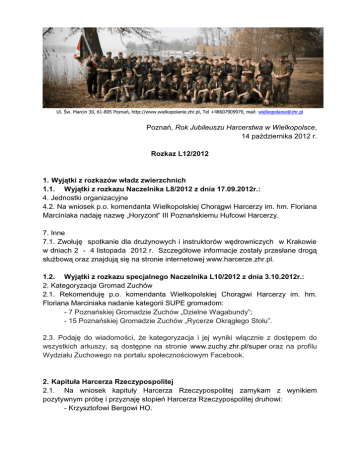 Ul. Św. Marcin 30, 61-805 Poznań, http://www.wielkopolanie.zhr.pl, Tel +48607909979, mail: [email protected] Poznań, Rok Jubileuszu Harcerstwa w Wielkopolsce, 14 października 2012 r. Rozkaz L12/2012 1. Wyjątki z rozkazów władz zwierzchnich 1.1. Wyjątki z rozkazu Naczelnika L8/2012 z dnia 17.09.2012r.: 4. Jednostki organizacyjne 4.2. Na wniosek p.o. komendanta Wielkopolskiej Chorągwi Harcerzy im. hm. Floriana Marciniaka nadaję nazwę „Horyzont” III Poznańskiemu Hufcowi Harcerzy. 7. Inne 7.1. Zwołuję spotkanie dla drużynowych i instruktorów wędrowniczych w Krakowie w dniach 2 - 4 listopada 2012 r. Szczegółowe informacje zostały przesłane drogą służbową oraz znajdują się na stronie internetowej www.harcerze.zhr.pl. 1.2. Wyjątki z rozkazu specjalnego Naczelnika L10/2012 z dnia 3.10.2012r.: 2. Kategoryzacja Gromad Zuchów 2.1. Rekomenduję p.o. komendanta Wielkopolskiej Chorągwi Harcerzy im. hm. Floriana Marciniaka nadanie kategorii SUPE gromadom: - 7 Poznańskiej Gromadzie Zuchów „Dzielne Wagabundy”; - 15 Poznańskiej Gromadzie Zuchów „Rycerze Okrągłego Stołu”. 2.3. Podaję do wiadomości, że kategoryzacja i jej wyniki włącznie z dostępem do wszystkich arkuszy, są dostępne na stronie www.zuchy.zhr.pl/super oraz na profilu Wydziału Zuchowego na portalu społecznościowym Facebook. 2. Kapituła Harcerza Rzeczypospolitej 2.1. Na wniosek kapituły Harcerza Rzeczypospolitej zamykam z wynikiem pozytywnym próbę i przyznaję stopień Harcerza Rzeczypospolitej druhowi: - Krzysztofowi Bergowi HO. 2.2. Informuję, iż skład kapituły w nowym roku harcerskim pozostaje bez zmian, niemniej wszyscy chętni, posiadający stopień Harcerza Rzeczypospolitej, mogą włączyć się w prace kapituły i są tam mile widziani. 2.3. Najbliższe spotkania kapituły odbędą się 13 XI oraz 11 XII, pozostałe terminy dostępne są do wglądu na stronie internetowej chorągwi, w podstronie kapituły. 3. Komisja Instruktorska 3.1. Na wniosek Komisji Instruktorskiej Wielkopolskiej Chorągwi Harcerzy otwieram próbę na stopień przewodnika druhom: - Jakubowi Baszczukowi ćw. – opiekun pwd. Krzysztof Skorupski HO; - Michałowi Rokicie ćw. – opiekun phm. Michał Szmaj HR; - Tomaszowi Sosińskiemu HO – opiekun pwd. Krzysztof Skorupski HO. 3.2. Najbliższe spotkania Komisji Instruktorskiej odbędą się 25 X oraz 8 XI, pozostałe terminy dostępne są do wglądu na stronie internetowej chorągwi, w podstronie komisji. 4. Kategoryzacja gromad zuchów 4.1. Nadaję kategorię SUPE gromadom: - 7 Poznańskiej Gromadzie Zuchów „Dzielne Wagabundy”; - 15 Poznańskiej Gromadzie Zuchów „Rycerze Okrągłego Stołu”. 5. Jednostki organizacyjne 5.1. Na wniosek instruktorów Poznańskiego Szczepu Harcerskiego „Knieja” mianuję na funkcję szczepowego druha: - pwd. Marcina Dybowskiego HO. 5.2. Zwalniam z funkcji drużynowego 8 Poznańskiej Drużyny Harcerzy „Jar” im. gen. Stefana „Grota” Roweckiego druha: - phm. Mateusza Mayera HR. 6. Inne 6.1. Proszę instruktorów aby od bieżącego miesiąca wpłacali należność za swoje składki na konto chorągwi. Stosowne instrukcje znajdują się na stronie internetowej chorągwi oraz zostały przesłane drogą mejlową. 6.2. Przypominam o obchodach Stulecia Harcerstwa w Wielkopolsce, które rozpoczną się w sobotę 27 października mszą św. o godz. 16 w kościele oo. Karmelitów Bosych na Wzgórzu św. Wojciecha. 6.3. Przypominam również o zgłaszaniu się na wyprawę instruktorów naszej chorągwi – Łódź 2013, wszystkie informacje zostały przesłane drogą mejlową, jak również znajdują się na stronie internetowej. Czuwaj! p.o. Komendant Wielkopolskiej Chorągwi Harcerzy (-) phm. Tomasz Ceranek HR
