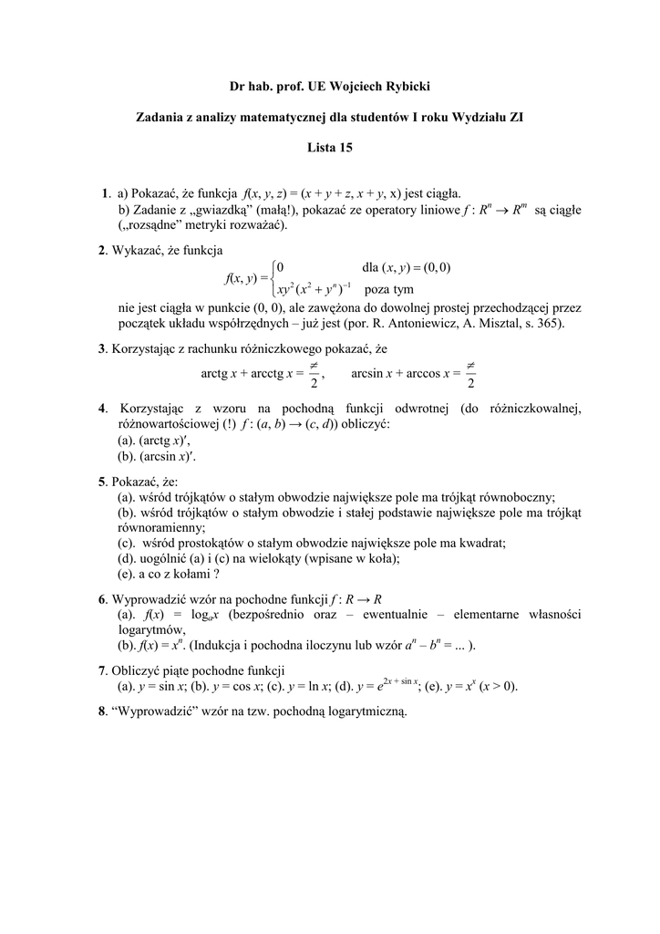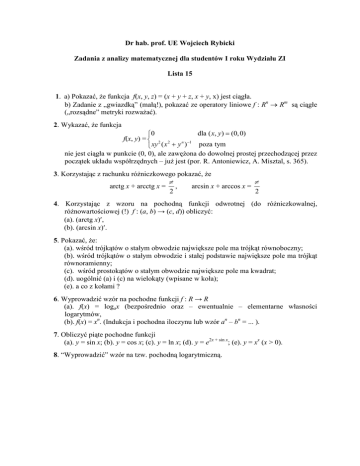 Dr hab. prof. UE Wojciech Rybicki Zadania z analizy matematycznej dla studentów I roku Wydziału ZI Lista 15 1. a) Pokazać, Ŝe funkcja f(x, y, z) = (x + y + z, x + y, x) jest ciągła. b) Zadanie z „gwiazdką” (małą!), pokazać ze operatory liniowe f : Rn → Rm są ciągłe („rozsądne” metryki rozwaŜać). 2. Wykazać, Ŝe funkcja dla ( x, y ) = (0, 0) 0 f(x, y) = 2 2 n −1 poza tym xy ( x + y ) nie jest ciągła w punkcie (0, 0), ale zawęŜona do dowolnej prostej przechodzącej przez początek układu współrzędnych – juŜ jest (por. R. Antoniewicz, A. Misztal, s. 365). 3. Korzystając z rachunku róŜniczkowego pokazać, Ŝe arctg x + arcctg x = π 2 , arcsin x + arccos x = π 2 4. Korzystając z wzoru na pochodną funkcji odwrotnej (do róŜniczkowalnej, róŜnowartościowej (!) f : (a, b) → (c, d)) obliczyć: (a). (arctg x)′, (b). (arcsin x)′. 5. Pokazać, Ŝe: (a). wśród trójkątów o stałym obwodzie największe pole ma trójkąt równoboczny; (b). wśród trójkątów o stałym obwodzie i stałej podstawie największe pole ma trójkąt równoramienny; (c). wśród prostokątów o stałym obwodzie największe pole ma kwadrat; (d). uogólnić (a) i (c) na wielokąty (wpisane w koła); (e). a co z kołami ? 6. Wyprowadzić wzór na pochodne funkcji f : R → R (a). f(x) = logax (bezpośrednio oraz – ewentualnie – elementarne własności logarytmów, (b). f(x) = xn. (Indukcja i pochodna iloczynu lub wzór an – bn = ... ). 7. Obliczyć piąte pochodne funkcji (a). y = sin x; (b). y = cos x; (c). y = ln x; (d). y = e2x + sin x; (e). y = xx (x > 0). 8. “Wyprowadzić” wzór na tzw. pochodną logarytmiczną.