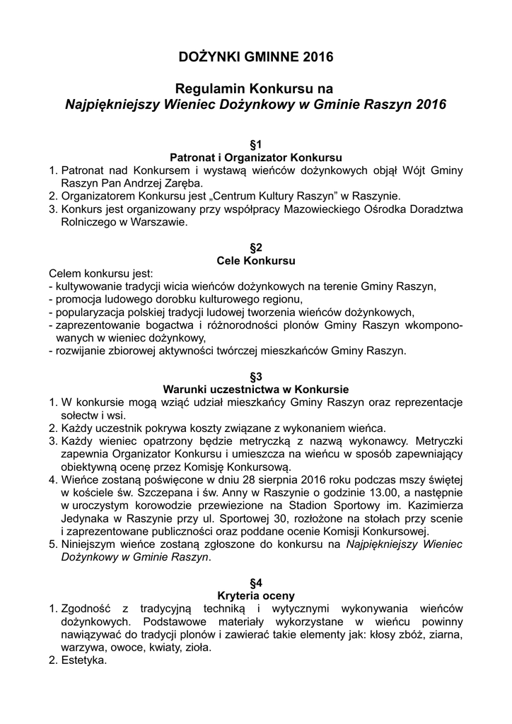 DOŻYNKI GMINNE 2016 Regulamin Konkursu na Najpiękniejszy Wieniec Dożynkowy w Gminie Raszyn 2016 §1 Patronat i Organizator Konkursu 1. Patronat nad Konkursem i wystawą wieńców dożynkowych objął Wójt Gminy Raszyn Pan Andrzej Zaręba. 2. Organizatorem Konkursu jest „Centrum Kultury Raszyn” w Raszynie. 3. Konkurs jest organizowany przy współpracy Mazowieckiego Ośrodka Doradztwa Rolniczego w Warszawie. §2 Cele Konkursu Celem konkursu jest: - kultywowanie tradycji wicia wieńców dożynkowych na terenie Gminy Raszyn, - promocja ludowego dorobku kulturowego regionu, - popularyzacja polskiej tradycji ludowej tworzenia wieńców dożynkowych, - zaprezentowanie bogactwa i różnorodności plonów Gminy Raszyn wkomponowanych w wieniec dożynkowy, - rozwijanie zbiorowej aktywności twórczej mieszkańców Gminy Raszyn. §3 Warunki uczestnictwa w Konkursie 1. W konkursie mogą wziąć udział mieszkańcy Gminy Raszyn oraz reprezentacje sołectw i wsi. 2. Każdy uczestnik pokrywa koszty związane z wykonaniem wieńca. 3. Każdy wieniec opatrzony będzie metryczką z nazwą wykonawcy. Metryczki zapewnia Organizator Konkursu i umieszcza na wieńcu w sposób zapewniający obiektywną ocenę przez Komisję Konkursową. 4. Wieńce zostaną poświęcone w dniu 28 sierpnia 2016 roku podczas mszy świętej w kościele św. Szczepana i św. Anny w Raszynie o godzinie 13.00, a następnie w uroczystym korowodzie przewiezione na Stadion Sportowy im. Kazimierza Jedynaka w Raszynie przy ul. Sportowej 30, rozłożone na stołach przy scenie i zaprezentowane publiczności oraz poddane ocenie Komisji Konkursowej. 5. Niniejszym wieńce zostaną zgłoszone do konkursu na Najpiękniejszy Wieniec Dożynkowy w Gminie Raszyn. §4 Kryteria oceny 1. Zgodność z tradycyjną techniką i wytycznymi wykonywania wieńców dożynkowych. Podstawowe materiały wykorzystane w wieńcu powinny nawiązywać do tradycji plonów i zawierać takie elementy jak: kłosy zbóż, ziarna, warzywa, owoce, kwiaty, zioła. 2. Estetyka. 3. Koncepcja i zamysł artystyczny. 4. Kompozycja (pod względem plastycznym) i techniczna strona wykonania, staranność, dokładność, dobór materiałów. 5. Wrażenie ogólne. §5 Komisja Konkursowa 1. O wyłonieniu zwycięzców Konkursu decyduje Komisja Konkursowa powołana przez Organizatora. 2. Konkurs jest jednoetapowy. 3. Każdy członek Komisji dokona oceny mając do dyspozycji skalę punktową od 1 do 5 (im wyższa ocena, tym większa ilość punktów). 4. W przypadku gdy wśród najwyżej ocenionych wieńców poszczególne prace uzyskają tę samą ilość punktów, przewodniczący Komisji może przeprowadzić dodatkowe głosowanie, aby członkowie Komisji wyłonili laureatów I, II i III miejsca. 5. W Konkursie może zostać przyznana nagroda publiczności oraz wyróżnienia. 6. Członkowie Komisji nie mogą być uczestnikami Konkursu. 7. W sytuacjach spornych wszelkie wątpliwości rozstrzyga przewodniczący Komisji. 8. Decyzja Komisji jest ostateczna i nie przysługuje od niej odwołanie. §6 Ogłoszenie wyników Konkursu i nagrody 1. Rozstrzygnięcie Konkursu nastąpi w dniu 28 sierpnia 2016 roku podczas trwania Dożynek Gminnych na Stadionie Sportowym im. Kazimierza Jedynaka w Raszynie przy ul. Sportowej 30. 2. Laureaci Konkursu otrzymają dyplomy oraz pamiątkowe puchary. 3. Sprawy nieuregulowane niniejszym Regulaminem rozstrzyga Organizator Konkursu. §7 Postanowienia końcowe 1. Niniejszy Regulamin dostępny jest w siedzibie „Centrum Kultury Raszyn” oraz na stronie internetowej: www.ckr.raszyn.pl. 2. Sytuacje nieobjęte niniejszym regulaminem rozstrzyga Organizator Konkursu. 3. Organizator zastrzega, że nie ponosi odpowiedzialności za zdarzenia uniemożliwiające prawidłowe przeprowadzenie Konkursu, których nie był w stanie przewidzieć, lub którym nie mógł zapobiec przy dołożeniu należnej staranności. W razie pytań prosimy o kontakt: Centrum Kultury Raszyn Al. Krakowska 29A 05-090 Raszyn tel. 22 720 06 53