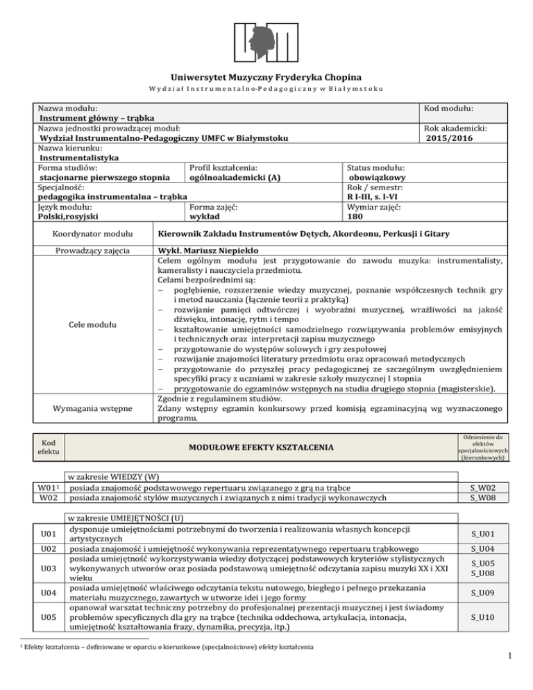 Uniwersytet Muzyczny Fryderyka Chopina W y d z i a ł I n s t r u m e n t a l n o-P e d a g o g i c z n y w B i a ł y m s t o k u Nazwa modułu: Instrument główny – trąbka Nazwa jednostki prowadzącej moduł: Wydział Instrumentalno-Pedagogiczny UMFC w Białymstoku Nazwa kierunku: Instrumentalistyka Forma studiów: Profil kształcenia: stacjonarne pierwszego stopnia ogólnoakademicki (A) Specjalność: pedagogika instrumentalna – trąbka Język modułu: Forma zajęć: Polski,rosyjski wykład Koordynator modułu Prowadzący zajęcia Cele modułu Wymagania wstępne Kod efektu W011 W02 U01 U02 U03 U04 U05 1 Kod modułu: Rok akademicki: 2015/2016 Status modułu: obowiązkowy Rok / semestr: R I-III, s. I-VI Wymiar zajęć: 180 Kierownik Zakładu Instrumentów Dętych, Akordeonu, Perkusji i Gitary Wykł. Mariusz Niepiekło Celem ogólnym modułu jest przygotowanie do zawodu muzyka: instrumentalisty, kameralisty i nauczyciela przedmiotu. Celami bezpośrednimi są: pogłębienie, rozszerzenie wiedzy muzycznej, poznanie współczesnych technik gry i metod nauczania (łączenie teorii z praktyką) rozwijanie pamięci odtwórczej i wyobraźni muzycznej, wrażliwości na jakość dźwięku, intonację, rytm i tempo kształtowanie umiejętności samodzielnego rozwiązywania problemów emisyjnych i technicznych oraz interpretacji zapisu muzycznego przygotowanie do występów solowych i gry zespołowej rozwijanie znajomości literatury przedmiotu oraz opracowań metodycznych przygotowanie do przyszłej pracy pedagogicznej ze szczególnym uwzględnieniem specyfiki pracy z uczniami w zakresie szkoły muzycznej I stopnia przygotowanie do egzaminów wstępnych na studia drugiego stopnia (magisterskie). Zgodnie z regulaminem studiów. Zdany wstępny egzamin konkursowy przed komisją egzaminacyjną wg wyznaczonego programu. MODUŁOWE EFEKTY KSZTAŁCENIA w zakresie WIEDZY (W) posiada znajomość podstawowego repertuaru związanego z grą na trąbce posiada znajomość stylów muzycznych i związanych z nimi tradycji wykonawczych w zakresie UMIEJĘTNOŚCI (U) dysponuje umiejętnościami potrzebnymi do tworzenia i realizowania własnych koncepcji artystycznych posiada znajomość i umiejętność wykonywania reprezentatywnego repertuaru trąbkowego posiada umiejętność wykorzystywania wiedzy dotyczącej podstawowych kryteriów stylistycznych wykonywanych utworów oraz posiada podstawową umiejętność odczytania zapisu muzyki XX i XXI wieku posiada umiejętność właściwego odczytania tekstu nutowego, biegłego i pełnego przekazania materiału muzycznego, zawartych w utworze idei i jego formy opanował warsztat techniczny potrzebny do profesjonalnej prezentacji muzycznej i jest świadomy problemów specyficznych dla gry na trąbce (technika oddechowa, artykulacja, intonacja, umiejętność kształtowania frazy, dynamika, precyzja, itp.) Odniesienie do efektów specjalnościowych (kierunkowych) S_W02 S_W08 S_U01 S_U04 S_U05 S_U08 S_U09 S_U10 Efekty kształcenia – definiowane w oparciu o kierunkowe (specjalnościowe) efekty kształcenia 1 U06 U07 K01 K02 K03 poprzez opanowanie efektywnych technik ćwiczenia wykazuje umiejętność samodzielnego doskonalenia warsztatu technicznego posiada umiejętność rozumienia i kontrolowania struktur rytmicznych i metrorytmicznych oraz aspektów dotyczących frazowania i zgodnego z nim oddychania itp. opracowywanych utworów S_U12 S_U13 w zakresie KOMPETENCJI SPOŁECZNYCH (K) realizuje własne koncepcje i działania artystyczne oparte na zróżnicowanej stylistyce, wynikającej z wykorzystania wyobraźni, ekspresji i intuicji w sposób świadomy i profesjonalny umie zaprezentować własną działalność artystyczną umie posługiwać się fachową terminologią z zakresu dziedziny muzyki S_K03 S_K10 S_K11 TREŚCI PROGRAMOWE MODUŁU Semestr I – VI Liczba godzin Z uwagi na indywidualny charakter zajęć, temat i problematyka poszczególnych lekcji jest dostosowywana do aktualnych umiejętności studenta. W każdym semestrze przewidziane są następujące treści programowe: 1. 2. 3. 4. 5. rozwijanie i pogłębianie techniki gry: gamy, pasaże, ćwiczenia techniczne, etiudy, czytanie nut a’vista; poznanie i opanowanie podstawowych pozycji literatury przedmiotu ze wszystkich epok i stylów; doskonalenie samodzielnego opracowania i interpretacji utworów, tworzenie własnych kadencji; rozwijanie pamięci i wyobraźni muzycznej; kształcenie solistyczno - estradowe, rozwijanie i utrwalanie praktycznych umiejętności potrzebnych w samodzielnej działalności (praktyka estradowa - zachowanie się na scenie, opanowanie tremy); występy na koncertach i audycjach; 6. kształtowanie umiejętności współpracy z akompaniatorem, w zespole kameralnym i orkiestrze symfonicznej; 7. kształtowanie umiejętności samooceny studenta; 8. poznanie podstaw psychologii muzyki i fizjologii gry. Treści programowe wzajemnie się przenikają, a większość z nich jest obecna na każdym etapie kształcenia. 180 Metody kształcenia 1. 2. 3. 4. Wykład problemowy Praca z tekstem i dyskusja Praca indywidualna Prezentacja własna Weryfikacja efektów kształcenia Metody weryfikacji Nr efektu 1. egzamin 2. zaliczenie W01, W02, U01 - U07, K01, K02, K03 W01, W02, U01 - U07, K01, K02, K03 Korelacja efektów kształcenia z treściami i metodami kształcenia oraz metodami ich weryfikacji Nr efektu kształcenia Treści kształcenia Metody kształcenia Metody weryfikacji W01 W02 U01 U02 U03 U04 U05 U06 U07 K01 K02 K03 1-7 1-7 1-7 1-7 1-7 1-8 1-8 1-8 1-8 1-8 1-8 1-8 1-4 1-4 1-4 1-4 1-4 1-4 1-4 1-4 1-4 1-4 1-4 1-4 1, 2 1, 2 1, 2 1, 2 1, 2 1, 2 1, 2 1, 2 1, 2 1, 2 1, 2 1, 2 Forma zaliczenia 2 zaliczenie na podstawie przebiegu pracy w semestrze (aktywność i stopień przygotowania do zajęć, stopień realizacji wymagań programowych, frekwencja); zaliczenie przez pedagoga za pomocą wpisu do indeksu umożliwia dopuszczenie do egzaminu po każdym semestrze egzamin - oceny dokonuje komisja powo