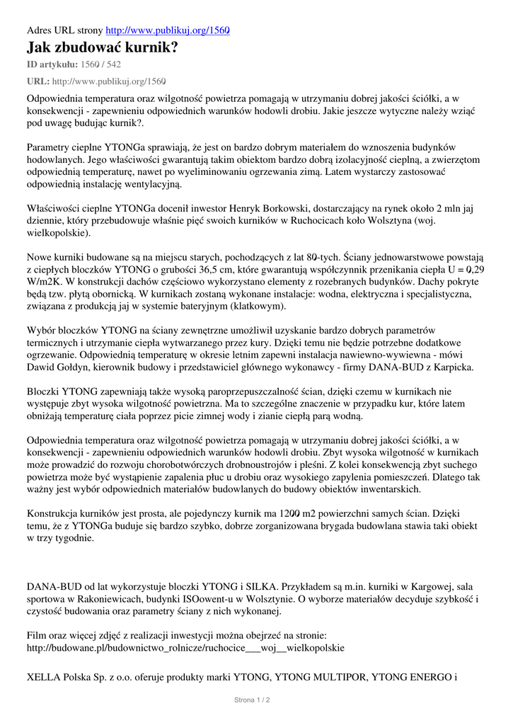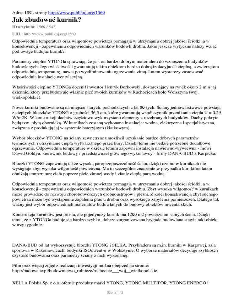 Adres URL strony http://www.publikuj.org/1560 Jak zbudować kurnik? ID artykułu: 1560 / 542 URL: http://www.publikuj.org/1560 Odpowiednia temperatura oraz wilgotność powietrza pomagają w utrzymaniu dobrej jakości ściółki, a w konsekwencji - zapewnieniu odpowiednich warunków hodowli drobiu. Jakie jeszcze wytyczne należy wziąć pod uwagę budując kurnik?. Parametry cieplne YTONGa sprawiają, że jest on bardzo dobrym materiałem do wznoszenia budynków hodowlanych. Jego właściwości gwarantują takim obiektom bardzo dobrą izolacyjność cieplną, a zwierzętom odpowiednią temperaturę, nawet po wyeliminowaniu ogrzewania zimą. Latem wystarczy zastosować odpowiednią instalację wentylacyjną. Właściwości cieplne YTONGa docenił inwestor Henryk Borkowski, dostarczający na rynek około 2 mln jaj dziennie, który przebudowuje właśnie pięć swoich kurników w Ruchocicach koło Wolsztyna (woj. wielkopolskie). Nowe kurniki budowane są na miejscu starych, pochodzących z lat 80-tych. Ściany jednowarstwowe powstają z ciepłych bloczków YTONG o grubości 36,5 cm, które gwarantują współczynnik przenikania ciepła U = 0,29 W/m2K. W konstrukcji dachów częściowo wykorzystano elementy z rozebranych budynków. Dachy pokryte będą tzw. płytą obornicką. W kurnikach zostaną wykonane instalacje: wodna, elektryczna i specjalistyczna, związana z produkcją jaj w systemie bateryjnym (klatkowym). Wybór bloczków YTONG na ściany zewnętrzne umożliwił uzyskanie bardzo dobrych parametrów termicznych i utrzymanie ciepła wytwarzanego przez kury. Dzięki temu nie będzie potrzebne dodatkowe ogrzewanie. Odpowiednią temperaturę w okresie letnim zapewni instalacja nawiewno-wywiewna - mówi Dawid Gołdyn, kierownik budowy i przedstawiciel głównego wykonawcy - firmy DANA-BUD z Karpicka. Bloczki YTONG zapewniają także wysoką paroprzepuszczalność ścian, dzięki czemu w kurnikach nie występuje zbyt wysoka wilgotność powietrzna. Ma to szczególne znaczenie w przypadku kur, które latem obniżają temperaturę ciała poprzez picie zimnej wody i zianie ciepłą parą wodną. Odpowiednia temperatura oraz wilgotność powietrza pomagają w utrzymaniu dobrej jakości ściółki, a w konsekwencji - zapewnieniu odpowiednich warunków hodowli drobiu. Zbyt wysoka wilgotność w kurnikach może prowadzić do rozwoju chorobotwórczych drobnoustrojów i pleśni. Z kolei konsekwencją zbyt suchego powietrza może być wystąpienie zapalenia płuc u drobiu oraz wysokiego zapylenia pomieszczeń. Dlatego tak ważny jest wybór odpowiednich materiałów budowlanych do budowy obiektów inwentarskich. Konstrukcja kurników jest prosta, ale pojedynczy kurnik ma 1200 m2 powierzchni samych ścian. Dzięki temu, że z YTONGa buduje się bardzo szybko, dobrze zorganizowana brygada budowlana stawia taki obiekt w trzy tygodnie. DANA-BUD od lat wykorzystuje bloczki YTONG i SILKA. Przykładem są m.in. kurniki w Kargowej, sala sportowa w Rakoniewicach, budynki ISOowent-u w Wolsztynie. O wyborze materiałów decyduje szybkość i czystość budowania oraz parametry ściany z nich wykonanej. Film oraz więcej zdjęć z realizacji inwestycji można obejrzeć na stronie: http://budowane.pl/budownictwo_rolnicze/ruchocice___woj__wielkopolskie XELLA Polska Sp. z o.o. oferuje produkty marki YTONG, YTONG MULTIPOR, YTONG ENERGO i Strona 1 / 2 SILKA, stosowane w budownictwie mieszkaniowym. Produkcja materiałów odbywa się w 11 nowoczesnych zakładach na terenie całej Polski. Sprzedaż firma Xella prowadzi poprzez sieć dystrybucji na terenie całego kraju oraz przez www.sklep.xella.pl Aktywacja: 07/10/09 08:40, odsłony: 1695 Strona 2 / 2