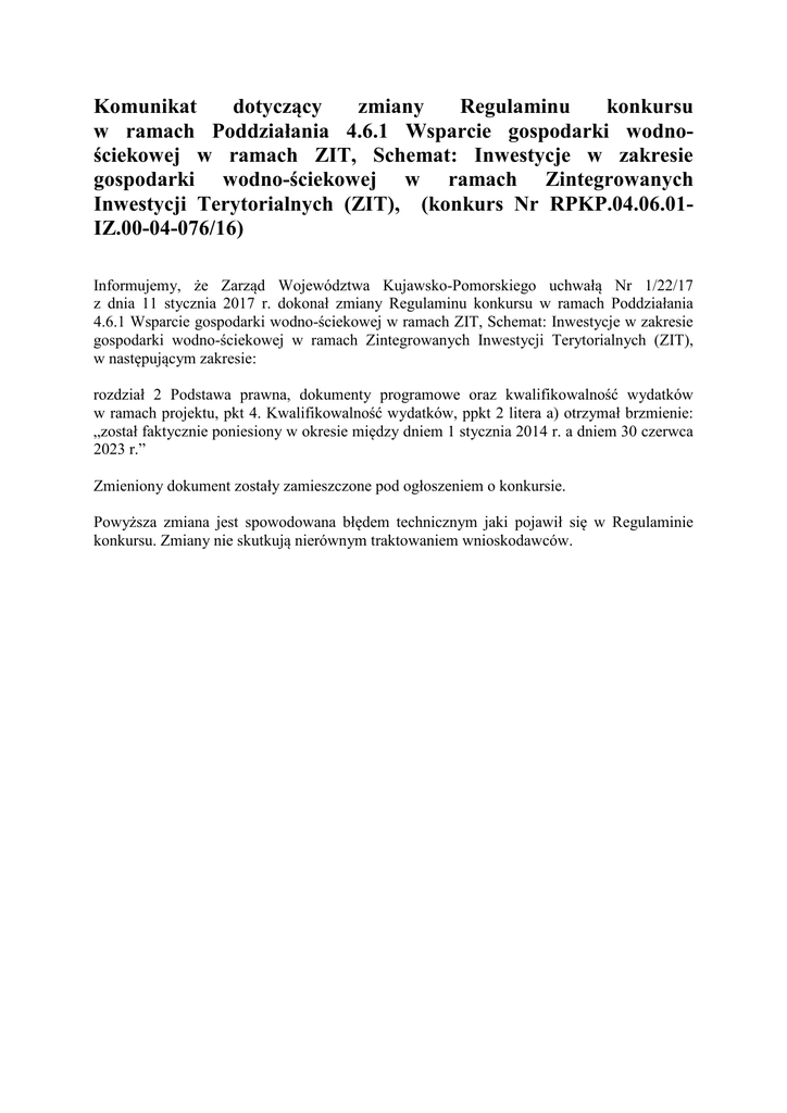 Komunikat dotyczący zmiany Regulaminu konkursu w ramach Poddziałania 4.6.1 Wsparcie gospodarki wodnościekowej w ramach ZIT, Schemat: Inwestycje w zakresie gospodarki wodno-ściekowej w ramach Zintegrowanych Inwestycji Terytorialnych (ZIT), (konkurs Nr RPKP.04.06.01IZ.00-04-076/16) Informujemy, że Zarząd Województwa Kujawsko-Pomorskiego uchwałą Nr 1/22/17 z dnia 11 stycznia 2017 r. dokonał zmiany Regulaminu konkursu w ramach Poddziałania 4.6.1 Wsparcie gospodarki wodno-ściekowej w ramach ZIT, Schemat: Inwestycje w zakresie gospodarki wodno-ściekowej w ramach Zintegrowanych Inwestycji Terytorialnych (ZIT), w następującym zakresie: rozdział 2 Podstawa prawna, dokumenty programowe oraz kwalifikowalność wydatków w ramach projektu, pkt 4. Kwalifikowalność wydatków, ppkt 2 litera a) otrzymał brzmienie: „został faktycznie poniesiony w okresie między dniem 1 stycznia 2014 r. a dniem 30 czerwca 2023 r.” Zmieniony dokument zostały zamieszczone pod ogłoszeniem o konkursie. Powyższa zmiana jest spowodowana błędem technicznym jaki pojawił się w Regulaminie konkursu. Zmiany nie skutkują nierównym traktowaniem wnioskodawców.