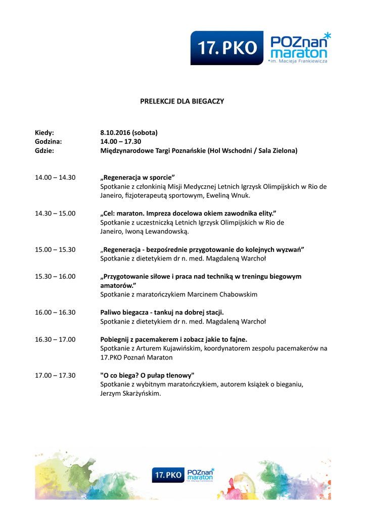 PRELEKCJE DLA BIEGACZY Kiedy: Godzina: Gdzie: 8.10.2016 (sobota) 14.00 – 17.30 Międzynarodowe Targi Poznańskie (Hol Wschodni / Sala Zielona) 14.00 – 14.30 „Regeneracja w sporcie” Spotkanie z członkinią Misji Medycznej Letnich Igrzysk Olimpijskich w Rio de Janeiro, fizjoterapeutą sportowym, Eweliną Wnuk. 14.30 – 15.00 „Cel: maraton. Impreza docelowa okiem zawodnika elity.” Spotkanie z uczestniczką Letnich Igrzysk Olimpijskich w Rio de Janeiro, Iwoną Lewandowską. 15.00 – 15.30 „Regeneracja - bezpośrednie przygotowanie do kolejnych wyzwań” Spotkanie z dietetykiem dr n. med. Magdaleną Warchoł 15.30 – 16.00 „Przygotowanie siłowe i praca nad techniką w treningu biegowym amatorów.” Spotkanie z maratończykiem Marcinem Chabowskim 16.00 – 16.30 Paliwo biegacza - tankuj na dobrej stacji. Spotkanie z dietetykiem dr n. med. Magdaleną Warchoł 16.30 – 17.00 Pobiegnij z pacemakerem i zobacz jakie to fajne. Spotkanie z Arturem Kujawińskim, koordynatorem zespołu pacemakerów na 17.PKO Poznań Maraton 17.00 – 17.30 "O co biega? O pułap tlenowy" Spotkanie z wybitnym maratończykiem, autorem książek o bieganiu, Jerzym Skarżyńskim.