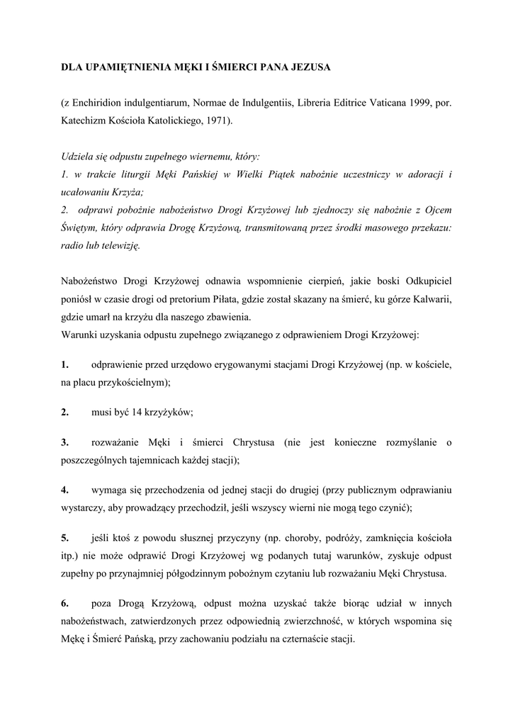 DLA UPAMIĘTNIENIA MĘKI I ŚMIERCI PANA JEZUSA (z Enchiridion indulgentiarum, Normae de Indulgentiis, Libreria Editrice Vaticana 1999, por. Katechizm Kościoła Katolickiego, 1971). Udziela się odpustu zupełnego wiernemu, który: 1. w trakcie liturgii Męki Pańskiej w Wielki Piątek nabożnie uczestniczy w adoracji i ucałowaniu Krzyża; 2. odprawi pobożnie nabożeństwo Drogi Krzyżowej lub zjednoczy się nabożnie z Ojcem Świętym, który odprawia Drogę Krzyżową, transmitowaną przez środki masowego przekazu: radio lub telewizję. Nabożeństwo Drogi Krzyżowej odnawia wspomnienie cierpień, jakie boski Odkupiciel poniósł w czasie drogi od pretorium Piłata, gdzie został skazany na śmierć, ku górze Kalwarii, gdzie umarł na krzyżu dla naszego zbawienia. Warunki uzyskania odpustu zupełnego związanego z odprawieniem Drogi Krzyżowej: 1. odprawienie przed urzędowo erygowanymi stacjami Drogi Krzyżowej (np. w kościele, na placu przykościelnym); 2. musi być 14 krzyżyków; 3. rozważanie Męki i śmierci Chrystusa (nie jest konieczne rozmyślanie o poszczególnych tajemnicach każdej stacji); 4. wymaga się przechodzenia od jednej stacji do drugiej (przy publicznym odprawianiu wystarczy, aby prowadzący przechodził, jeśli wszyscy wierni nie mogą tego czynić); 5. jeśli ktoś z powodu słusznej przyczyny (np. choroby, podróży, zamknięcia kościoła itp.) nie może odprawić Drogi Krzyżowej wg podanych tutaj warunków, zyskuje odpust zupełny po przynajmniej półgodzinnym pobożnym czytaniu lub rozważaniu Męki Chrystusa. 6. poza Drogą Krzyżową, odpust można uzyskać także biorąc udział w innych nabożeństwach, zatwierdzonych przez odpowiednią zwierzchność, w których wspomina się Mękę i Śmierć Pańską, przy zachowaniu podziału na czternaście stacji. 7. w Kościołach wschodnich, gdzie nie ma zwyczaju odprawiania tego nabożeństwa, do uzyskania odpustu ważne jest inne nabożeństwo dla upamiętnienia Męki i Śmierci naszego Pana Jezusa Chrystusa, które każdy z patriarchów ustanawia dla swoich wiernych. MODLITWA DO JEZUSA UKRZYŻOWANEGO Dekretem Piusa IX, wierny, który ją odmówi po Komunii św. przed wizerunkiem Jezusa Ukrzyżowanego, może uzyskać odpust zupełny w piątki Wielkiego Postu i odpust częściowy w pozostałe dni roku. Oto ja Dobry i Najsłodszy Jezu, upadam na kolana przed Obliczem Twoim, i z największą żarliwością ducha proszę Cię i błagam, abyś wszczepił w serce moje najżywsze uczucia: wiary, nadziei i miłości oraz prawdziwą skruchę za grzechy moje i silną wolę poprawy sercu mojemu dać raczył. Oto teraz drżąc i wzdychając staję przed Tobą mając to przed oczyma co juz prorok Dawid mówił o Tobie, o Dobry Jezu , „przebodli ręce i nogi Moje, policzyć mogę wszystkie kości Moje". św. Ignacy Loyola Ojcze Nasz, Zdrowaś Maryjo, Chwała Ojcu WIELBIĘ CIĘ, O KRZYŻU ŚWIĘTY Odmówiona 33 razy w Wielki Piątek, uwalnia 33 dusze z czyśćca, a odmówiona 50 razy, w każdy piątek, uwalnia 5. Została potwierdzona przez papieży Hadriana VI, Grzegorza XIII i Pawła VI. Wielbię cię, o Krzyżu Święty, który byłeś ozdobiony Najświętszym Ciałem mojego Pana, pokryty i zbroczony Jego Drogocenną Krwią. Wielbię Cię, mój Boże, dla mnie przybity do Krzyża. Wielbię Cię, o Krzyżu Święty, przez miłość Ku Temu, który jest moim Panem. Amen.