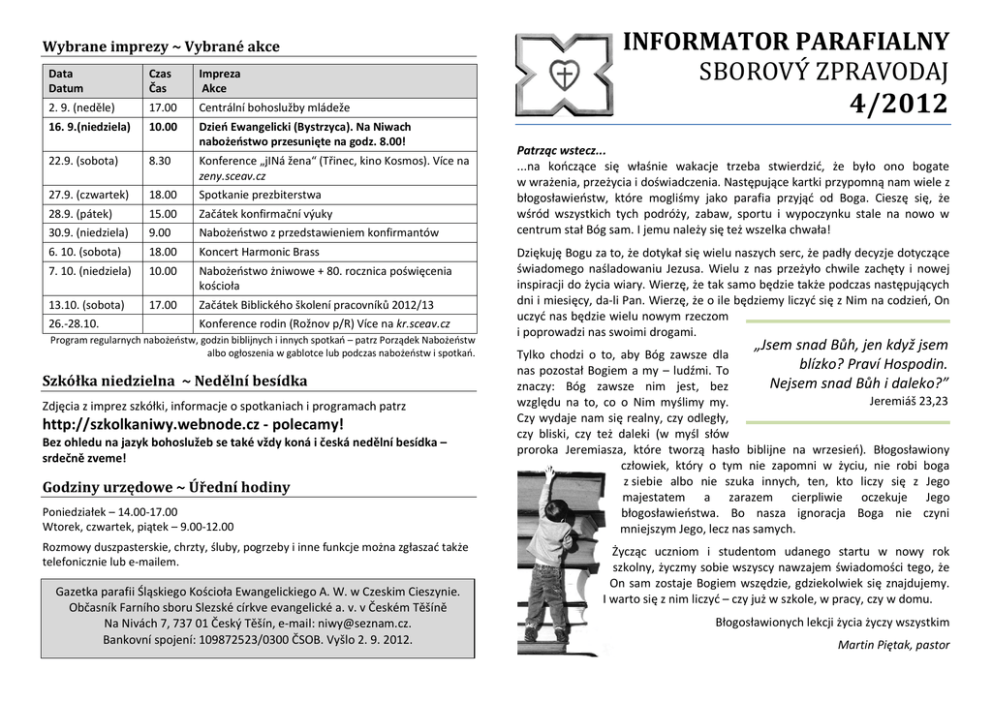 Wybrane imprezy ~ Vybrané akce Data Datum Czas Čas Impreza Akce 2. 9. (neděle) 17.00 Centrální bohoslužby mládeže 16. 9.(niedziela) 10.00 Dzień Ewangelicki (Bystrzyca). Na Niwach nabożeństwo przesunięte na godz. 8.00! 22.9. (sobota) 8.30 Konference „jINá žena“ (Třinec, kino Kosmos). Více na zeny.sceav.cz 27.9. (czwartek) 18.00 Spotkanie prezbiterstwa 28.9. (pátek) 15.00 Začátek konfirmační výuky 30.9. (niedziela) 9.00 Nabożeństwo z przedstawieniem konfirmantów 6. 10. (sobota) 18.00 Koncert Harmonic Brass 7. 10. (niedziela) 10.00 Nabożeństwo żniwowe + 80. rocznica poświęcenia kościoła 13.10. (sobota) 17.00 Začátek Biblického školení pracovníků 2012/13 26.-28.10. Konference rodin (Rožnov p/R) Více na kr.sceav.cz Program regularnych nabożeństw, godzin biblijnych i innych spotkań – patrz Porządek Nabożeństw albo ogłoszenia w gablotce lub podczas nabożeństw i spotkań. Szkółka niedzielna ~ Nedělní besídka Zdjęcia z imprez szkółki, informacje o spotkaniach i programach patrz http://szkolkaniwy.webnode.cz - polecamy! Bez ohledu na jazyk bohoslužeb se také vždy koná i česká nedělní besídka – srdečně zveme! Godziny urzędowe ~ Úřední hodiny Poniedziałek – 14.00-17.00 Wtorek, czwartek, piątek – 9.00-12.00 Rozmowy duszpasterskie, chrzty, śluby, pogrzeby i inne funkcje można zgłaszać także telefonicznie lub e-mailem. Gazetka parafii Śląskiego Kościoła Ewangelickiego A. W. w Czeskim Cieszynie. Občasník Farního sboru Slezské církve evangelické a. v. v Českém Těšíně Na Nivách 7, 737 01 Český Těšín, e-mail: [email protected]. Bankovní spojení: 109872523/0300 ČSOB. Vyšlo 2. 9. 2012. INFORMATOR PARAFIALNY SBOROVÝ ZPRAVODAJ 4/2012 Patrząc wstecz... ...na kończące się właśnie wakacje trzeba stwierdzić, że było ono bogate w wrażenia, przeżycia i doświadczenia. Następujące kartki przypomną nam wiele z błogosławieństw, które mogliśmy jako parafia przyjąć od Boga. Cieszę się, że wśród wszystkich tych podróży, zabaw, sportu i wypoczynku stale na nowo w centrum stał Bóg sam. I jemu należy się też wszelka chwała! Dziękuję Bogu za to, że dotykał się wielu naszych serc, że padły decyzje dotyczące świadomego naśladowaniu Jezusa. Wielu z nas przeżyło chwile zachęty i nowej inspiracji do życia wiary. Wierzę, że tak samo będzie także podczas następujących dni i miesięcy, da-li Pan. Wierzę, że o ile będziemy liczyć się z Nim na codzień, On uczyć nas będzie wielu nowym rzeczom i poprowadzi nas swoimi drogami. „Jsem snad Bůh, jen když jsem Tylko chodzi o to, aby Bóg zawsze dla blízko? Praví Hospodin. nas pozostał Bogiem a my – ludźmi. To Nejsem snad Bůh i daleko?” znaczy: Bóg zawsze nim jest, bez Jeremiáš 23,23 względu na to, co o Nim myślimy my. Czy wydaje nam się realny, czy odległy, czy bliski, czy też daleki (w myśl słów proroka Jeremiasza, które tworzą hasło biblijne na wrzesień). Błogosławiony człowiek, który o tym nie zapomni w życiu, nie robi boga z siebie albo nie szuka innych, ten, kto liczy się z Jego majestatem a zarazem cierpliwie oczekuje Jego błogosławieństwa. Bo nasza ignoracja Boga nie czyni mniejszym Jego, lecz nas samych. Życząc uczniom i studentom udanego startu w nowy rok szkolny, życzmy sobie wszyscy nawzajem świadomości tego, że On sam zostaje Bogiem wszędzie, gdziekolwiek się znajdujemy. I warto się z nim liczyć – czy już w szkole, w pracy, czy w domu. Błogosławionych lekcji życia życzy wszystkim Martin Piętak, pastor Z życia zboru ~ Ze života sboru Wycieczki zborowe Po kilkuletniej przerwie w tym roku zostały wznowione wycieczki krajoznawcze organizowane przez chętnych ludzi z naszego kościoła. Pierwsza uskuteczniła się 6. 7. b. r., gdy o godz 8.00 wyruszyły z placu kościelnego 3 samochody z 14 uczestnikami w kierunku Lipnika i Helfštýna. O godz. 9.00 dołączył do nas przewodnik, który przez półtorej godziny oprowadzał nas po ciekawych miejscach Lipnika nad Beczwą: stara dzwonnica na rynku, stary żydowski cmentarz, synagoga, mury obronne oraz zamek. W parku zamkowym pod tzw. „małpim drzewem” nasz pastor podzielił się z nami Słowem Bożym oraz wzniesiono kilka modlitw. Po spożyciu smacznego obiadu wyruszyliśmy na zamek Helfštýn, gdzie odbywają się warsztaty kowali, których wyroby zdobią ogrody zamku i miasto Lipnik. Podziękowania za organizację tej wycieczki należą się br. Rudkowi Heczce oraz jego żonie. Bóg zapłać za ofiarność! Zaś 25. 8. b. r. sprzed bramy kościelnej ruszył autokar z 42 uczestnikami w kierunku Bielska-Białej, góry Żar i Cisownicy. Przewodnik z Polski opowiadał nam po drodze o ciekawostkach miast, przez które przejeżdżaliśmy. W Bielsku-Białej zwiedziliśmy Studio Filmów Rysunkowych dla dzieci, które jeszcze i my dorośli pamiętamy. Następnie dotarliśmy pod górę Żar, która znajduje się w paśmie gór Beskidu Małego na wysokości 761 m n. p. m. Na wierzchołku góry znajduje się elektrownia szczytowo-pompowa. W górę wyjechaliśmy kolejką a z powrotem kto miał zdrowe nogi, szedł na piechotę a starszyzna znów kolejką. Na stokach góry znajduje się małe lotnisko, gdzie startują i lądują szybowce. Jaka to była przyjemność oglądać je pod chmurami! A w dole pod górą – trzy jeziora (Żywieckie, Międzybrodzkie i Czarnieckie), na których można pojeździć kajakami, rowerami wodnymi oraz żaglówkami. W drodze powrotnej zatrzymaliśmy się jeszcze w Cisownicy, odwiedzając kościół ewangelicki, o którym opowiadał nam miejscowy proboszcz ks. M. Twardzik. Następnie na piechotę udaliśmy się do Izby Regionalnej p. Brzezinów, gdzie był dla nas przygotowany ciepły posiłek. Dla dzieci nadszedł czas zabawy na świeżym powietrzu i zielonej łące. Wszystkim, którzy podjęli się zorganizowania tej wycieczki serdecznie dziękujemy słowem Bóg zapłać – Tomk