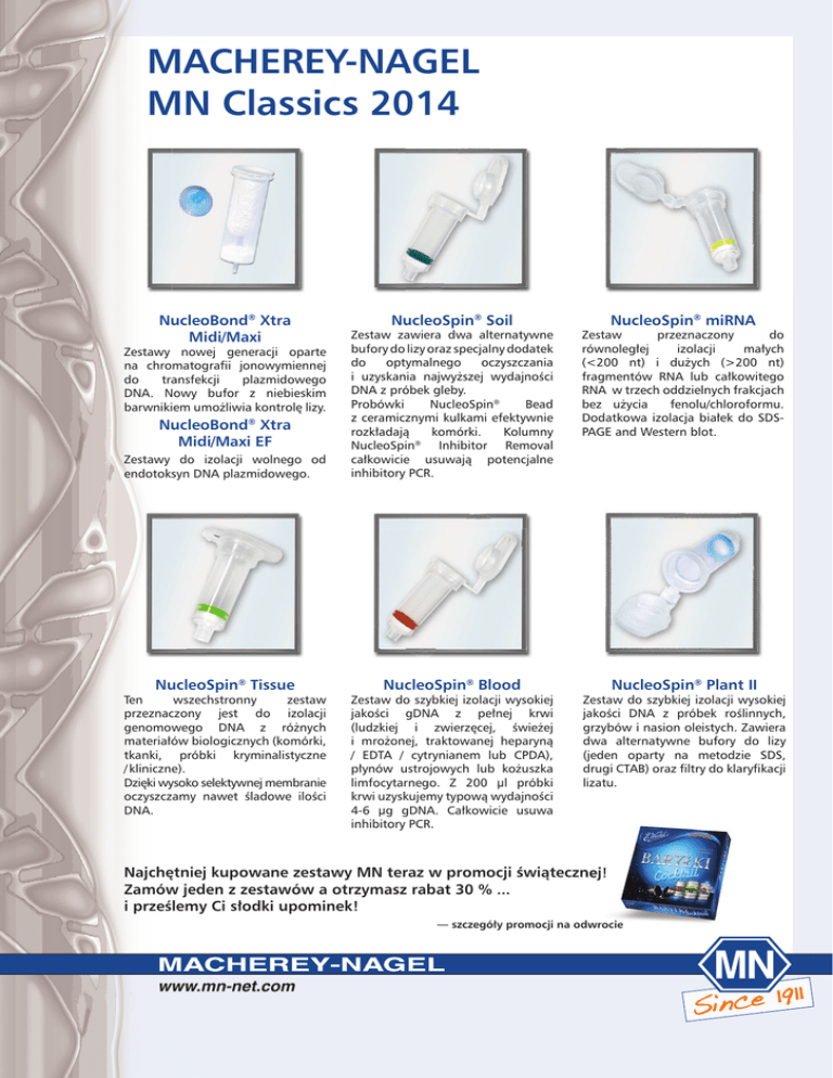 MACHEREY-NAGEL MN Classics 2014 NucleoBond® Xtra Midi/Maxi NucleoSpin® Soil NucleoSpin® miRNA Zestaw przeznaczony do równoległej izolacji małych (<200 nt) i dużych (>200 nt) fragmentów RNA lub całkowitego RNA w trzech oddzielnych frakcjach bez użycia fenolu/chloroformu. Dodatkowa izolacja białek do SDSPAGE and Western blot. Zestawy do izolacji wolnego od endotoksyn DNA plazmidowego. Zestaw zawiera dwa alternatywne bufory do lizy oraz specjalny dodatek do optymalnego oczyszczania i uzyskania najwyższej wydajności DNA z próbek gleby. Bead Probówki NucleoSpin® z ceramicznymi kulkami efektywnie rozkładają komórki. Kolumny NucleoSpin® Inhibitor Removal całkowicie usuwają potencjalne inhibitory PCR. NucleoSpin® Tissue NucleoSpin® Blood NucleoSpin® Plant II Zestawy nowej generacji oparte na chromatografii jonowymiennej do transfekcji plazmidowego DNA. Nowy bufor z niebieskim barwnikiem umożliwia kontrolę lizy. NucleoBond® Xtra Midi/Maxi EF Ten wszechstronny zestaw przeznaczony jest do izolacji genomowego DNA z różnych materiałów biologicznych (komórki, tkanki, próbki kryminalistyczne / kliniczne). Dzięki wysoko selektywnej membranie oczyszczamy nawet śladowe ilości DNA. Zestaw do szybkiej izolacji wysokiej jakości gDNA z pełnej krwi (ludzkiej i zwierzęcej, świeżej i mrożonej, traktowanej heparyną / EDTA / cytrynianem lub CPDA), płynów ustrojowych lub kożuszka limfocytarnego. Z 200 µl próbki krwi uzyskujemy typową wydajności 4-6 µg gDNA. Całkowicie usuwa inhibitory PCR. Zestaw do szybkiej izolacji wysokiej jakości DNA z próbek roślinnych, grzybów i nasion oleistych. Zawiera dwa alternatywne bufory do lizy (jeden oparty na metodzie SDS, drugi CTAB) oraz filtry do klaryfikacji lizatu. Najchętniej kupowane zestawy MN teraz w promocji świątecznej! Zamów jeden z zestawów a otrzymasz rabat 30 % ... i prześlemy Ci słodki upominek! — szczegóły promocji na odwrocie www.mn-net.com MACHEREY-NAGEL MN Classics 2014 Nr kat. Zestaw Liczba izolacji Cena katalogowa Cena specjalna Oczyszczanie plazmidowego DNA 740 410.50 NucleoBond® Xtra Midi 50 343€ 240€ 740 410.100 NucleoBond® Xtra Midi 100 633€ 443€ 740 414.50 NucleoBond® Xtra Maxi 50 740 414.100 NucleoBond® Xtra Maxi 100 792€ 1 464€ 1025€ 740 420.50 NucleoBond® Xtra Midi EF 50 517€ 362€ 740 424.50 Izolacja DNA z krwi 740 951.50 NucleoBond Xtra Maxi EF 50 1 182€ 827€ NucleoSpin® Blood 50 119€ 83€ 740 951.250 NucleoSpin® Blood 250 533€ 373€ Izolacja DNA z komórek i tkanek 740 952.50 NucleoSpin® Tissue 50 135€ 95€ 250 604€ 423€ 50 210€ 147€ 740 780.250 NucleoSpin Soil Izolacja DNA z roślin 740 770.50 NucleoSpin® Plant II 250 937€ 656€ 50 137€ 96€ 740 770.250 NucleoSpin Plant II Równoległa izolacja małych i dużych fragmentów RNA 740 971.50 NucleoSpin® miRNA 250 604€ 423€ 50 277€ 194€ 740 971.250 250 1216€ 851€ 740 952.250 Izolacja DNA z gleby 740 780.50 ® NucleoSpin Tissue ® NucleoSpin® Soil ® ® NucleoSpin miRNA ® Liczba zamawianych opakowań 554€ Dane do zamówienia Nazwisko i imię Nazwa firmy E-mail Telefon Faks Adres Data i Podpis Warunki handlowe • Oferta ważna od 1 listopada do 31 grudnia 2014 r. • Do cen należy doliczyć: podatek VAT – 23% • Ceny rzeczywiste będą wyliczone w oparciu o kurs sprzedaży Euro banku Getin Noble Bank S.A. z dnia wystawienia faktury • Termin dostawy: ok. 2 tygodnie • Transport: 15 zł netto, powyżej 2000 zł netto – bezpłatny W celu zamówienia zestawów prześlij faks używając powyższego formularza lub e-mail powołując się na Promocję świąteczną 2014 – MN Classics. AQUA LAB A.Sierzputowski i Wspólnicy Sp. j. ul. Zabłocka 10 tel 22 676 90 28 03-194 Warszawa 22 676 92 82 www.aqualab.pl 22 819 40 50 [email protected] faks 22 819 40 55 www.mn-net.com MACHEREY-NAGEL EN ISO 9001: 2008 CERTIFIED MACHEREY-NAGEL Inc. · 2850 Emrick Blvd. · Bethlehem, PA 18020 · USA USA: Switzerland: Germany MACHEREY-NAGEL Inc. MACHEREY-NAGEL AG and international: Tel.: +1 484 821 0984 Tel.: +41 62 388 55 00 Tel.: +49 24 21 969-0 Fax: +1 484 821 1272 Fax: +41 62 388 55 05 Fax: +49 24 21 969-199 E-mail: [email protected] E-mail: [email protected] E-mail: [email protected] France: MACHEREY-NAGEL EURL Tel.: +33 388 68 22 68 Fax: +33 388 51 76 88 E-mail: [email protected]