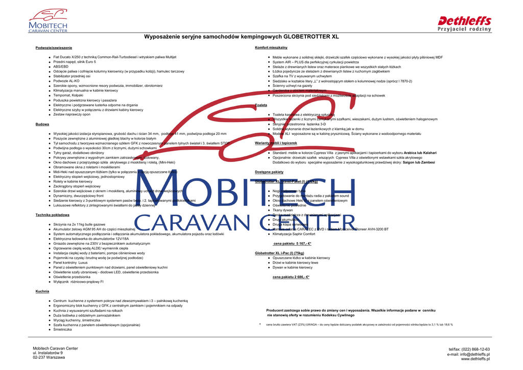 Wyposażenie seryjne samochodów kempingowych GLOBETROTTER XL Podwozie/zawieszenie ● ● ● ● ● ● ● ● ● ● ● ● ● Fiat Ducato X/250 z techniką Common-Rail-Turbodiesel i wtryskiem paliwa Multijet Przedni napęd, silnik Euro 5 ABS/EBD Odcięcie paliwa i cofnięcie kolumny kierownicy (w przypadku kolizji), hamulec tarczowy Stabilizator przedniej osi Podwozie AL-KO Szerokie opony, wzmocnione resory podwozia, immobilizer, obrotomierz Klimatyzacja manualna w kabinie kierowcy Tempomat, Kołpaki Poduszka powietrzna kierowcy i pasażera Elektryczne i podgrzewane lusterka odporne na drgania Elektryczne szyby w połączeniu z drzwiami kabiny kierowcy Zestaw naprawczy opon Komfort mieszkalny Wysokiej jakości izolacja styropianowa, grubość dachu i ścian 34 mm, podłoga 41 mm, podwójna podłoga 20 mm Poszycie zewnętrzne z aluminiowej gładkiej blachy w kolorze białym Tył samochodu z tworzywa wzmacnianego szkłem GFK z nowoczesnym panelem tylnych świateł i 3. światłem STOP Podwójna podłoga o wysokości 30cm z licznymi, dużymi schowkami Tylny garaż, dodatkowo obniżony Pokrywy zewnętrzne z wygodnym zamkiem zatrzaskowym, izolowany, Okno dachowe z przejrzystego szkła akrylowego z moskitierą i roletą, (Mini-Heki) Obramowane okna z roletami i moskitierami Midi-Heki nad opuszczanym łóżkiem (tylko w połączeniu z opcją opuszczane łóżko) Elektryczny stopień wejściowy, jednostopniowy Rolety w kabinie kierowcy Zaokrąglony stopień wejściowy Szerokie drzwi wejściowe z oknem i moskitierą, aluminiowy uchwyt drzwi wejściowych Dynamiczny, dwuczęściowy front Siedzenie kierowcy z 3-punktowym systemem pasów bezp. i 2. tapicerowanymi podłokietnikami Luksusowe reflektory z zintegrowanymi światłami do jazdy dziennej Skrzynia na 2x 11kg butle gazowe Akumulator żelowy AGM 95 AH do części mieszkalnej System automatycznego podłączania i odłączania akumulatora pokładowego, akumulatora pojazdu oraz lodówki Elektryczna ładowarka do akumulatorów 12V/18A Gniazdo zewnętrzne na 230V z bezpiecznikiem automatycznym Ogrzewanie ciepłą wodą ALDE/ wymiennik ciepła Instalacja ciepłej wody z bateriami, pompa ciśnieniowa wody Pojemniki na czystą i brudną wodę (w podwójnej podłodze) Panel kontrolny Luxus Panel z oświetleniem punktowym nad drzwiami, panel oświetleniowy kuchni Oświetlenie szafy ubraniowej - diodowe LED, oświetlenie przedsionka Oświetlenie przedsionka Wyłącznik różnicowo-prądowy FI ● ● ● ● ● Toaleta kasetowa z elektryczną spłuczką Wszystkie łazienki z licznymi zamykanymi szafkami, wieszakami, dużym lustrem, oświetleniem halogenowym Seryjnie: przestronna łazienka 3-D Solidne wykonanie drzwi łazienkowych z klamką jak w domu Modele XLI wyposażone są w kabinę prysznicową. Ściany wykonane z wodoodpornego materiału Warianty mebli i tapicerek ● Standard: meble w kolorze Cypress Villa z jasnymi aplikacjami i tapicerkami do wyboru Arabica lub Kalahari ● Opcjonalnie: drzwiczki szafek wiszących Cypress Villa z oświetlonymi wstawkami szkła akrylowego Dodatkowo do wyboru specjalne wyposażenie z wysokogatunkowej prawdziwej skóry: Saigon lub Zambesi Dostępne pakiety Globetrotter XL Travel-Paket (I) (112kg) ● ● ● ● ● ● ● ● ● ● Technika pokładowa ● ● ● ● ● ● ● ● ● ● ● ● ● Meble wykonane z solidnej sklejki, drzwiczki szafek częściowo wykonane z wysokiej jakości płyty pilśniowej MDF System AIR – PLUS dla perfekcyjnej cyrkulacji powietrza Stelaże z drewnianych listew oraz materace piankowe we wszystkich stałych łóżkach Łóżka pojedyncze ze stelażem z drewnianych listew z ruchomym zagłówkiem Szafka na TV z wysuwanym uchwytem Siedzisko w kształcie litery „L” z wolnostojącym stołem o kolumnowej nodze (oprócz I 7870-2) Ścienny uchwyt na gazety Garderoba z obiciem materiałowym Poszerzona skrzynia pod siedziskami z możliwością adaptacji na schowek Toaleta Budowa ● ● ● ● ● ● ● ● ● ● ● ● ● ● ● ● ● ● ● ● ● ● ● ● ● Nogi podporowe tylne Przygotowanie do montażu radia z pakietem sound Okno dachowe Heki III z panelem oświetleniowym Oświetlenie pośrednie Tkany dywan Deska rozdzielcza z drewnianymi aplikacjami Drugi akumulator Druga klapa serwisowa Kamera cofania CARATEC z DVD i radiem Moniceiver Pioneer AVH-3200 BT Klimatyzacja Saphir Comfort cena pakietu 5 167,- €* Globetrotter XL i-Pac (I) (75kg) ● Opuszczane łóżko w kabinie kierowcy ● Drzwi w kabinie kierowcy lewe ● Dywan w kabinie kierowcy cena pakietu 2 686,- €* Kuchnia ● ● ● ● ● ● ● Centrum kuchenne z systemem pokryw nad zlewozmywakiem i 3 – palnikową kuchenką Ergonomiczny blok kuchenny z GFK z centralnym zamkiem i pojemnikiem na odpady Kuchnia z wysuwanymi szufladami na rolkach Duża lodówka z oddzielnym zamrażalnikiem Wyciąg kuchenny, śmietniczka Szafa kuchenna z panelem oświetleniowym (opcjonalnie) Śmietniczka Mobitech Caravan Center ul. Instalatorów 9 02-237 Warszawa Producent zastrzega sobie prawo do zmiany cen i wyposażenia. Wszelkie informacje podane w cenniku nie stanowią oferty w rozumieniu Kodeksu Cywilnego * cena brutto zawiera VAT (23%) UWAGA – do ceny będzie doliczany podatek akcyzowy w zależności od pojemności silnika będzie to 3,1 % lub 18,6 % tel/fax: (022) 868-12-63 e-mail: [email protected] www.dethleffs.pl