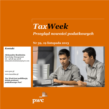 TaxWeek Przegląd nowości podatkowych Nr 39, 19 listopada 2013 Kontakt Aleksandra Bembnista Knowledge Management tel. +48 58 552 9008 [email protected] www.pwc.pl www.taxonline.pl Tax Week jest publikacją działu prawnopodatkowego PwC Z przyjemnością oddajemy w Państwa ręce kolejne wydanie newslettera, w którym znajdą Państwo najciekawsze orzeczenia oraz interpretacje indywidualne, a także wybór nowości legislacyjnych. Życzymy przyjemnej lektury! Orzeczenie tygodnia Interpretacja tygodnia Jak ustalać okres ważności certyfikatu rezydencji? Interpretacja ogólna MF: Koszt wynajmu samochodów osobowych, wykorzystywanych w działalności gospodarczej, można zaliczyć do kosztów podatkowych na zasadach ogólnych. Wojewódzki Sąd Administracyjny w Warszawie wydał orzeczenie, w którym uznał, że certyfikat rezydencji wydany bez daty obowiązywania, zachowuje aktualność do czasu zmiany potwierdzonego w nim stanu faktycznego. Warto zwrócić uwagę na fakt, że wyrok uchyla niekorzystną dla podatnika urzędową zmianę interpretacji dokonaną przez Ministra Finansów. W ustnym uzasadnieniu sąd wskazał, że przepisy nie regulują kwestii jak długo certyfikat rezydencji, wydany przez właściwy organ administracji podatkowej, zachowuje swoją aktualność, a tym samym ważność, dlatego należy uznać, iż certyfikat zachowuje ważność tak długo, jak długo nie ulega zmianie potwierdzony w nim stan faktyczny. WSA stwierdził, iż nie można przychylić się do stanowiska prezentowanego przez Ministra Finansów, ponieważ idąc tropem jego rozumowania klienci banku posiadający lokaty powinni przedstawiać certyfikat przy każdej wypłacie odsetek i innych należności. W opinii sądu takiego obowiązku nie można wywieźć z obowiązujących przepisów prawa. (Ustne uzasadnienie wyroku WSA w Warszawie z dnia 8 listopada 2013 r.) Minister Finansów wydał interpretację ogólną, w której – uwzględniając dominującą linię orzeczniczą sądów administracyjnych – potwierdził, że wydatki ponoszone przez podatników w związku z wynajmowaniem samochodów osobowych wykorzystywanych dla potrzeb działalności gospodarczej, mogą być ujęte w kosztach podatkowych na zasadach ogólnych. W uzasadnieniu interpretacji Minister wskazał, że koszty związane z używaniem samochodu osobowego to koszty posługiwania się tym samochodem, wykorzystywania go. Koszty te nie obejmują kosztów związanych z uzyskaniem możliwości używania takiego samochodu. Oznacza to, że do kosztów z tytułu używania wynajętego samochodu osobowego dla potrzeb działalności gospodarczej zaliczane są wszelkiego rodzaju wydatki eksploatacyjne. Wydatkami o charakterze eksploatacyjnym nie są wydatki z tytułu czynszu najmu samochodu osobowego dla potrzeb prowadzonej działalności gospodarczej. Są to wydatki na uzyskanie samego tytułu prawnego umożliwiającego używanie samochodu, a zatem są kategorią odrębną od kosztów eksploatacji samochodu. (Interpretacja ogólna Ministra Finansów z dnia 8 listopada 2013 r.) zakresie, w jakim służy on profilaktyce, zachowaniu, ratowaniu, przywracaniu i poprawie zdrowia, korzysta ze zwolnienia od podatku na podstawie art. 43 ust. 1 pkt 19 lit. c) ustawy o VAT. (Wyrok NSA z dnia 22 października 2013 r.) Legislacja Prezydent podpisał protokół do umowy o unikaniu podwójnego opodatkowania z Indiami W dniu 8 listopada 2013 r. Prezydent podpisał ustawę o ratyfikacji Protokołu między Rządem Rzeczypospolitej Polskiej a Rządem Republiki Indii o zmianie Umowy między Rządem Polskiej Rzeczypospolitej Ludowej a Rządem Republiki Indii w sprawie unikania podwójnego opodatkowania i zapobiegania uchylaniu się od opodatkowania w zakresie podatków od dochodu, sporządzonej w Warszawie dnia 29 stycznia 2013 r. Express sądowy Usługi psychoanalityków zwolnione z VAT Zawód psychoanalityka, posiadającego fachowe kwalifikacje, czyli stosowny zasób wiedzy i umiejętności, wymaganych do udzielania świadczeń zdrowotnych, zweryfikowane w ramach członkowskiej procedury kwalifikacyjnej Polskiego Towarzystwa Psychoanalitycznego, jest zawodem medycznym, o którym mowa w art. 2 ust. 1 pkt 2 ustawy z dnia 15 kwietnia 2011 r. o działalności leczniczej, a tym samym w Wymogi dotyczące sentencji i uzasadnienia interpretacji indywidualnej w sytuacji uznania stanowiska spółki za częściowo nieprawidłowe Sentencja i uzasadnienie interpretacji powinny stanowić logiczną i spójną całość. W świetle obowiązujących regulacji dopuszczalne jest uznanie stanowiska wnioskodawcy za prawidłowe w części (w niepełnym zakresie). W związku z powyższym, uznając stanowisko wnioskodawcy za prawidłowe w części, interpretator powinien dać temu wyraz w sentencji rozstrzygnięcia, np. w taki sposób, jak zaproponowała spółka we wniosku o usunięcie naruszenia prawa, poprzez wskazanie w jakim zakresie prezentowane przez nią stanowisko jest prawidłowe, a w jakim nieprawidłowe. (Wyrok WSA w Rzeszowie z dnia 15 października 2013 r.) Praktyczne konsekwencje wyroku TK – brak możliwości orzekania o odpowiedzialności w PIT z tytułu przychodów uzyskiwanych ze źródeł nieujawnionych (w latach 1998-2006) Stwierdzenie przez Trybunał Konstytucyjny w wyroku z 18 lipca 2013 r. o sygn. SK 18/09, że przepis art. 20 ust. 3 ustawy o PIT, w brzemieniu obowiązującym od 1 stycznia 1998 r. do 31 grudnia 2006 r., jest niezgodny z Konstytucją, powoduje odpadnięcie podstawy prawnej do prowadzenia za ten okres postępowań podatkowych i określania podstawy opodatkowania w zakresie nieujawnionych źródeł przychodów (poza granicami tej sprawy pozostają natomiast rozważania dotyczące oddziaływania tego wyroku w odniesieniu do stanów faktycznych zaistniałych po 31 grudnia 2006 r.). Mimo, że w przywołanym wyroku Trybunał nie zakwestionował przepisu art. 30 ust. 1 pkt 7 ustawy o PIT, określającego 75 % stawkę zryczałtowanego podatku od dochod