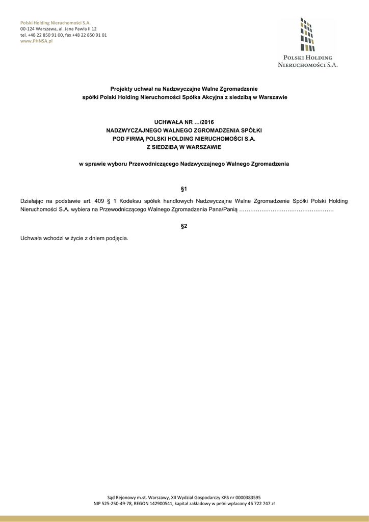 Polski Holding Nieruchomości S.A. 00-124 Warszawa, al. Jana Pawła II 12 tel. +48 22 850 91 00, fax +48 22 850 91 01 www.PHNSA.pl Projekty uchwał na Nadzwyczajne Walne Zgromadzenie spółki Polski Holding Nieruchomości Spółka Akcyjna z siedzibą w Warszawie UCHWAŁA NR …/2016 NADZWYCZAJNEGO WALNEGO ZGROMADZENIA SPÓŁKI POD FIRMĄ POLSKI HOLDING NIERUCHOMOŚCI S.A. Z SIEDZIBĄ W WARSZAWIE w sprawie wyboru Przewodniczącego Nadzwyczajnego Walnego Zgromadzenia §1 Działając na podstawie art. 409 § 1 Kodeksu spółek handlowych Nadzwyczajne Walne Zgromadzenie Spółki Polski Holding Nieruchomości S.A. wybiera na Przewodniczącego Walnego Zgromadzenia Pana/Panią …………………………………………… §2 Uchwała wchodzi w życie z dniem podjęcia. Sąd Rejonowy m.st. Warszawy, XII Wydział Gospodarczy KRS nr 0000383595 NIP 525-250-49-78, REGON 142900541, kapitał zakładowy w pełni wpłacony 46 722 747 zł UCHWAŁA NR …/2016 NADZWYCZAJNEGO WALNEGO ZGROMADZENIA SPÓŁKI POD FIRMĄ POLSKI HOLDING NIERUCHOMOŚCI S.A. Z SIEDZIBĄ W WARSZAWIE w sprawie ustalenia zasad kształtowania wynagrodzeń Członków Zarządu Polskiego Holdingu Nieruchomości Spółka Akcyjna Działając na podstawie art. 2 ust. 2 pkt 1, art. 4, art. 5, art. 6, art. 7 i art. 8 ustawy z dnia 9 czerwca 2016 r. o zasadach kształtowania wynagrodzeń osób kierujących niektórymi spółkami (Dz. U. z 2016 r. poz. 1202) oraz § 24 Statutu Polskiego Holdingu Nieruchomości S.A. Walne Zgromadzenie Spółki Polski Holding Nieruchomości Spółka Akcyjna (Spółka) uchwala, co następuje: §1 1. Z Członkiem Zarządu Spółki zawierana jest umowa o świadczenie usług zarzadzania na czas pełnienia funkcji (Umowa), z obowiązkiem świadczenia osobistego, bez względu na to, czy działa on w zakresie prowadzonej działalności gospodarczej. 2. Treść Umowy określa Rada Nadzorcza na warunkach określonych w ustawie z dnia 9 czerwca 2016 r. o zasadach kształtowania wynagrodzeń osób kierujących niektórymi spółkami (Ustawa) oraz zgodnie z postanowieniami niniejszej uchwały. §2 1. Wynagrodzenie całkowite Członka Zarządu Spółki składa się z części stałej, stanowiącej wynagrodzenie miesięczne podstawowe (Wynagrodzenie Stałe) oraz części zmiennej, stanowiącej wynagrodzenie uzupełniające za rok obrotowy Spółki (Wynagrodzenie Zmienne). 2. Miesięczne Wynagrodzenie Stałe dla poszczególnych członków Zarządu Spółki zawiera się w przedziale od ………………………. do ……………………….. przeciętnego miesięcznego wynagrodzenia w sektorze przedsiębiorstw bez wypłat nagród z zysku w czwartym kwartale roku poprzedniego, ogłoszonego przez Prezesa Głównego Urzędu Statystycznego. 3. Upoważnia się Radę Nadzorczą Spółki do określenia kwotowo Wynagrodzenia Stałego dla poszczególnych członków Zarządu zgodnie z postanowieniami ust. 2. §3 1. Wynagrodzenie Zmienne jest uzależnione od poziomu …………………………… % Wynagrodzenia Stałego. realizacji Celów Zarządczych i nie może przekroczyć 2. Ustala się Cele Zarządcze stanowiące w szczególności o: restrukturyzacji spółki lub wzroście wartości spółki, poprawie wskaźników ekonomiczno-finansowych. 3. Upoważnia się Radę Nadzorczą Spółki do uszczegółowienia Celów Zarządczych, o których mowa w ust. 2, a także do określenia Wag dla tych Celów oraz obiektywnych i mierzalnych kryteriów (wskaźników) ich realizacji i rozliczania (KPI). Dla obiektywnych i mierzalnych kryteriów realizacji i rozliczenia Celów ustala się 90% Wag, co w tym zakresie stanowi o roszczeniowym charakterze Wynagrodzenia Zmiennego, z zastrzeżeniem ust 6. 4. Jako odrębny cel, warunkujący możliwość otrzymania części zmiennej wynagrodzenia, stanowiącej wynagrodzenie uzupełniające za rok obrotowy Spółki, określa się ukształtowanie i stosowanie zasad wynagradzania członków organów zarządzających i nadzorczych podmiotów zależnych odpowiadających zasadom określonym w Ustawie. 5. Spełnienie warunków Wynagrodzenia Zmiennego poszczególnych członków Zarządu, dla których na dany rok obrotowy ustalone zostały Cele Zarządcze i którzy pełnili funkcje w ocenianym roku obrotowym, RN stwierdza, określając należną kwotę, w oparciu o zweryfikowane przez biegłych sprawozdania finansowe oraz inne dokumenty w zależności od wyznaczonych Celów, z zastrzeżeniem ust 6. Sąd Rejonowy m.st. Warszawy, XII Wydział Gospodarczy KRS nr 0000383595 NIP 525-250-49-78, REGON 142900541, kapitał zakładowy w pełni wpłacony 46 722 747 zł 6. Wynagrodzenie Zmienne przysługuje, po zatwierdzeniu sprawozdania Zarządu z działalności Spółki oraz sprawozdania finansowego za ubiegły rok obrotowy i udzieleniu temu członkowi absolutorium z wykonania przez niego obowiązków przez Walne Zgromadzenie. §4 1. Umowa zawiera obowiązek informowania przez Członka Zarządu o zamiarze pełnienia funkcji w organach innej spółki handlowej, nabyciu w niej akcji oraz może przewidywać zakaz pełnienia funkcji w organach jakiejkolwiek innej spółki handlowej lub wprowadzać inne ograniczenia dotyczące dodatkowej działalności Członka Zarządu. 2. Członek Zarządu nie może pobierać wynagrodzenia z tytułu pełnienia funkcji członka organu w podmiotach zależnych od Spółki w ramach grupy kapitałowej w rozumieniu art. 4 pkt 14 ustawy z dnia 16 lutego 2007 r. o ochronie konkurencji i konsumentów. 3. Upoważnia się Radę Nadzorczą do określenia zakazów i ograniczeń, o których mowa w ust 1 i 2 powyżej, obowiązków sprawozdawczych z ich wykonania oraz sankcji za nienależyte wykonanie. §5 1. Rada Nadzorcza określi w Umowie zakres i zasady udostępniania Członkowi Zarządu urządzeń technicznych oraz zasobów stanowiących mienie Spółki, niezbędnych do wykonywania funkcji, a także limity albo sposób ich określania dotyczące kosztów, jakie Spółka ponosi w związku z udost