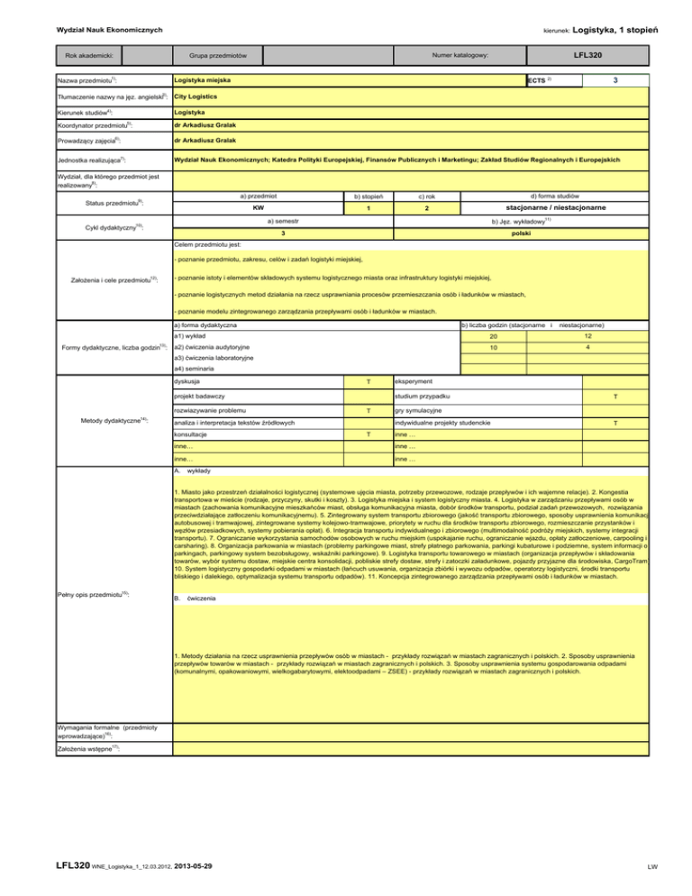 Wydział Nauk Ekonomicznych kierunek: Rok akademicki: Nazwa przedmiotu1): LFL320 Numer katalogowy: Grupa przedmiotów Logistyka, 1 stopień 3 ECTS 2) Logistyka miejska 3) Tłumaczenie nazwy na jęz. angielski : City Logistics Kierunek studiów4): Logistyka 5) Koordynator przedmiotu : dr Arkadiusz Gralak Prowadzący zajęcia6): dr Arkadiusz Gralak Jednostka realizująca7): Wydział Nauk Ekonomicznych; Katedra Polityki Europejskiej, Finansów Publicznych i Marketingu; Zakład Studiów Regionalnych i Europejskich Wydział, dla którego przedmiot jest realizowany8): Status przedmiotu9): a) przedmiot b) stopień c) rok d) forma studiów KW 1 2 stacjonarne / niestacjonarne Cykl dydaktyczny10): a) semestr b) Jęz. wykładowy11) 3 polski Celem przedmiotu jest: - poznanie przedmiotu, zakresu, celów i zadań logistyki miejskiej, Założenia i cele przedmiotu12): - poznanie istoty i elementów składowych systemu logistycznego miasta oraz infrastruktury logistyki miejskiej, - poznanie logistycznych metod działania na rzecz usprawniania procesów przemieszczania osób i ładunków w miastach, - poznanie modelu zintegrowanego zarządzania przepływami osób i ładunków w miastach. a) forma dydaktyczna Formy dydaktyczne, liczba godzin13): b) liczba godzin (stacjonarne i niestacjonarne) a1) wykład 20 12 a2) ćwiczenia audytoryjne 10 4 a3) ćwiczenia laboratoryjne a4) seminaria dyskusja T projekt badawczy rozwiazywanie problemu Metody dydaktyczne14): T gry symulacyjne T inne … analiza i interpretacja tekstów źródłowych konsultacje eksperyment studium przypadku indywidualne projekty studenckie inne… inne … inne… inne … A. T T wykłady 1. Miasto jako przestrzeń działalności logistycznej (systemowe ujęcia miasta, potrzeby przewozowe, rodzaje przepływów i ich wajemne relacje). 2. Kongestia transportowa w mieście (rodzaje, przyczyny, skutki i koszty). 3. Logistyka miejska i system logistyczny miasta. 4. Logistyka w zarządzaniu przepływami osób w miastach (zachowania komunikacyjne mieszkańców miast, obsługa komunikacyjna miasta, dobór środków transportu, podział zadań przewozowych, rozwiązania przeciwdziałające zatłoczeniu komunikacyjnemu). 5. Zintegrowany system transportu zbiorowego (jakość transportu zbiorowego, sposoby usprawnienia komunikacji autobusowej i tramwajowej, zintegrowane systemy kolejowo-tramwajowe, priorytety w ruchu dla środków transportu zbiorowego, rozmieszczanie przystanków i węzłów przesiadkowych, systemy pobierania opłat). 6. Integracja transportu indywidualnego i zbiorowego (multimodalność podróży miejskich, systemy integracji transportu). 7. Ograniczanie wykorzystania samochodów osobowych w ruchu miejskim (uspokajanie ruchu, ograniczanie wjazdu, opłaty zatłoczeniowe, carpooling i carsharing). 8. Organizacja parkowania w miastach (problemy parkingowe miast, strefy płatnego parkowania, parkingi kubaturowe i podziemne, system informacji o parkingach, parkingowy system bezobsługowy, wskaźniki parkingowe). 9. Logistyka transportu towarowego w miastach (organizacja przepływów i składowania towarów, wybór systemu dostaw, miejskie centra konsolidacji, pobliskie strefy dostaw, strefy i zatoczki załadunkowe, pojazdy przyjazne dla środowiska, CargoTram) 10. System logistyczny gospodarki odpadami w miastach (łańcuch usuwania, organizacja zbiórki i wywozu odpadów, operatorzy logistyczni, środki transportu bliskiego i dalekiego, optymalizacja systemu transportu odpadów). 11. Koncepcja zintegrowanego zarządzania przepływami osób i ładunków w miastach. Pełny opis przedmiotu15): B. ćwiczenia 1. Metody działania na rzecz usprawnienia przepływów osób w miastach - przykłady rozwiązań w miastach zagranicznych i polskich. 2. Sposoby usprawnienia przepływów towarów w miastach - przykłady rozwiązań w miastach zagranicznych i polskich. 3. Sposoby usprawnienia systemu gospodarowania odpadami (komunalnymi, opakowaniowymi, wielkogabarytowymi, elektoodpadami – ZSEE) - przykłady rozwiązań w miastach zagranicznych i polskich. Wymagania formalne (przedmioty wprowadzające)16): Założenia wstępne17): LFL320 WNE_Logistyka_1_12.03.2012, 2013-05-29 LW Wydział Nauk Ekonomicznych Efekty kształcenia18): (z kolejnymi numerami, 01, 02, 03 itd.) kierunek: 01 - identyfikuje i charakteryzuje problemy związane z przepływami osób i ładunków w mieście 05 - 02 - charakteryzuje i ocenia poszczególne rozwiązania przeciwdziałające kongestii transportowej w miastach 06 - 03 - dobiera i prezentuje rozwiązania logistyczne usprawniające przepływy 07 osób i ładunków w wybranym mieście 04 - planuje działania w zakresie koordynacji i integracji przepływów w miastach 08 - kolokwium na zajęciach ćwiczeniowych ocena wykonanie zadania projektowego na zdefiniowany temat 1, 2 praca pisemna przygotowywana w ramach pracy własnej studenta ocena wystąpień i prezentacji w trakcie zajęć 3 test komputerowy egzamin ustny inne.. inne… inne.. złożone projekty Element oceny kolokwium na zajęciach ćwiczeniowych treść pytań egzaminacyjnych z oceną inne.. T Waga w % 30% praca pisemna przygotowywana w ramach pracy własnej studenta inne.. Element oceny ocena wykonania zadania projektowego na zdefiniowany temat Waga w % 40% ocena wynikająca z obserwacji w trakcie zajęć ocena eksperymentów wykonywanych w trakcie zajęć przygotowanie zespołowej analizy zdefiniowanego problemu ocena wystąpień i prezentacji w trakcie zajęć obserwacja w trakcie dyskusji zdefiniowanego problemu (aktywność) 20% egzamin pisemny test egzamin ustny inne.. inne… Miejsce realizacji zajęć22): 4 imienne karty oceny studenta T prace egzaminacyjne z oceną kolokwia z oceną Elementy i wagi mające wpływ na ocenę końcową21): przygotowanie zespołowej analizy zdefiniowanego problemu obserwacja w trakcie dyskusji zdefiniowanego problemu (aktywność) egzamin pisemny okresowe prace pisemne Forma dokumentacji osiągniętych efektów kształcenia