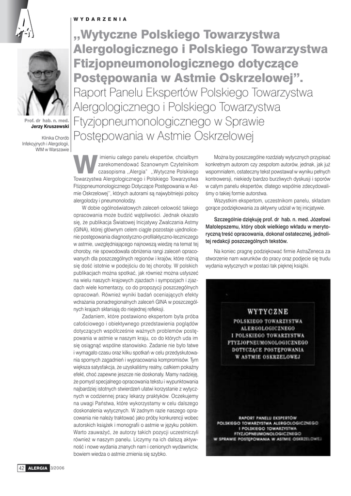 W Y D A R Z E N I A Prof. dr hab. n. med. Jerzy Kruszewski Klinika Chorób Infekcyjnych i Alergologii, WIM w Warszawie ,,Wytyczne Polskiego Towarzystwa Alergologicznego i Polskiego Towarzystwa Ftizjopneumonologicznego dotyczące Postępowania w Astmie Oskrzelowej’’. Raport Panelu Ekspertów Polskiego Towarzystwa Alergologicznego i Polskiego Towarzystwa Ftyzjopneumonologicznego w Sprawie Postępowania w Astmie Oskrzelowej W imieniu całego panelu ekspertów, chciałbym zarekomendować Szanownym Czytelnikom czasopisma ,,Alergia” ,,Wytyczne Polskiego Towarzystwa Alergologicznego i Polskiego Towarzystwa Ftizjopneumonologicznego Dotyczące Postępowania w Astmie Oskrzelowej’’, których autorami są najwybitniejsi polscy alergolodzy i pneumonolodzy. W dobie ogólnoświatowych zaleceń celowość takiego opracowania może budzić wątpliwości. Jednak okazało się, że publikacja Światowej Inicjatywy Zwalczania Astmy (GINA), której głównym celem ciągle pozostaje ujednolicenie postępowania diagnostyczno-profilaktyczno-leczniczego w astmie, uwzględniającego najnowszą wiedzę na temat tej choroby, nie spowodowała obniżenia rangi zaleceń opracowanych dla poszczególnych regionów i krajów, które różnią się dość istotnie w podejściu do tej choroby. W polskich publikacjach można spotkać, jak również można usłyszeć na wielu naszych krajowych zjazdach i sympozjach i zjazdach wiele komentarzy, co do propozycji poszczególnych opracowań. Również wyniki badań oceniających efekty wdrażania ponadregionalnych zaleceń GINA w poszczególnych krajach skłaniają do niejednej refleksji. Zadaniem, które postawiono ekspertom była próba całościowego i obiektywnego przedstawienia poglądów dotyczących współcześnie ważnych problemów postępowania w astmie w naszym kraju, co do których uda im się osiągnąć wspólne stanowisko. Zadanie nie było łatwe i wymagało czasu oraz kilku spotkań w celu przedyskutowania spornych zagadnień i wypracowania kompromisów. Tym większa satysfakcja, że uzyskaliśmy realny, całkiem pokaźny efekt, choć zapewne jeszcze nie doskonały. Mamy nadzieję, że pomysł specjalnego opracowania tekstu i wypunktowania najbardziej istotnych stwierdzeń ułatwi korzystanie z wytycznych w codziennej pracy lekarzy praktyków. Oczekujemy na uwagi Państwa, które wykorzystamy w celu dalszego doskonalenia wytycznych. W żadnym razie naszego opracowania nie należy traktować jako próby konkurencji wobec autorskich książek i monografii o astmie w języku polskim. Warto zauważyć, że autorzy takich pozycji uczestniczyli również w naszym panelu. Liczymy na ich dalszą aktywność i nowe wydania znanych nam i cenionych wydawnictw, bowiem wiedza o astmie zmienia się szybko. 42 ALERGIA 3/2006 Można by poszczególne rozdziały wytycznych przypisać konkretnym autorom czy zespołom autorów, jednak, jak już wspomniałem, ostateczny tekst powstawał w wyniku pełnych kontrowersji, niekiedy bardzo burzliwych dyskusji i sporów w całym panelu ekspertów, dlatego wspólnie zdecydowaliśmy o takiej formie autorstwa. Wszystkim ekspertom, uczestnikom panelu, składam gorące podziękowania za aktywny udział w tej inicjatywie. Szczególnie dziękuję prof. dr hab. n. med. Józefowi Małolepszemu, który obok wielkiego wkładu w merytoryczną treść opracowania, dokonał ostatecznej, jednolitej redakcji poszczególnych tekstów. Na koniec pragnę podziękować firmie AstraZeneca za stworzenie nam warunków do pracy oraz podjecie się trudu wydania wytycznych w postaci tak pięknej książki. Polfa Warszawa SA www.polfawar.com.pl e-mail: [email protected]