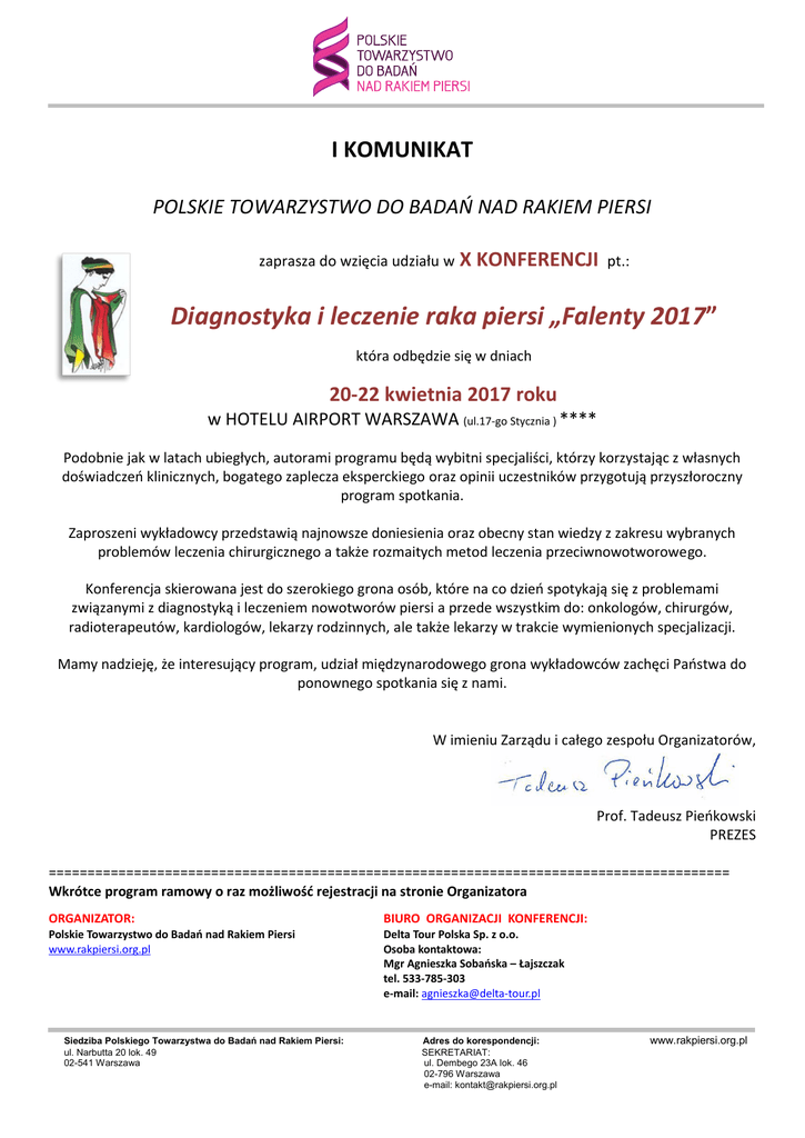 I KOMUNIKAT POLSKIE TOWARZYSTWO DO BADAO NAD RAKIEM PIERSI zaprasza do wzięcia udziału w X KONFERENCJI pt.: Diagnostyka i leczenie raka piersi „Falenty 2017” która odbędzie się w dniach 20-22 kwietnia 2017 roku w HOTELU AIRPORT WARSZAWA (ul.17-go Stycznia ) **** Podobnie jak w latach ubiegłych, autorami programu będą wybitni specjaliści, którzy korzystając z własnych doświadczeo klinicznych, bogatego zaplecza eksperckiego oraz opinii uczestników przygotują przyszłoroczny program spotkania. Zaproszeni wykładowcy przedstawią najnowsze doniesienia oraz obecny stan wiedzy z zakresu wybranych problemów leczenia chirurgicznego a także rozmaitych metod leczenia przeciwnowotworowego. Konferencja skierowana jest do szerokiego grona osób, które na co dzieo spotykają się z problemami związanymi z diagnostyką i leczeniem nowotworów piersi a przede wszystkim do: onkologów, chirurgów, radioterapeutów, kardiologów, lekarzy rodzinnych, ale także lekarzy w trakcie wymienionych specjalizacji. Mamy nadzieję, że interesujący program, udział międzynarodowego grona wykładowców zachęci Paostwa do ponownego spotkania się z nami. W imieniu Zarządu i całego zespołu Organizatorów, Prof. Tadeusz Pieokowski PREZES ======================================================================================== Wkrótce program ramowy o raz możliwośd rejestracji na stronie Organizatora ORGANIZATOR: BIURO ORGANIZACJI KONFERENCJI: Polskie Towarzystwo do Badao nad Rakiem Piersi www.rakpiersi.org.pl Delta Tour Polska Sp. z o.o. Osoba kontaktowa: Mgr Agnieszka Sobaoska – Łajszczak tel. 533-785-303 e-mail: [email protected] Siedziba Polskiego Towarzystwa do Badań nad Rakiem Piersi: ul. Narbutta 20 lok. 49 02-541 Warszawa Adres do korespondencji: SEKRETARIAT: ul. Dembego 23A lok. 46 02-796 Warszawa e-mail: [email protected] www.rakpiersi.org.pl