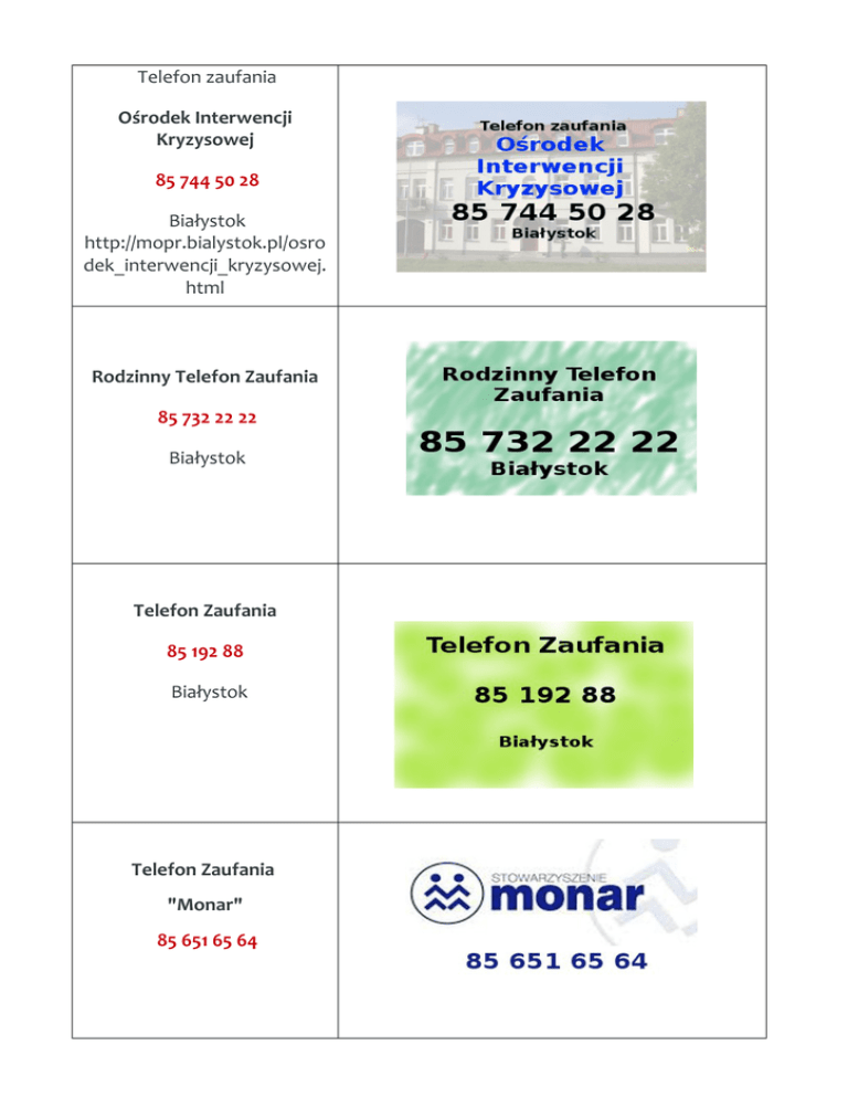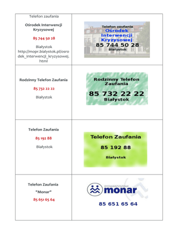 Telefon zaufania Ośrodek Interwencji Kryzysowej 85 744 50 28 Białystok http://mopr.bialystok.pl/osro dek_interwencji_kryzysowej. html Rodzinny Telefon Zaufania 85 732 22 22 Białystok Telefon Zaufania 85 192 88 Białystok Telefon Zaufania "Monar" 85 651 65 64 Adopcyjny Telefon Zaufania 22 827 50 23 adopcjatpd.pl [email protected] Antydepresyjny Telefon Zaufania Centrum Itaka 22 654 40 41 stopdepresji.pl [email protected] Antynarkotykowy Telefon Zaufania 801 199 990 www.kbpn.gov.pl [email protected] Dziecięcy Telefon Zaufania Rzecznika Praw Dziecka 800 121 212 www.brpd.gov.pl [email protected] Infolinia AA 801 033 242 www.aa.org.pl Młodzieżowy (i nie tylko) Telefon Zaufania 22 192 88 www.mtz.waw.pl [email protected] Niebieska Linia Ogólnopolskie Pogotowie dla Ofiar Przemocy w Rodzinie 801 120 002 www.niebieskalinia.info niebieskalinia@niebieskalinia. info Pomarańczowa Linia - dla Rodziców Pijących Dzieci 801 140 068 pomaranczowalinia.pl pomoc@pomaranczowalinia. pl Poradnia Telefoniczna dla Osób Dorosłych w Kryzysie Emocjonalnym 116 12 3 www.116123.edu.pl [email protected] http://www.psychologia.edu. pl/kryzysy-osobiste/telefonkryzysowy-116123.html Telefon w Sprawie Zaginionego Dziecka 116 00 0 www.nieuciekaj.pl [email protected] Telefon Zaufania dla Dzieci i Młodzieży 116 111 www.116111.pl [email protected] Telefon Zaufania dla Zaginionych i ich Rodzin Fundacji Itaka (z telefonów komórkowych) 22 654 70 70 www.zaginieni.pl [email protected] Uzależnienia Behawioralne Hazard, Pracoholizm, Zakupoholizm, Seksoholizm 801 889 880 uzaleznieniabehawioralne.pl [email protected] Telefon Zaufania Zielona Linia HIV/AIDS 22 621 33 67 reshumanae.org.pl [email protected] rg.pl