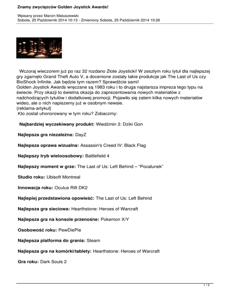 Wczoraj wieczorem już po raz 32 rozdano Złote Joysticki! W zeszłym roku tytuł dla najlepszej