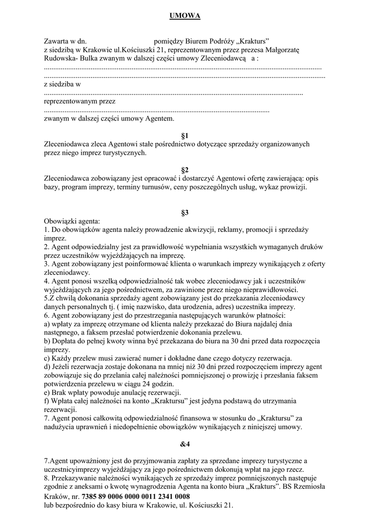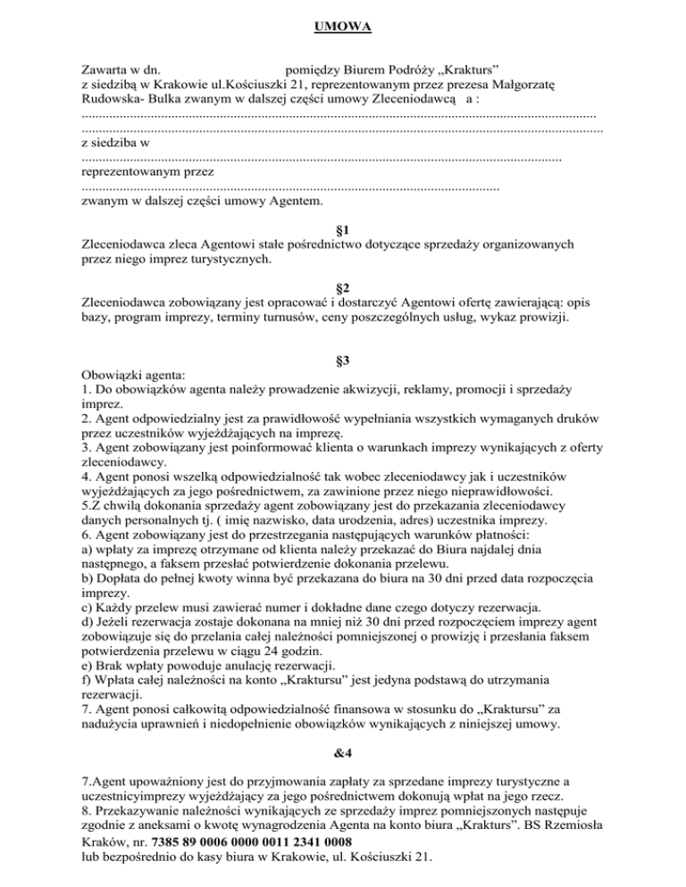 UMOWA Zawarta w dn. pomiędzy Biurem Podróży „Krakturs” z siedzibą w Krakowie ul.Kościuszki 21, reprezentowanym przez prezesa Małgorzatę Rudowska- Bulka zwanym w dalszej części umowy Zleceniodawcą a : ..................................................................................................................................................... ....................................................................................................................................................... z siedziba w ........................................................................................................................................... reprezentowanym przez ......................................................................................................................... zwanym w dalszej części umowy Agentem. §1 Zleceniodawca zleca Agentowi stałe pośrednictwo dotyczące sprzedaży organizowanych przez niego imprez turystycznych. §2 Zleceniodawca zobowiązany jest opracować i dostarczyć Agentowi ofertę zawierającą: opis bazy, program imprezy, terminy turnusów, ceny poszczególnych usług, wykaz prowizji. §3 Obowiązki agenta: 1. Do obowiązków agenta należy prowadzenie akwizycji, reklamy, promocji i sprzedaży imprez. 2. Agent odpowiedzialny jest za prawidłowość wypełniania wszystkich wymaganych druków przez uczestników wyjeżdżających na imprezę. 3. Agent zobowiązany jest poinformować klienta o warunkach imprezy wynikających z oferty zleceniodawcy. 4. Agent ponosi wszelką odpowiedzialność tak wobec zleceniodawcy jak i uczestników wyjeżdżających za jego pośrednictwem, za zawinione przez niego nieprawidłowości. 5.Z chwilą dokonania sprzedaży agent zobowiązany jest do przekazania zleceniodawcy danych personalnych tj. ( imię nazwisko, data urodzenia, adres) uczestnika imprezy. 6. Agent zobowiązany jest do przestrzegania następujących warunków płatności: a) wpłaty za imprezę otrzymane od klienta należy przekazać do Biura najdalej dnia następnego, a faksem przesłać potwierdzenie dokonania przelewu. b) Dopłata do pełnej kwoty winna być przekazana do biura na 30 dni przed data rozpoczęcia imprezy. c) Każdy przelew musi zawierać numer i dokładne dane czego dotyczy rezerwacja. d) Jeżeli rezerwacja zostaje dokonana na mniej niż 30 dni przed rozpoczęciem imprezy agent zobowiązuje się do przelania całej należności pomniejszonej o prowizję i przesłania faksem potwierdzenia przelewu w ciągu 24 godzin. e) Brak wpłaty powoduje anulację rezerwacji. f) Wpłata całej należności na konto „Kraktursu” jest jedyna podstawą do utrzymania rezerwacji. 7. Agent ponosi całkowitą odpowiedzialność finansowa w stosunku do „Kraktursu” za nadużycia uprawnień i niedopełnienie obowiązków wynikających z niniejszej umowy. &4 7.Agent upoważniony jest do przyjmowania zapłaty za sprzedane imprezy turystyczne a uczestnicyimprezy wyjeżdżający za jego pośrednictwem dokonują wpłat na jego rzecz. 8. Przekazywanie należności wynikających ze sprzedaży imprez pomniejszonych następuje zgodnie z aneksami o kwotę wynagrodzenia Agenta na konto biura „Krakturs”. BS Rzemiosła Kraków, nr. 7385 89 0006 0000 0011 2341 0008 lub bezpośrednio do kasy biura w Krakowie, ul. Kościuszki 21. §5 Prowizje Agenta są ustalane każdorazowo i wyszczególniane w każdej przesłanej ofercie – komunikacie dla Agenta. §6 Prowizja przysługuje Agentowi z chwilą przekazania należności zleceniodawcy i realizacji uczestnictwa w imprezie. §7 1.Klient może zrezygnować z udziału w imprezie z konsekwencjami wynikającymi z warunków uczestnictwa, składając pisemną rezygnacje. 2. Agent zobowiązany jest powiadomić natychmiast zleceniodawcę o wpłynięciu rezygnacji podając dane personalne uczestnika imprezy. 3. Zwrotu kosztów na rzecz klienta dokonuje agent. 4.W przypadku rezygnacji klienta agentowi nie przysługuje prowizja. §8 „ Krakturs” zobowiązuje się do: 1.ostatecznego, pisemnego ( faksem) potwierdzenia każdego otrzymanego zgłoszenia w ciągu 24 –godzin od jej otrzymania. 2. zapewnienia świadczeń zgodnie z wszystkimi informacjami, zasadami, i cenami zawartymi wprzesłanych ofertach i materiałach. 3. Bezpłatnego dostarczenia do Agentów materiałów i cenników. 4. Informowania Agenta o ewentualnych zmianach w ofercie. 5.Wystawiania skierowań ( voucherów) po dokonaniu przelewu całej kwoty. §9 Wszelkie zmiany niniejszej umowy wymagają formy pisemnej. § 10 W sprawach nieuregulowanych niniejszą umowa zastosowanie mają przepisy Kodeksu Cywilnego. §11 Niniejsza umowa zostaje zawarta na czas nieokreślony. Może zostać wypowiedziana przez każdą ze stron pisemnie z zachowaniem miesięcznego terminu wypowiedzenia. § 12 Krakturs może wypowiedzieć umowę bez zachowania ustalonego terminu ze skutkiem natychmiastowym z powodu nie wywiązania się agenta z postanowień umowy. § 13 Umowa została sporządzona w dwóch jednobrzmiących egzemplarzach po jednym dla każdej ze stron i wchodzi w życie z dniem podpisania przez obydwie strony. § 14 Krakturs oświadcza, że jest płatnikiem podatku VAT i posiada nr. identyfikacyjny NIP 676 – 00 – 09 – 872 i upoważnia Agenta na podstawie niniejszej umowy do wystawiania faktur VAT bez podpisu odbiorcy i przesłania ich za pośrednictwem poczty. §15 Agent ma obowiązek każdorazowo kontaktowaćsięz zleceniodawcą w celu uzyskania kursu przelicznika Euro na PLN w dniu pełnej wpłaty klienta za imprezę. AGENT ZLECENIODAWCA