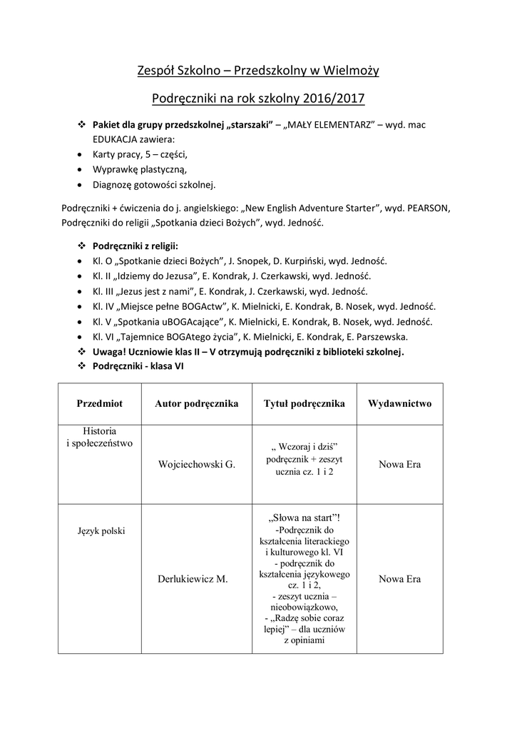 Zespół Szkolno – Przedszkolny w Wielmoży Podręczniki na rok szkolny 2016/2017 Pakiet dla grupy przedszkolnej „starszaki” – „MAŁY ELEMENTARZ” – wyd. mac EDUKACJA zawiera: Karty pracy, 5 – części, Wyprawkę plastyczną, Diagnozę gotowości szkolnej. Podręczniki + ćwiczenia do j. angielskiego: „New English Adventure Starter”, wyd. PEARSON, Podręczniki do religii „Spotkania dzieci Bożych”, wyd. Jedność. Podręczniki z religii: Kl. O „Spotkanie dzieci Bożych”, J. Snopek, D. Kurpiński, wyd. Jedność. Kl. II „Idziemy do Jezusa”, E. Kondrak, J. Czerkawski, wyd. Jedność. Kl. III „Jezus jest z nami”, E. Kondrak, J. Czerkawski, wyd. Jedność. Kl. IV „Miejsce pełne BOGActw”, K. Mielnicki, E. Kondrak, B. Nosek, wyd. Jedność. Kl. V „Spotkania uBOGAcające”, K. Mielnicki, E. Kondrak, B. Nosek, wyd. Jedność. Kl. VI „Tajemnice BOGAtego życia”, K. Mielnicki, E. Kondrak, E. Parszewska. Uwaga! Uczniowie klas II – V otrzymują podręczniki z biblioteki szkolnej. Podręczniki - klasa VI Przedmiot Autor podręcznika Historia i społeczeństwo Wojciechowski G. Tytuł podręcznika „ Wczoraj i dziś” podręcznik + zeszyt ucznia cz. 1 i 2 Wydawnictwo Nowa Era „Słowa na start”! -Podręcznik do Język polski Derlukiewicz M. kształcenia literackiego i kulturowego kl. VI - podręcznik do kształcenia językowego cz. 1 i 2, - zeszyt ucznia – nieobowiązkowo, - „Radzę sobie coraz lepiej” – dla uczniów z opiniami Nowa Era Przyroda „Tajemnice przyrody” Marko-Worłowska M., Szafer F. Stawarz J. Podręcznik+ ćwiczenia Chodnicki J., Dąbrowski M., Pfeiffer A., Zawadowski W., … „Matematyka 2001” Podręcznik kl. VI + ćwiczenia WSiP Plastyka A. PrzybyszewskaPietrasiak „Ciekawi świata” dla kl. 4-6 OPERON Muzyka Gromek M., Klibach G. „Lekcje muzyki” – podręcznik + ćwiczenia Nowa Era Język angielski V. Evans, J. Dololey „ Starland 2”+ ćwiczenia Express Publishing Jochemczyk W., Krajewska-Kranas I., Kranas W., Samulska A., Wyczółkowski M. „Lekcje z komputerem 6” WSiP Wychowanie do życia w rodzinie pod red. T. Król Pracują w oparciu o: „Wędrując ku dorosłości” Wychowanie do życia w rodzinie dla uczniów kl. V, VI szkoły podstawowej. Podręcznik + zeszyt ćwiczeń Zajęcia techniczne Lech Łabecki, Marta Łabecka „ Jak to działa” 4-6 Matematyka Zajęcia komputerowe Nowa Era Rubikon Nowa Era
