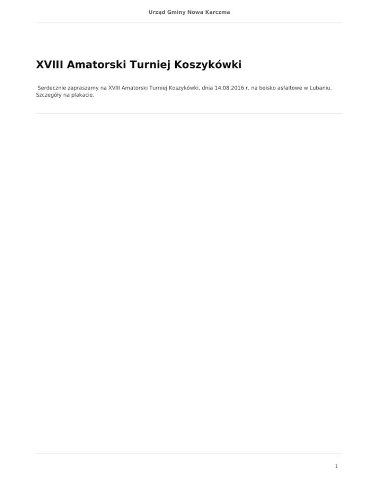 Urząd Gminy Nowa Karczma XVIII Amatorski Turniej Koszykówki Serdecznie zapraszamy na XVIII Amatorski Turniej Koszykówki, dnia 14.08.2016 r. na boisko asfaltowe w Lubaniu. Szczegóły na plakacie. 1