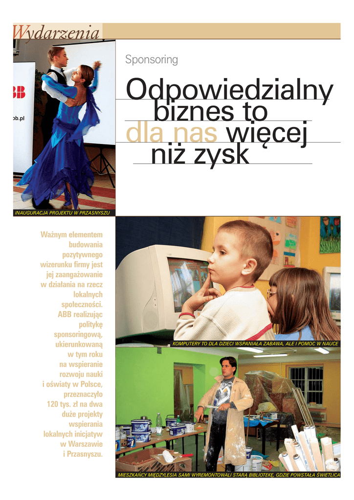 Wydarzenia Sponsoring Odpowiedzialny biznes to dla nas więcej niż zysk INAUGURACJA PROJEKTU W PRZASNYSZU Wa˝nym elementem budowania pozytywnego wizerunku firmy jest jej zaanga˝owanie w dzia∏ania na rzecz lokalnych spo∏ecznoÊci. ABB realizujàc polityk´ sponsoringowà, ukierunkowanà w tym roku na wspieranie rozwoju nauki i oÊwiaty w Polsce, przeznaczy∏o 120 tys. z∏ na dwa du˝e projekty wspierania lokalnych inicjatyw w Warszawie i Przasnyszu. KOMPUTERY TO DLA DZIECI WSPANIAŁA ZABAWA, ALE I POMOC W NAUCE MIESZKAŃCY MIĘDZYLESIA SAMI WYREMONTOWALI STARĄ BIBLIOTEKĘ, GDZIE POWSTAŁA ŚWIETLICA ENTUZJAZM I ZAANGAŻOWANIE W nowo wyremontowanej sto∏ówce Gimnazjum w Przasnyszu odby∏o si´ spotkanie informacyjne z w∏adzami miasta, mediami, klientami i partnerami ABB, jak równie˝ nauczycielami, rodzicami oraz samorzàdem uczniowskim. Wszyscy z entuzjazmem podeszli do nowego projektu. towarzyszenie na rzecz Dzieci i M∏odzie˝y „Od Serducha do Serducha” za∏o˝y∏o i prowadzi w Mi´dzylesiu Êwietlic´ Êrodowiskowo-integracyjnà. Powsta∏a ona obok warszawskiego Oddzia∏u ABB przy ul. ˚egaƒskiej, w budynku po dawnej bibliotece. Na terenie Mi´dzylesia, mimo, i˝ zamieszkuje je ok. 8000 osób nie istnieje ˝aden dom kultury czy klub m∏odzie˝owy. Coraz wi´cej dzieci czas sp´dza przed telewizorem lub na podwórku. Dzieci cz´sto nie jedzà ciep∏ego posi∏ku, nie odrabiajà lekcji, majà problemy z naukà. Âwietlica powsta∏a, aby pomóc m∏odzie˝y efektywnie zagospodarowaç ich wolny czas. Popierajàc t´ lokalnà inicjatyw´ firma ABB z poczàtkiem br. przy∏àczy∏a si´ do projektu i zosta∏a oficjalnym cz∏onkiem wspierajàcym stowarzyszenia. Na potrzeby Êwietlicy w tym roku przeka˝e 60 tys. z∏. W kwietniu firma podarowa∏a Êwietlicy dodatkowo dwanaÊcie komputerów. S W świetlicy prowadzone są zajęcia warsztatowe wspomagające rozwój dzieci, tj. trening zast´powania agresji ART. Funkcjonuje m.in. „Fabryka wyobraêni” – zaj´cia rozwijajàce zdolnoÊci manualne i pobudzajàce wyobraêni´; „Piksel” – zaj´cia informatyczne; „Mi´dzylesiak” – zaj´cia majàce na celu przybli˝enie dzieciom okolicy, w której ˝yjà; „Focus” – nauka fotografowania, „Talencik” – ko∏o literackie; „Profesorek” – ko∏o naukowe. W Êwietlicy dzieci uczà si´ trzech j´zyków: francuskiego, w∏oskiego i angielskiego. Âwietlica organizuje te˝ wyjazdy wakacyjne, wycieczki terenowe, rajdy. Dzieci i rodzice mogà liczyç na indywidualnà pomoc pedagogicznà i psychologicznà w Êwietlicy. Przasnysz to kolejne miasto, w którym ABB jest jednym z kluczowych pracodawców, dajàc zatrudnienie blisko 300 osobom. Na poczàtku br. wspólnie z przasnyskim Publicznym Gimnazjum ABB rozpocz´∏o realizacj´ projektu „Przedsi´biorczoÊç i sztuka autoprezentacji szansà na sukces”. W Gimnazjum uczy si´ prawie tysiàc m∏odych osób. Byç mo˝e cz´Êç z nich za kilka lub kilkanaÊcie lat rozpocznie prac´ w zak∏adzie koncernu. Ju˝ teraz ABB pragnie pomóc tej m∏odzie˝y i u∏atwiç jej start w doros∏e ˝ycie. W bie˝àcym roku firma przeka˝e 60 tys. z∏ na realizacj´ tego projektu. Równie wa˝nym wsparciem jest merytoryczny udzia∏ pracowników ABB w zaj´ciach i warsztatach dla m∏odzie˝y, podczas których dzielà si´ swojà wiedzà i doÊwiadczeniem. Dodatkowo firma przekaza∏a do Gimnazjum komputery w celu uruchomienia „kafejki internetowej”. Przez rok prowadzone b´dà pozalekcyjne zaj´cia z j´zyka angielskiego dla poczàtkujàcych i zaawansowanych. W soboty orga- nizowane sà warsztaty w ramach czterech sekcji: przedsi´biorczoÊci, medialnej, teatru i mody oraz filmu i fotografii. W ramach tych zaj´ç m∏odzie˝ pozna m.in. podstawowe poj´cia z dziedziny gospodarki rynkowej i inwestycji kapita∏owych, w praktyce zapozna si´ z zasadami savoir-vivre w biznesie. Spotka si´ z ciekawymi osobistoÊciami Êwiata biznesu, nauki i sztuki. Projekt powstał w oparciu o szereg dyskusji i spotkań z przedstawicielami lokalnej spo∏ecznoÊci, w∏adz miasta, nauczycieli, samorzàdu uczniowskiego i kadry ABB. Dzi´ki organizacji zaj´ç zgodnych z oczekiwaniami uczniów, do udzia∏u w programie zg∏osi∏a si´ ponad po∏owa szko∏y, czyli ponad 500 m∏odych osób. Lokalna prasa bardzo przychylnie opisa∏a t´ inicjatyw´. Program wzbudza bardzo du˝e zainteresowanie nie tylko wÊród m∏odzie˝y, ale tak˝e w ró˝nych Êrodowiskach lokalnych. Beata Syczewska ARTZWIERZ towarzyszenie „Od Serducha S do Serducha” rozpocz´∏o projekt ARTZWIERZ, który umo˝liwia m∏odzie˝y kontakt z naturà. Grupa 50 dzieci z Mi´dzylesia raz w tygodniu uczy si´ jeêdziç konno w stadninie w Józefowie. Dzieci uczestniczà te˝ w zaj´ciach w Êwietlicy. Zorganizowano dla nich warsztaty: dziennikarskie, filmowe, fotograficzne, plastyczne i muzyczno-teatralne. Dzieci przygotowujà film, gazetk´ oraz prace plastyczne dokumentujàc wyjazdy do stadniny oraz ˝ycie „Êwietlicowe”.