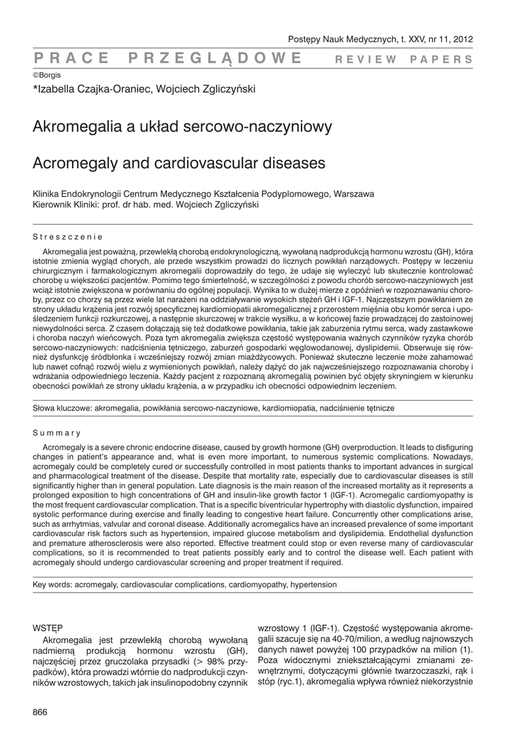 Postępy Nauk Medycznych, t. XXV, nr 11, 2012 prace przeglądowe RE v i e w papers ©Borgis *Izabella Czajka-Oraniec, Wojciech Zgliczyński Akromegalia a układ sercowo-naczyniowy Acromegaly and cardiovascular diseases Klinika Endokrynologii Centrum Medycznego Kształcenia Podyplomowego, Warszawa Kierownik Kliniki: prof. dr hab. med. Wojciech Zgliczyński Streszczenie Akromegalia jest poważną, przewlekłą chorobą endokrynologiczną, wywołaną nadprodukcją hormonu wzrostu (GH), która istotnie zmienia wygląd chorych, ale przede wszystkim prowadzi do licznych powikłań narządowych. Postępy w leczeniu chirurgicznym i farmakologicznym akromegalii doprowadziły do tego, że udaje się wyleczyć lub skutecznie kontrolować chorobę u większości pacjentów. Pomimo tego śmiertelność, w szczególności z powodu chorób sercowo-naczyniowych jest wciąż istotnie zwiększona w porównaniu do ogólnej populacji. Wynika to w dużej mierze z opóźnień w rozpoznawaniu choroby, przez co chorzy są przez wiele lat narażeni na oddziaływanie wysokich stężeń GH i IGF-1. Najczęstszym powikłaniem ze strony układu krążenia jest rozwój specyficznej kardiomiopatii akromegalicznej z przerostem mięśnia obu komór serca i upośledzeniem funkcji rozkurczowej, a następnie skurczowej w trakcie wysiłku, a w końcowej fazie prowadzącej do zastoinowej niewydolności serca. Z czasem dołączają się też dodatkowe powikłania, takie jak zaburzenia rytmu serca, wady zastawkowe i choroba naczyń wieńcowych. Poza tym akromegalia zwiększa częstość występowania ważnych czynników ryzyka chorób sercowo-naczyniowych: nadciśnienia tętniczego, zaburzeń gospodarki węglowodanowej, dyslipidemii. Obserwuje się również dysfunkcję śródbłonka i wcześniejszy rozwój zmian miażdżycowych. Ponieważ skuteczne leczenie może zahamować lub nawet cofnąć rozwój wielu z wymienionych powikłań, należy dążyć do jak najwcześniejszego rozpoznawania choroby i wdrażania odpowiedniego leczenia. Każdy pacjent z rozpoznaną akromegalią powinien być objęty skryningiem w kierunku obecności powikłań ze strony układu krążenia, a w przypadku ich obecności odpowiednim leczeniem. Słowa kluczowe: akromegalia, powikłania sercowo-naczyniowe, kardiomiopatia, nadciśnienie tętnicze Summary Acromegaly is a severe chronic endocrine disease, caused by growth hormone (GH) overproduction. It leads to disfiguring changes in patient’s appearance and, what is even more important, to numerous systemic complications. Nowadays, acromegaly could be completely cured or successfully controlled in most patients thanks to important advances in surgical and pharmacological treatment of the disease. Despite that mortality rate, especially due to cardiovascular diseases is still significantly higher than in general population. Late diagnosis is the main reason of the increased mortality as it represents a prolonged exposition to high concentrations of GH and insulin-like growth factor 1 (IGF-1). Acromegalic cardiomyopathy is the most frequent cardiovascular complication. That is a specific biventricular hypertrophy with diastolic dysfunction, impaired systolic performance during exercise and finally leading to congestive heart failure. Concurrently other complications arise, such as arrhytmias, valvular and coronal disease. Additionally acromegalics have an increased prevalence of some important cardiovascular risk factors such as hypertension, impaired glucose metabolism and dyslipidemia. Endothelial dysfunction and premature atherosclerosis were also reported. Effective treatment could stop or even reverse many of cardiovascular complications, so it is recommended to treat patients possibly early and to control the disease well. Each patient with acromegaly should undergo cardiovascular screening and proper treatment if required. Key words: acromegaly, cardiovascular complications, cardiomyopathy, hypertension WSTĘP Akromegalia jest przewlekłą chorobą wywołaną nadmierną produkcją hormonu wzrostu (GH), najczęściej przez gruczolaka przysadki (> 98% przypadków), która prowadzi wtórnie do nadprodukcji czynników wzrostowych, takich jak insulinopodobny czynnik 866 wzrostowy 1 (IGF-1). Częstość występowania akromegalii szacuje się na 40-70/milion, a według najnowszych danych nawet powyżej 100 przypadków na milion (1). Poza widocznymi zniekształcającymi zmianami zewnętrznymi, dotyczącymi głównie twarzoczaszki, rąk i stóp (ryc.1), akromegalia wpływa również niekorzystnie Akromegalia a układ sercowo-naczyniowy na narządy wewnętrzne i istotnie skraca długość życia pacjentów. Szacuje się, że średnia długość życia może być krótsza nawet o 10 lat w porównaniu do populacji ogólnej (2). Wynika to w większości przypadków ze znacznego, zwykle wieloletniego opóźnienia w rozpoznawaniu choroby w stosunku do wystąpienia nadmiernej produkcji GH. Jest to skutkiem powolnego i podstępnego rozwoju objawów, które początkowo są nieznaczne i dość niespecyficzne, natomiast objawy związane z masą guza i zaburzenia widzenia pojawiają się stosunkowo późno (3). Wieloletnia nieleczona lub nieskutecznie leczona akromegalia prowadzi do licznych powikłań układowych, które mogą istotnie zwiększać chorobowość, obniżać jakość życia, a także około 2-krotnie zwiększać śmiertelność w porównaniu do populacji ogólnej (4). Wśród głównych przyczyn zwiększonej śmiertelności znajdują się choroby sercowo-naczyniowe, które odpowiadają za około 60% zgonów pacjentów z akromegalią (5). Głównymi czynnikami predykcyjnymi zgonu z przyczyn sercowo-naczyniowych u pacjentów z akromegalią są: czas trwania choroby, wiek pacjenta, utrzymujące się podwyższone stężenia GH i IGF-1 oraz współwystępowanie nadciśnienia tętniczego, zaburzeń gospodarki węglowodanowej i lipidowej (4, 6-9). CHOROBY UKŁADU SERCOWO-NACZYNIOWEGO W AKROMEGALII Najczęsts