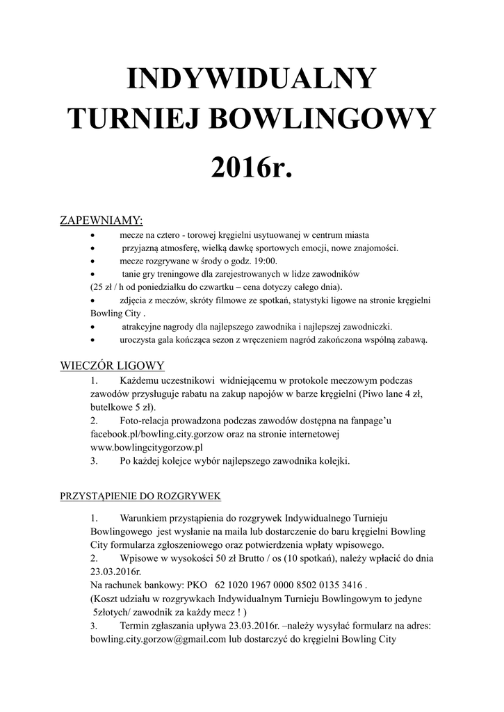 INDYWIDUALNY TURNIEJ BOWLINGOWY 2016r. ZAPEWNIAMY: mecze na cztero - torowej kręgielni usytuowanej w centrum miasta przyjazną atmosferę, wielką dawkę sportowych emocji, nowe znajomości. mecze rozgrywane w środy o godz. 19:00. tanie gry treningowe dla zarejestrowanych w lidze zawodników (25 zł / h od poniedziałku do czwartku – cena dotyczy całego dnia). zdjęcia z meczów, skróty filmowe ze spotkań, statystyki ligowe na stronie kręgielni Bowling City . atrakcyjne nagrody dla najlepszego zawodnika i najlepszej zawodniczki. uroczysta gala kończąca sezon z wręczeniem nagród zakończona wspólną zabawą. WIECZÓR LIGOWY 1. Każdemu uczestnikowi widniejącemu w protokole meczowym podczas zawodów przysługuje rabatu na zakup napojów w barze kręgielni (Piwo lane 4 zł, butelkowe 5 zł). 2. Foto-relacja prowadzona podczas zawodów dostępna na fanpage’u facebook.pl/bowling.city.gorzow oraz na stronie internetowej www.bowlingcitygorzow.pl 3. Po każdej kolejce wybór najlepszego zawodnika kolejki. PRZYSTĄPIENIE DO ROZGRYWEK 1. Warunkiem przystąpienia do rozgrywek Indywidualnego Turnieju Bowlingowego jest wysłanie na maila lub dostarczenie do baru kręgielni Bowling City formularza zgłoszeniowego oraz potwierdzenia wpłaty wpisowego. 2. Wpisowe w wysokości 50 zł Brutto / os (10 spotkań), należy wpłacić do dnia 23.03.2016r. Na rachunek bankowy: PKO 62 1020 1967 0000 8502 0135 3416 . (Koszt udziału w rozgrywkach Indywidualnym Turnieju Bowlingowym to jedyne 5złotych/ zawodnik za każdy mecz ! ) 3. Termin zgłaszania upływa 23.03.2016r. –należy wysyłać formularz na adres: [email protected] lub dostarczyć do kręgielni Bowling City w Gorzowie Wlkp. Formularze zgłoszeniowe można uzyskać przez wysłanie maila lub bezpośrednio w barze Kręgielni Bowling City. DODATKOWE INFORMACJE 1. Rozgrywki Indywidualnego Turnieju Bowlingowego organizowane przez kręgielnie Bowling City w Gorzowie Wlkp. mają charakter amatorski tzn. jego uczestnikami nie mogą być zawodnicy grający lub zgłoszeni do rozgrywek w zawodowej lidze Bowlingowej. 2. Mecz: Czas gry (ok. 2 godziny): 2 rundy dla zawodników, z których 1 najlepszy wyniki (suma punktów poszczególnego zawodnika z 1 lepiej rozegranej rundy) zaliczana są do klasyfikacji i wpływa na końcowy wynik. 3. Kręgielnia: Rozgrywki odbywać się będą na Kręgielni Bowling City w Gorzowie Wlkp. 4. Tory: mecze rozgrywane na trzech torach równorzędnie ( maksymalnie po 10 zawodników na torze). 5. Kule: Rozgrywki będą prowadzone kulami o różnej wadze. a tym samym rozmiarze – zawodnik sam decyduje o wadze kuli – nie dopuszczalne jest posiadanie własnej kuli. 6. Termin rozpoczęcia rozgrywek: 23 marzec 2016r.. 7. Termin rozgrywek: szczegóły zostaną podane na spotkaniu organizacyjnym przed rozpoczęciem rozgrywek w dniu 23 marca 2016r.. Odbędzie się 9 rozgrywek + Duży Finał. UWAGA!!! Termin zgłaszania upływa 23 marca 2016r. Do tego dnia: I. Wypełnij poniższy Formularz II. Wyślij go na adres [email protected] lub dostarcz do kręgielni Bowling City w Gorzowie Wlkp. III. Opłać wpisowe IV. Ciesz się rozgrywkami ! NAGRODY dla Pań: I miejsce – Zabieg mikrodermabrazji diamentowej twarzy w salonie kosmetycznym Elixir + 7dniowy karnet do wykorzystania w siłowni Nautilus II miejsce – Masaż klasyczny w salonie urody Be Beauty Marcin Przybysz III miejsce – Wymiana opon samochodowych w Agromie w Gorzowie Wlkp. NAGRODY dla Panów: I miejsce – sprawdzenie stanu zawieszenia oraz układu hamulcowego w Agromie w Gorzowie Wlkp. + 7dniowy karnet do wykorzystania w siłowni Nautilus II miejsce – Wymiana opon samochodowych w Agromie w Gorzowie Wlkp. III miejsce – Voucher o wartości 50 zł do wykorzystania w pizzerii Bosfor Zgłoszenie Indywidualny Turniej Bowlingowy 2016r. Zawodnik: Lp. Imię i nazwisko Numer telefonu podpis 1 Powyższe złożone podpisy zawodników stanowią oświadczenie, że składająca go osoba zapoznała się z regulaminem Kręgielni Bowling City w Gorzowie Wlkp. (zamieszczonym na stronie internetowej www.bowlingcitygorzow.pl/regulamin oraz w kręgielni Bowling City) i zobowiązuje się do jego przestrzegania raz wyraża zgodę na udział w turnieju na własną odpowiedzialność. Ponadto zawodnicy oświadczają, iż wyrażają zgodę na umieszczenie swoich danych i zdjęć na stronie internetowej kręgielni Bowling City www.bowlingcitygorzow.pl oraz na fanpage’u Bowling City www.facebook.com/bowling.city.gorzow .