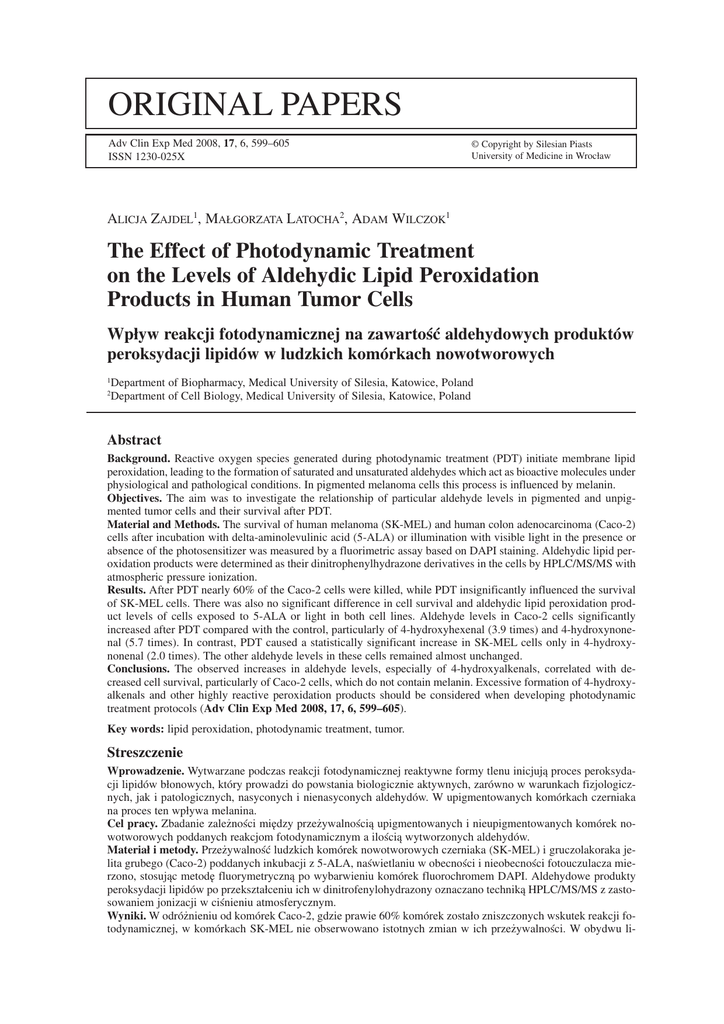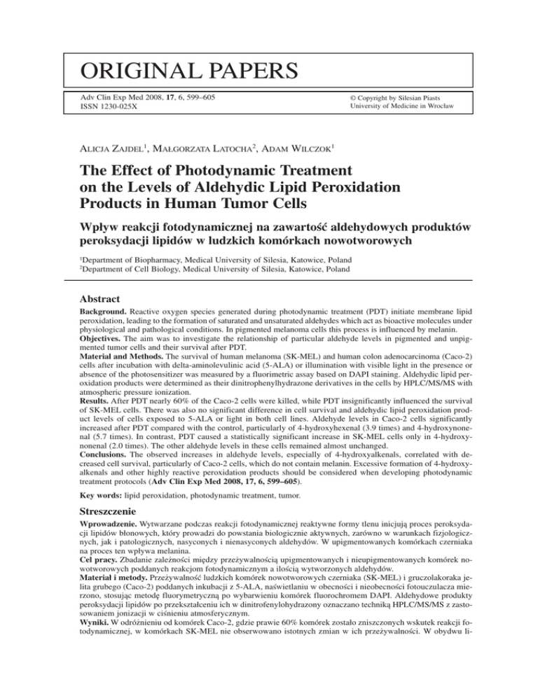 ORIGINAL PAPERS Adv Clin Exp Med 2008, 17, 6, 599–605 ISSN 1230−025X © Copyright by Silesian Piasts University of Medicine in Wrocław ALICJA ZAJDEL1, MAŁGORZATA LATOCHA2, ADAM WILCZOK1 The Effect of Photodynamic Treatment on the Levels of Aldehydic Lipid Peroxidation Products in Human Tumor Cells Wpływ reakcji fotodynamicznej na zawartość aldehydowych produktów peroksydacji lipidów w ludzkich komórkach nowotworowych 1 2 Department of Biopharmacy, Medical University of Silesia, Katowice, Poland Department of Cell Biology, Medical University of Silesia, Katowice, Poland Abstract Background. Reactive oxygen species generated during photodynamic treatment (PDT) initiate membrane lipid peroxidation, leading to the formation of saturated and unsaturated aldehydes which act as bioactive molecules under physiological and pathological conditions. In pigmented melanoma cells this process is influenced by melanin. Objectives. The aim was to investigate the relationship of particular aldehyde levels in pigmented and unpig− mented tumor cells and their survival after PDT. Material and Methods. The survival of human melanoma (SK−MEL) and human colon adenocarcinoma (Caco−2) cells after incubation with delta−aminolevulinic acid (5−ALA) or illumination with visible light in the presence or absence of the photosensitizer was measured by a fluorimetric assay based on DAPI staining. Aldehydic lipid per− oxidation products were determined as their dinitrophenylhydrazone derivatives in the cells by HPLC/MS/MS with atmospheric pressure ionization. Results. After PDT nearly 60% of the Caco−2 cells were killed, while PDT insignificantly influenced the survival of SK−MEL cells. There was also no significant difference in cell survival and aldehydic lipid peroxidation prod− uct levels of cells exposed to 5−ALA or light in both cell lines. Aldehyde levels in Caco−2 cells significantly increased after PDT compared with the control, particularly of 4−hydroxyhexenal (3.9 times) and 4−hydroxynone− nal (5.7 times). In contrast, PDT caused a statistically significant increase in SK−MEL cells only in 4−hydroxy− nonenal (2.0 times). The other aldehyde levels in these cells remained almost unchanged. Conclusions. The observed increases in aldehyde levels, especially of 4−hydroxyalkenals, correlated with de− creased cell survival, particularly of Caco−2 cells, which do not contain melanin. Excessive formation of 4−hydroxy− alkenals and other highly reactive peroxidation products should be considered when developing photodynamic treatment protocols (Adv Clin Exp Med 2008, 17, 6, 599–605). Key words: lipid peroxidation, photodynamic treatment, tumor. Streszczenie Wprowadzenie. Wytwarzane podczas reakcji fotodynamicznej reaktywne formy tlenu inicjują proces peroksyda− cji lipidów błonowych, który prowadzi do powstania biologicznie aktywnych, zarówno w warunkach fizjologicz− nych, jak i patologicznych, nasyconych i nienasyconych aldehydów. W upigmentowanych komórkach czerniaka na proces ten wpływa melanina. Cel pracy. Zbadanie zależności między przeżywalnością upigmentowanych i nieupigmentowanych komórek no− wotworowych poddanych reakcjom fotodynamicznym a ilością wytworzonych aldehydów. Materiał i metody. Przeżywalność ludzkich komórek nowotworowych czerniaka (SK−MEL) i gruczolakoraka je− lita grubego (Caco−2) poddanych inkubacji z 5−ALA, naświetlaniu w obecności i nieobecności fotouczulacza mie− rzono, stosując metodę fluorymetryczną po wybarwieniu komórek fluorochromem DAPI. Aldehydowe produkty peroksydacji lipidów po przekształceniu ich w dinitrofenylohydrazony oznaczano techniką HPLC/MS/MS z zasto− sowaniem jonizacji w ciśnieniu atmosferycznym. Wyniki. W odróżnieniu od komórek Caco−2, gdzie prawie 60% komórek zostało zniszczonych wskutek reakcji fo− todynamicznej, w komórkach SK−MEL nie obserwowano istotnych zmian w ich przeżywalności. W obydwu li− 600 A. ZAJDEL, M. LATOCHA, A. WILCZOK niach komórkowych poddanych działaniu kwasu delta−aminolewulinowego lub naświetlaniu nie stwierdzono róż− nic w przeżywalności komórek i w zawartości aldehydowych produktów peroksydacji lipidów. W komórkach Caco−2 poddanych reakcji fotodynamicznej, w odniesieniu do grupy kontrolnej, znacząco zwiększyła się zawar− tość aldehydów, szczególnie 4−hydroxyheksenalu (3,9−krotnie) i 4−hydroksynonenalu (5,7−krotnie). W wyniku re− akcji fotodynamicznej w komórkach SK−MEL znacząco zwiększyła się tylko zawartość 4−hydroksynonenalu (2− krotnie). Zawartość pozostałych oznaczanych aldehydów nie wykazała statystycznie istotnych zmian. Wnioski. Zaobserwowano, że wzrostowi zawartości poszczególnych aldehydów, zwłaszcza 4−hydroksyalkenali, towarzyszył spadek przeżywalności komórek, w szczególności niezawierających melaniny komórek Caco−2. Po− wstawanie tych wysoko reaktywnych związków należałoby uwzględniać podczas ustalania warunków terapii fo− todynamicznej (Adv Clin Exp Med 2008, 17, 6, 599–605). Słowa kluczowe: peroksydacja lipidów, terapia fotodynamiczna, nowotwory. Photodynamic lipid peroxidation has been associated with pathological conditions such as phototoxic skin injury and carcinogenesis as well as therapeutic treatments such as antitumor photody− namic therapy. During photodynamic therapy, the specific accumulation of a photosensitizer in the tumor tissue and its subsequent illumination at appropriate wavelengths induce the production of reactive oxygen species, predominantly singlet oxy− gen, responsible for the peroxidation of cell organelles and cell death. Cell death caused by pho− todynamic therapy can occur either by apoptosis and/or necrosis, depending on the cell type, the con− centration and intracellular localization of the sensi− tizer, and the light dose [1–2]. Reactive oxygen species generated during photodynamic