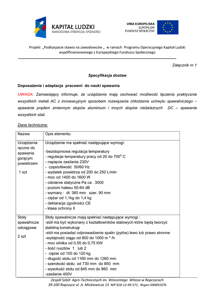 Projekt „Podkarpacie stawia na zawodowców „ w ramach Programu Operacyjnego Kapitał Ludzki współfinansowanego z Europejskiego Funduszu Społecznego Załącznik nr 1 Specyfikacja dostaw Doposażenie i adaptacja pracowni do nauki spawania UWAGA: Zamawiający informuje, że urządzenia mają cechować możliwość łączenia praktycznie wszystkich metali AC z innowacyjnym sposobem rozwiązania chłodzenia uchwytu spawalniczego – spawanie prądem zmiennym stopów aluminium i innych stopów nieżelaznych DC – spawanie wszystkich stali. Dane techniczne: Nazwa Opis elementu Urządzenia ręczne do spawania gorącym powietrzem Urządzenie ma spełniać następujące wymogi: 1 szt Stoły spawalnicze odciągowe 2 szt -bezstopniowa regulacja temperatury - regulacje temperatury pracy od 20 do 7000 C - napięcie zasilania 230V - częstotliwość 50/60 Hz - wydatek powietrza od 200 do 250 L/min - moc od 1400 do 1600 W - ciśnienie statyczne Pa ca . 3000 - poziom hałasu 50-64 dB - wymiary : dł. 360 mm szer. 90 mm - ciężar od 1,1kg do 1,4 kg - deklaracje zgodności CE - klasa ochrony II Stoły spawalnicze mają spełniać następujące wymogi : -stół ma być wykonany z kształtowników stalowych które będą tworzyć stabilną konstrukcję -stół ma posiadać odprowadzenie spalin (pyłów) lewo lub prawo stronne -wydajność ciągu od 800 do 1000 m ³ /h - moc silnika od 0,55 do 0,75 KW - ilość rusztów 1 lub 2 - ciężar od 100 do 120 kg - długość stołu od 1160 mm do 1260 mm - szerokość stołu od 730 mm do 850 mm - wysokość stołu od 845 mm do 860 mm -zasilanie 400V Zespół Szkół Agro-Technicznych im. Wincentego Witosa w Ropczycach 39-100 Ropczyce ul. A. Mickiewicza 13 NIP 818-12-99-572 , Regon 690691076 Projekt „Podkarpacie stawia na zawodowców „ w ramach Programu Operacyjnego Kapitał Ludzki współfinansowanego z Europejskiego Funduszu Społecznego Stoły spawalnicze przeznaczone są do spawania elektrycznego i gazowego . Górną płaszczyznę stołu ma stanowić powierzchnia robocza i ma się składać z 1 lub 2 rusztów żeliwnych . Pod rusztami ma się znajdować się odciąg odprowadzający gazy powstałe przy procesie spawania . Stoły mają być wyposażone w wentylację z silnikiem trójfazowym . Stół przeznaczony jest do procesów spawania ręcznego metodą TIG i półautomatyczną metodą MIG/MAG . Spawarka inwentorowa do TIG AC/DC 1 szt. Urządzenie przeznaczone do spawania metodą TIG AC/DC ma posiadać : -zakres regulacji prądu od 1 do 350A -cyfrowy wyświetlacz - ciężar od 35-45 kg - wymiary zewnętrzne: dł. od600 mm do 800 mm szer: od 400mm do 560 mm wys. 400mm do 500 mm -bezdotykowe zapalanie łuku HOT START - automatyczne wyłącznie prądu w sytuacji gdy elektroda się przyklei ANTI STICK - częstotliwość 50/60 Hz -napięcie zasilania: 3x400V zabezpieczenie 25A -zakres parametrów spawania od 1 do 350 A -cykl spawania w temperaturze 40 0C minimum : P 100% 244 - 250A P 60% 300 – 320A -stopień ochrony IP:21 Urządzenie ma cechować możliwość łączenia praktycznie wszystkich metali . AC spawanie prądem zmiennym stopów aluminium i innych stopów lekkich nieżelaznych . DC spawanie wszystkich stali .Urządzenie ma być beztransformatorowe Kompaktowy półautomat inwertorowy Urządzenie ma spełniać następujące wymogi: - zakres prądu spawania min 5 – 350A -wbudowany czterorolkowy podajnik drutu Zespół Szkół Agro-Technicznych im. Wincentego Witosa w Ropczycach 39-100 Ropczyce ul. A. Mickiewicza 13 NIP 818-12-99-572 , Regon 690691076 Projekt „Podkarpacie stawia na zawodowców „ w ramach Programu Operacyjnego Kapitał Ludzki współfinansowanego z Europejskiego Funduszu Społecznego MIG/MAG 1 szt. -wbudowany cyfrowy wyświetlacz umożliwiający bieżący i płynny odczyt parametrów spawania - jednogałkowa synergiczna regulacja parametrów spawania -płynna regulacja napięcia i podawania drutu -uchwyt spawalniczy mocowany poprzez złącze typu EURO -cykl pracy w temp . otoczenia 400C -P 100% : 220 – 250A -P 40% 300-350A -prąd maksymalny 350A -prąd szczytowy >500A -napięcie biegu jałowego 60 – 65V -prędkość podawania drutu 1 -20m/min -stopień ochrony IP:23S -napięcie zasilania 3x400V +10%- 20% -bezpiecznik 25A - -ustawienie funkcji SOFT START i HOT START (do spawania aluminium) -możliwość zapisania własnych programów Zespół Szkół Agro-Technicznych im. Wincentego Witosa w Ropczycach 39-100 Ropczyce ul. A. Mickiewicza 13 NIP 818-12-99-572 , Regon 690691076