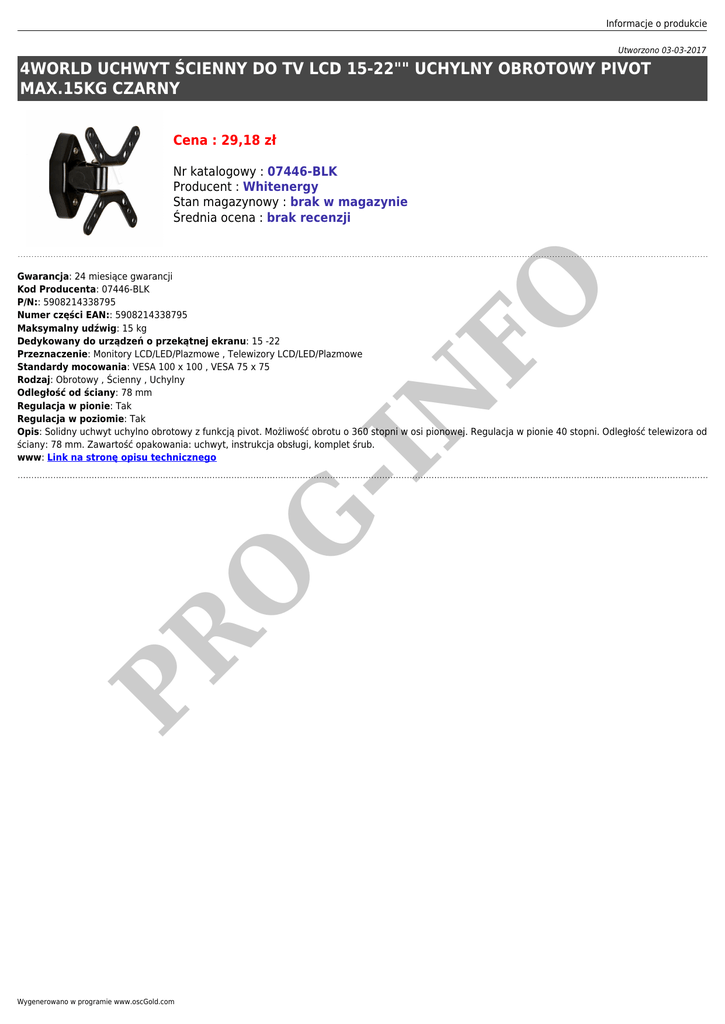 Informacje o produkcie Utworzono 03-03-2017 4WORLD UCHWYT ŚCIENNY DO TV LCD 15-22"" UCHYLNY OBROTOWY PIVOT MAX.15KG CZARNY Cena : 29,18 zł Nr katalogowy : 07446-BLK Producent : Whitenergy Stan magazynowy : brak w magazynie Średnia ocena : brak recenzji PR O G -I N FO Gwarancja: 24 miesiące gwarancji Kod Producenta: 07446-BLK P/N:: 5908214338795 Numer części EAN:: 5908214338795 Maksymalny udźwig: 15 kg Dedykowany do urządzeń o przekątnej ekranu: 15 -22 Przeznaczenie: Monitory LCD/LED/Plazmowe , Telewizory LCD/LED/Plazmowe Standardy mocowania: VESA 100 x 100 , VESA 75 x 75 Rodzaj: Obrotowy , Ścienny , Uchylny Odległość od ściany: 78 mm Regulacja w pionie: Tak Regulacja w poziomie: Tak Opis: Solidny uchwyt uchylno obrotowy z funkcją pivot. Możliwość obrotu o 360 stopni w osi pionowej. Regulacja w pionie 40 stopni. Odległość telewizora od ściany: 78 mm. Zawartość opakowania: uchwyt, instrukcja obsługi, komplet śrub. www: Link na stronę opisu technicznego Wygenerowano w programie www.oscGold.com