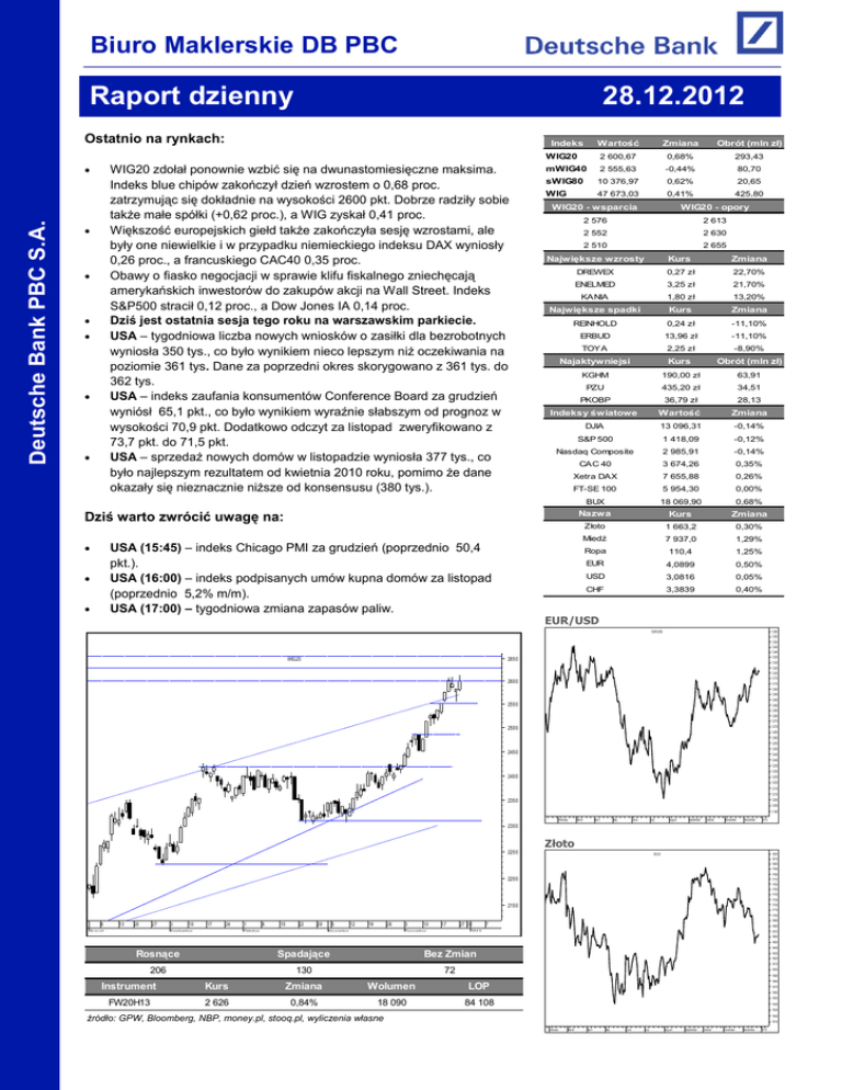 Biuro Maklerskie DB PBC stooqobbobizsssbobbww Raport dzienny 28.12.2012 Ostatnio na rynkach: Deutsche Bank PBC S.A. Zmiana Obrót (mln zł) 2 600,67 0,68% 293,43 mWIG40 2 555,63 -0,44% 80,70 sWIG80 10 376,97 0,62% 20,65 WIG 47 673,03 0,41% 425,80 Indeks WIG20 zdołał ponownie wzbić się na dwunastomiesięczne maksima. Indeks blue chipów zakończył dzień wzrostem o 0,68 proc. zatrzymując się dokładnie na wysokości 2600 pkt. Dobrze radziły sobie także małe spółki (+0,62 proc.), a WIG zyskał 0,41 proc. Większość europejskich giełd także zakończyła sesję wzrostami, ale były one niewielkie i w przypadku niemieckiego indeksu DAX wyniosły 0,26 proc., a francuskiego CAC40 0,35 proc. Obawy o fiasko negocjacji w sprawie klifu fiskalnego zniechęcają amerykańskich inwestorów do zakupów akcji na Wall Street. Indeks S&P500 stracił 0,12 proc., a Dow Jones IA 0,14 proc. Dziś jest ostatnia sesja tego roku na warszawskim parkiecie. USA – tygodniowa liczba nowych wniosków o zasiłki dla bezrobotnych wyniosła 350 tys., co było wynikiem nieco lepszym niż oczekiwania na poziomie 361 tys. Dane za poprzedni okres skorygowano z 361 tys. do 362 tys. USA – indeks zaufania konsumentów Conference Board za grudzień wyniósł 65,1 pkt., co było wynikiem wyraźnie słabszym od prognoz w wysokości 70,9 pkt. Dodatkowo odczyt za listopad zweryfikowano z 73,7 pkt. do 71,5 pkt. USA – sprzedaż nowych domów w listopadzie wyniosła 377 tys., co było najlepszym rezultatem od kwietnia 2010 roku, pomimo że dane okazały się nieznacznie niższe od konsensusu (380 tys.). Wartość WIG20 WIG20 - wsparcia WIG20 - opory 2 576 2 613 2 552 2 630 2 510 Kurs Zmiana DREWEX 0,27 zł 22,70% ENELMED 3,25 zł 21,70% KANIA 1,80 zł 13,20% Największe spadki Kurs Zmiana REINHOLD 0,24 zł -11,10% ERBUD 13,96 zł -11,10% TOYA 2,25 zł -8,90% Najaktywniejsi Kurs Obrót (mln zł) KGHM 190,00 zł 63,91 PZU 435,20 zł 34,51 PKOBP 36,79 zł 28,13 Indeksy światowe Wartość Zmiana DJIA 13 096,31 -0,14% S&P 500 1 418,09 -0,12% Nasdaq Composite 2 985,91 -0,14% CAC 40 3 674,26 0,35% Xetra DAX 7 655,88 0,26% FT-SE 100 5 954,30 0,00% BUX 18 069,90 0,68% Nazwa Kurs Zmiana Dziś warto zwrócić uwagę na: USA (15:45) – indeks Chicago PMI za grudzień (poprzednio 50,4 pkt.). USA (16:00) – indeks podpisanych umów kupna domów za listopad (poprzednio 5,2% m/m). USA (17:00) – tygodniowa zmiana zapasów paliw. 2 655 Największe wzrosty Złoto 1 663,2 0,30% Miedź 7 937,0 1,29% Ropa 110,4 1,25% EUR 4,0899 0,50% USD 3,0816 0,05% CHF 3,3839 0,40% EUR/USD EUR/USD WIG20 1.360 1.355 1.350 1.345 1.340 1.335 1.330 1.325 1.320 1.315 1.310 1.305 1.300 1.295 1.290 1.285 1.280 1.275 1.270 2650 2600 2550 2500 1.265 1.260 1.255 1.250 2450 1.245 1.240 1.235 1.230 2400 1.225 1.220 1.215 1.210 1.205 2350 1.200 1.195 2012 February March April May June July August September October November December 2013 2300 Złoto 2250 GOLD 1820 1810 1800 1790 1780 1770 1760 2200 1750 1740 1730 1720 2150 1710 1700 30 6 August 13 20 27 3 10 September 17 24 1 8 October 15 22 29 5 12 November 19 26 3 10 December 17 1690 27 31 7 2013 1680 1670 1660 1650 1640 Rosnące Spadające Bez Zmian 206 130 72 1630 1620 1610 1600 1590 Instrument Kurs Zmiana Wolumen LOP FW20H13 2 626 0,84% 18 090 84 108 1580 1570 1560 1550 1540 1530 źródło: GPW, Bloomberg, NBP, money.pl, stooq.pl, wyliczenia własne 1520 1510 February March April May June July August September October November December 2013 S&P500 S&P500 Ostatnia sesja na GPW w 2012 r. 1490 1480 1470 Deutsche Bank PBC S.A. 1460 Inwestujących na warszawskim parkiecie nie opuszcza optymizm. Po świętach kupujący ponownie dominowali na giełdzie i pomimo niskich obrotów (porównywalnych do najniższych w tym roku z 2 stycznia) WIG20 zdołał ponownie wzbić się na dwunastomiesięczne maksima. Indeks blue chipów zakończył dzień wzrostem o 0,68 proc. zatrzymując się dokładnie na wysokości 2600 pkt. Dobrze radziły sobie także małe spółki (+0,62 proc.), a WIG zyskał 0,41 proc. Dziś jest ostatnia sesja tego roku na warszawskim parkiecie. W obliczu dobrych nastrojów panujących na giełdzie może być ona wykorzystana przez inwestorów do podniesienia rocznych wyników, a ewentualna realizacja zysków może nastąpić dopiero w 2013 r., zwłaszcza że w ujęciu podatkowym straty nie można zaliczyć już na poczet 2012 r. Za nami rok, który przyniósł wzrost głównych indeksów o około 20 procent, co miało miejsce głownie za sprawą decyzji banków centralnych w USA i Eurolandzie. 1450 1440 1430 1420 1410 1400 1390 1380 1370 1360 1350 1340 1330 1320 1310 1300 1290 1280 1270 1260 February March April May June July August September October November December 2013 mWIG 40 MWIG40 2650 2600 2550 2500 Na szczególną uwagę zasługuje fakt, że krajowi inwestorzy zignorowali wczoraj niepokojące informacje dotyczące braku porozumienia w sprawie tzw. klifu fiskalnego w USA. Ponadto warszawskie blue chipy były jednym z liderów wzrostów na naszym kontynencie. Wprawdzie większość europejskich giełd także zakończyła sesję wzrostami, ale były one niewielkie i w przypadku niemieckiego indeksu DAX wyniosły 0,26 proc., a francuskiego CAC40 0,35 proc. Kupujących wsparły pozytywne dane makroekonomiczne zza Oceanu. Liczba wniosków o zasiłek dla bezrobotnych zmniejszyła się z 362 do 350 tys. Ponadto sprzedaż nowych domów wzrosła z 361 do 377 tys. 2450 2400 2350 2300 2250 2200 2150 February March April May June July August September October November December 2013 DAX DAX 7800 7700 7600 W historycznym ujęciu ostatnia sesja roku w Warszawie cechowała się niskimi obrotami i nie zmieniała obrazu rynku, stąd dziś możemy się spodziewać przebiegu dnia zbliżonego do wczorajszego. 7500 7400 7300 7200 7100 7000 6900 6800 6700 Brak kompromisu w sprawie fiskalnego klifu 6600 6500 6400 W Stanach Zjednoczonych Kongresmeni nadal negocjują warunki rozwiązania problemu klifu fiskalnego i p