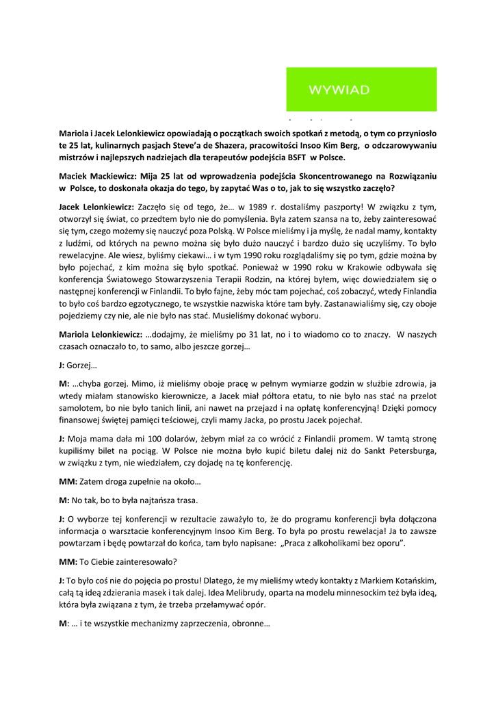 Mariola i Jacek Lelonkiewicz opowiadają o początkach swoich spotkań z metodą, o tym co przyniosło te 25 lat, kulinarnych pasjach Steve’a de Shazera, pracowitości Insoo Kim Berg, o odczarowywaniu mistrzów i najlepszych nadziejach dla terapeutów podejścia BSFT w Polsce. Maciek Mackiewicz: Mija 25 lat od wprowadzenia podejścia Skoncentrowanego na Rozwiązaniu w Polsce, to doskonała okazja do tego, by zapytać Was o to, jak to się wszystko zaczęło? Jacek Lelonkiewicz: Zaczęło się od tego, że… w 1989 r. dostaliśmy paszporty! W związku z tym, otworzył się świat, co przedtem było nie do pomyślenia. Była zatem szansa na to, żeby zainteresować się tym, czego możemy się nauczyć poza Polską. W Polsce mieliśmy i ja myślę, że nadal mamy, kontakty z ludźmi, od których na pewno można się było dużo nauczyć i bardzo dużo się uczyliśmy. To było rewelacyjne. Ale wiesz, byliśmy ciekawi… i w tym 1990 roku rozglądaliśmy się po tym, gdzie można by było pojechać, z kim można się było spotkać. Ponieważ w 1990 roku w Krakowie odbywała się konferencja Światowego Stowarzyszenia Terapii Rodzin, na której byłem, więc dowiedziałem się o następnej konferencji w Finlandii. To było fajne, żeby móc tam pojechać, coś zobaczyć, wtedy Finlandia to było coś bardzo egzotycznego, te wszystkie nazwiska które tam były. Zastanawialiśmy się, czy oboje pojedziemy czy nie, ale nie było nas stać. Musieliśmy dokonać wyboru. Mariola Lelonkiewicz: …dodajmy, że mieliśmy po 31 lat, no i to wiadomo co to znaczy. W naszych czasach oznaczało to, to samo, albo jeszcze gorzej… J: Gorzej… M: …chyba gorzej. Mimo, iż mieliśmy oboje pracę w pełnym wymiarze godzin w służbie zdrowia, ja wtedy miałam stanowisko kierownicze, a Jacek miał półtora etatu, to nie było nas stać na przelot samolotem, bo nie było tanich linii, ani nawet na przejazd i na opłatę konferencyjną! Dzięki pomocy finansowej świętej pamięci teściowej, czyli mamy Jacka, po prostu Jacek pojechał. J: Moja mama dała mi 100 dolarów, żebym miał za co wrócić z Finlandii promem. W tamtą stronę kupiliśmy bilet na pociąg. W Polsce nie można było kupić biletu dalej niż do Sankt Petersburga, w związku z tym, nie wiedziałem, czy dojadę na tę konferencję. MM: Zatem droga zupełnie na około… M: No tak, bo to była najtańsza trasa. J: O wyborze tej konferencji w rezultacie zaważyło to, że do programu konferencji była dołączona informacja o warsztacie konferencyjnym Insoo Kim Berg. To była po prostu rewelacja! Ja to zawsze powtarzam i będę powtarzał do końca, tam było napisane: „Praca z alkoholikami bez oporu”. MM: To Ciebie zainteresowało? J: To było coś nie do pojęcia po prostu! Dlatego, że my mieliśmy wtedy kontakty z Markiem Kotańskim, całą tą ideą zdzierania masek i tak dalej. Idea Melibrudy, oparta na modelu minnesockim też była ideą, która była związana z tym, że trzeba przełamywać opór. M: … i te wszystkie mechanizmy zaprzeczenia, obronne… J: To mnie otworzyło. Mariola wtedy kierowała Ośrodkiem Terapii Odwykowej, który był jednym z tych wiodących, na bazie których szlifowała się koncepcja Melibrudy, którą ogłosił i stała się ona dominująca. Wszystkie podejścia psychoterapeutyczne, których wcześniej się uczyliśmy, mówiły o oporze w terapii, o mechanizmach obronnych i nagle ktoś pisze o tym, że można pracować bez oporu !? To było coś niewiarygodnego! MM: Wtedy było to coś zupełnie nowego w pracy ? M: To było jak przewrót kopernikański! J: Ja pomyślałem, że jeżeli mam gdziekolwiek pojechać , to właśnie tam, żeby spotkać kogoś, kto mówi takie rzeczy i pokazuje, że można pracować w ten sposób. Organizatorzy tej konferencji proponują komuś, żeby zrobił warsztat na którym, jak rozumiem, dowiemy się, jak pracować bez oporu. W związku z tym zakupiliśmy bilet do Sankt Petersburga, a w Petersburgu, mnie się udało jakimś niesamowitym cudem, kupić bilet do Jyvaskyli, przez Helsinki. Nie, do Helsinek. Bo trzeba było przejechać tę rosyjsko-fińską granicę. M: Pociągiem. J: Pociągiem, najpierw jechałem do Petersburga, później z Petersburga znowu dzień do Helsinek, potem przesiadka i do Jyvaskyli. Ja byłem totalnie nieprzytomny w Jyvaskyli, ale dotarłem. Byłem tak zachwycony tym wszystkim, że przespałem tę Jyvaskylę, pojechałem za daleko, musiałem potem wracać stamtąd z jakimiś kierowcami TIR-a, bo nie miałem pieniędzy na żaden autobus. Więc musiałem się dogadać z jakimiś Finami, którzy nie mówili w żadnym języku, żeby ktoś mnie dowiózł do tej Jyvaskyli. A ja wiedziałem, że muszę tam dojechać! Tak dotarłem na tę konferencję i spotkałem Insoo. Na tej konferencji były różne rzeczy , niektóre były dla mnie bardziej interesujące, inne mniej ... np. mniej: na jednym z warsztatów zrobiłem sobie taki, w kilkunastu punktach zarys, jak nie należy prowadzić wystąpień… MM: (śmiech) i to też było cenne? J: To też było cenne, wiesz, napisałem sobie, że jeżeli się nie chce dobrze zrobić wystąpienia, to należy prowadzić je np. w taki i w taki sposób, mówić w taki i taki sposób. Nie miałem nic innego do zrobienia, jak tylko obserwować prowadzącego i notować, czego nie należy robić, żeby ludzie nie zniechęcili się do końca. MM: A jak potoczyło się spotkanie z Insoo, miałeś wtedy możliwość porozmawiać z nią przez chwilę? J: Dosłownie przez chwilę. Spotkałem ją na ostatniej przerwie ostatniego dnia. Chodziłem i szukałem , to tez była taka fajna sytuacja w tej całej konferencji. Ja wiedziałem, że nie pójdę na jej warsztat pokonferencyjny. Więc muszę jakoś spotkać się z nią i chociaż porozmawiać. I ta nadzieja tak gasła, gasła, gasła, czas się skracał. Podchodziłem na każdej przerwie do tych ludzi, nie miałem pojęcia kto to jest Insoo. Wiedziałem, że jest ze