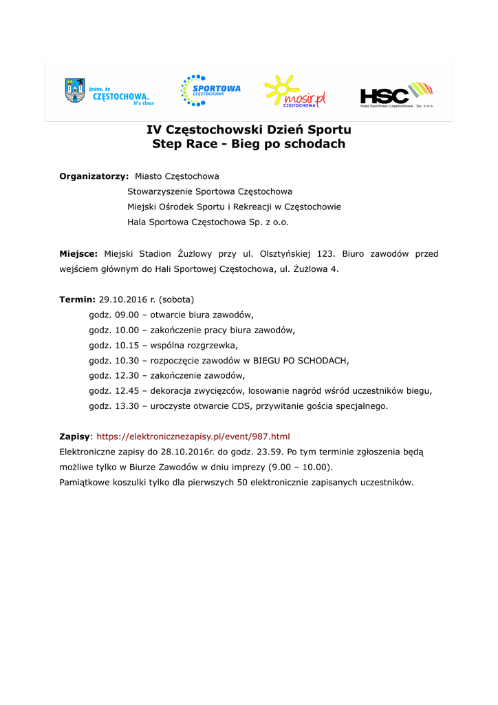 IV Częstochowski Dzień Sportu Step Race - Bieg po schodach Organizatorzy: Miasto Częstochowa Stowarzyszenie Sportowa Częstochowa Miejski Ośrodek Sportu i Rekreacji w Częstochowie Hala Sportowa Częstochowa Sp. z o.o. Miejsce: Miejski Stadion Żużlowy przy ul. Olsztyńskiej 123. Biuro zawodów przed wejściem głównym do Hali Sportowej Częstochowa, ul. Żużlowa 4. Termin: 29.10.2016 r. (sobota) godz. 09.00 – otwarcie biura zawodów, godz. 10.00 – zakończenie pracy biura zawodów, godz. 10.15 – wspólna rozgrzewka, godz. 10.30 – rozpoczęcie zawodów w BIEGU PO SCHODACH, godz. 12.30 – zakończenie zawodów, godz. 12.45 – dekoracja zwycięzców, losowanie nagród wśród uczestników biegu, godz. 13.30 – uroczyste otwarcie CDS, przywitanie gościa specjalnego. Zapisy: https://elektronicznezapisy.pl/event/987.html Elektroniczne zapisy do 28.10.2016r. do godz. 23.59. Po tym terminie zgłoszenia będą możliwe tylko w Biurze Zawodów w dniu imprezy (9.00 – 10.00). Pamiątkowe koszulki tylko dla pierwszych 50 elektronicznie zapisanych uczestników. Dystans: Bieg po schodach – 980 schodów do pokonania Klasyfikacja: 1. Klasyfikacja generalna kobiet i mężczyzn: Dekoracja trzech pierwszych miejsc w kategorii Kobiet i Mężczyzn Losowanie nagród wśród wszystkich startujących zawodników i zawodniczek Pamiątkowe koszulki tylko dla pierwszych 50 elektronicznie zapisanych uczestników, którzy ukończą bieg. Zasady uczestnictwa: 1. Start zawodników będzie następował kaskadowo co 1 min po 5 osób. 2. Zawodnicy w poszczególnych grupach startują wg. kolejności nadanych numerów startowych. 3. Zawodnicy muszą 22 razy wbiec na górę korony i 22 razy zbiec z góry korony. 4. W celu weryfikacji każdy zawodnik musi zgłosić się osobiście do biura zawodów. 5. Do biegu zostaną dopuszczeni zawodnicy, którzy w dniu zawodów ukończyli 18 rok życia i zweryfikowali swoje dane w biurze zawodów. 6. Każdy zawodnik startuje wyłącznie na własną odpowiedzialność, co potwierdza złożeniem podpisu pod oświadczeniem o zdolności do udziału w biegu. 7. Każdy zawodnik ma obowiązek zapoznać się z regulaminem biegu i zobowiązać się do jego przestrzegania. 8. Pobranie numeru startowego jest równoznaczne z akceptacją regulaminu biegu. Trasa i pomiar czasu: 1. Bieg odbywa się po schodach, między trybunami Miejskiego Stadionu Żużlowego. Podczas nawrotów można korzystać z poręczy. 2. Miejscem startu biegu jest północna strona stadionu (znajdująca się od strony Hali Sportowej Częstochowa) 3. Meta znajduje w tym samym miejscu co bramka startowa. 4. Do pokonania jest 980 stopni schodów. 5. Podczas wyprzedzania się zawodników obowiązuje zasada, że wolniejszy biegacz ustępuje miejsca szybszemu. 6. Pomiar czasu dokonywany jest ręcznie. 8. Posiadanie numeru startowego jest warunkiem wystartowania w biegu i sklasyfikowania w komunikacie końcowym. 9. Numer startowy należy umieścić na przedniej części tułowia pomiędzy linią pasa i barków. INFORMACJE DODATKOWE 1. Organizator nie ubezpiecza zawodników biorących udział w imprezie, nie ponosi również z tego tytułu odpowiedzialności. Osoby startują w biegu na własną odpowiedzialność. Organizator zapewnia na czas trwania imprezy opiekę medyczną jednak nie odpowiada za wszelkiego rodzaju urazy i kontuzje. 2. Organizator nie ponosi odpowiedzialności za rzeczy zgubione lub pozostawione w miejscu i w czasie trwania imprezy. 3. Sprawy, które nie zostały uwzględnione w regulaminie, a wynikną w czasie trwania imprezy, rozstrzygnięte zostaną przez organizatora, bądź sędziego zawodów. 4. Organizator zastrzega sobie prawo do zmian w regulaminie, o czym poinformuje wszystkich uczestników przed rozpoczęciem imprezy. 5. Bieg odbędzie się bez względu na warunki atmosferyczne. 6. Pisemne protesty przyjmuje Biuro Zawodów w czasie do 15 minut po zakończeniu biegu. Będą one rozpatrywane natychmiast przez Sędziego Głównego. 7. Wszyscy uczestnicy, którzy ukończą bieg otrzymają pamiątkowe medale. 8. Organizator planuje rozdanie atrakcyjnych nagród wśród wszystkich uczestników. 9. Zgłoszenie do imprezy jest równoznaczne z wyrażeniem zgody na wykorzystanie wizerunku utrwalonego na zdjęciach oraz relacjach wideo wykonanych w trakcie imprezy na potrzeby przygotowania materiałów prasowych oraz promocji wydarzenia (zgodnie z Ustawą o prawie autorskim i prawach pokrewnych (Dz. U. Z 1994 r. Nr 24 poz.83, art. 81). 10. Zgłoszenie do imprezy jest równoznaczne z wyrażaniem zgody na przetwarzanie danych osobowych zgodnie z ustawą z dnia 29 sierpnia 1997 r. o ochronie danych osobowych (Dz.U. nr 133, poz. 883) przez Organizatorów w zakresie niezbędnym do organizacji imprezy, tj. przyjęcia zapisów, ogłoszenia i publikacji wyników itp. Zgłoszenie oraz przystąpienie do imprezy jest równoznaczne z akceptacją powyższego regulaminu. Załącznik 1. TRASA BIEGU