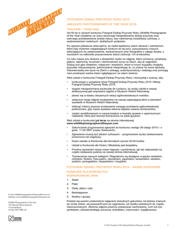 FOTOGRAF DZIKIEJ PRZYRODY ROKU 2015 (WILDLIFE PHOTOGRAPHER OF THE YEAR 2015) Twój świat – Twoja wizja Od 50 lat w ramach konkursu Fotograf Dzikiej Przyrody Roku (Wildlife Photographer of the Year) działamy na rzecz etycznego fotografowania dzikiej przyrody oraz wiernego przedstawiania świata natury, bez nadmiernej modyfikacji cyfrowej, z zastosowaniem rzetelnych, dokładnych podpisów. Po upływie półwiecza obiecujemy, że nadal będziemy wierni etosowi i wartościom, które były motorem napędzającym konkurs do tej pory: poszukiwaniu nowych, skłaniających do zastanowienia, wartościowych prac fotografów z całego świata, z naciskiem na całkowite poszanowanie dobra zwierząt i ich środowiska. Co roku nasze jury złożone z ekspertów czeka na zdjęcia, które uchwycą i przekażą piękno, tajemnicę, kruchość i różnorodność życia na Ziemi, aby je nagrodzić. Dadzą one głos obiektom, miejscom i kwestiom, które w innym wypadku mogłyby pozostać niezauważone, jednocześnie interpretując to, co znane na nowe sposoby. Odzwierciedlą one życie na Ziemi z odwagą, autentycznością i nadzieją oraz pomogą nam przekazać ważne treści oglądającym na całym świecie. Weź udział w konkursie Fotograf Dzikiej Przyrody Roku i skorzystaj z szansy, aby: • konkurować o pożądane tytuły Fotograf Dzikiej Przyrody Roku 2015 i Młody Fotograf Dzikiej Przyrody Roku 2015; • wygrać niezapomnianą wycieczkę do Londynu, by wziąć udział w naszej ekskluzywnej gali wręczenia nagród w Muzeum Historii Naturalnej; • pławić się w blasku obszernych relacji ogólnoświatowych mediów; • zobaczyć swoje zdjęcie wystawione na naszej zapierającej dech w piersiach wystawie w Muzeum Historii Naturalnej; • dotknąć miliony poprzez przekazanie swojego przesłania ogólnoświatowej publiczności, gdy nasza wystawa dokona objazdu sześciu kontynentów; • zostać opublikowanym w naszej książce w twardej oprawie o ograniczonym nakładzie, która jest również tłumaczona na wiele języków. Weź udział w konkursie już teraz na stronie internetowej www.wildlifephotographeroftheyear.com • Zakończenie przyjmowania zgłoszeń do konkursu nastąpi 26 lutego 2015 r. o godz. 11:30 GMT (czasu Greenwich). • Zgłoszenia muszą być plikami cyfrowymi – przyjmowane są też zeskanowane przezrocza lub negatywy. • Koszt udziału w Konkursie dla Dorosłych wynosi 30,00 funtów. • Udział w Konkursie dla Dzieci i Młodzieży jest bezpłatny. • Prosimy sprawdzić nasze nowe nagrody i wyróżnienia, jak też odpowiedzi na często zadawane pytania na naszej stronie internetowej. • Tłumaczenia naszych kategorii i Regulaminu są dostępne w języku arabskim, chińskim, fińskim, francuskim, niemieckim, japońskim, koreańskim, włoskim, polskim, portugalskim, hiszpańskim i rosyjskim. FOTOGRAF DZIKIEJ PRZYRODY ROKU 2014 – NASZE KATEGORIE KONKURS DLA DOROSŁYCH RÓŻNORODNOŚĆ ZIEMI 1. Ssaki 2. Ptaki 3. Gady, płazy i ryby E-mail: [email protected] Website: www.wildlifephotographeroftheyear.com Wildlife Photographer of the Year The Natural History Museum Cromwell Road London SW7 5BD, UK 4. Bezkręgowce 5. Rośliny i grzyby Podziel się swoimi znakomitymi zdjęciami dowolnych gatunków, od dobrze znanych po mniej znane, od powszechnych po zagrożone, od rzadko widzianych do często niezrozumianych. Złożone zdjęcia powinny pokazywać zachowanie, ruch lub być portretami, odzwierciedlając poczucie charakteru, intymności i wyjątkowości. © The Trustees of the Natural History Museum, London. 1 ŚRODOWISKA ZIEMI 6. Pod wodą 7. Na lądzie 8. Na niebie 9. W mieście Celebruj niezwykłą różnorodność środowisk, które otaczają dziką przyrodę na świecie. Od ekstremalnych przestrzeni fizycznych do majestatycznych krajobrazów, od dramatycznych zjawisk naturalnych do cichego spektaklu tego, co zwyczajne, zgłoszenia powinny ujmować dzikie lub stworzone przez człowieka otoczenie, ilustrując odpornoność natury lub wpływ na naszą planetę. DESENIE ZIEMI 10. Szczegół Odkryj bogactwo wzorów, tekstur, struktur i form Ziemi, z abstrakcyjnego lub ilustracyjnego punktu widzenia, wykorzystując wszelkie techniki utrwalania obrazu, w tym makro, tomografia komputerowa czy mikroskopia świetlna i elektronowa. Zgłoszenia powinny pokazywać zawiłą strukturę i kompozycję otoczającego nas świata. 11. Impresje Natura z artystycznej perspektywy. Osobisty styl powinien uzupełniać wizję artystyczną i kreatywność użycia funkcji aparatu fotograficznego, a zgłoszenia powinny inspirować świeżość spojrzenia na znajome widoki. 12. Czarno-białe Eksploracja monochromatycznego świata, w którym siła grafiki i zakres odcieni stanowią wyzwanie dla emocjonalnej mocy koloru. Zgłoszenia powinny wyraźnie pokazywać zdecydowaną zdolność fotografii czarno-białej do podkreślania formy i charakteru obiektu. 13. Nagroda Specjalna TIMElapse Odkryj niespodziewaną niezwykłość lub zaskakujące spojrzenie na świat natury. Stwórz do trzech (3) oddzielnych wieloobrazowych sekwencji, z których każda będzie trwać od 45 do 90 sekund, które będą opowiadać historię, pokażą wyjątkowe zachowanie lub ukryte procesy, albo przedstawią dramatyczne wydarzenie, które inaczej mogłoby zostać niezauważone. WSKAZÓWKA!: Aby zgłosić się do tej kategorii, należy przesłać pojedynczy obraz z sekwencji ruchomych obrazów, wraz z informacjami zawartymi w podpisie. Należy złożyć pełne sekwencje przez stronę internetową www.wetransfer.com na adres [email protected]. DOKUMENT 14. Fotoreporter Dzikiej Przyrody: Nagroda za Pojedyncze Zdjęcie 15 Fotoreporter Dzikiej Przyrody: Nagroda za Reportaż Zgłębianie skomplikowanych relacji między ludźmi a światem natury poprzez wykorzystanie narracyjnej mocy fotografii. Zgłoszenia o charakterze wyzwania, podnoszące na duchu, prowokujące lub odkrywcze powinny przypominać nam, jak nasze postawy, decyzje i dział