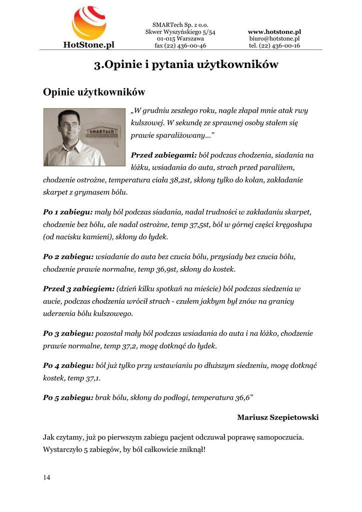 SMARTech Sp. z o.o. Skwer Wyszyńskiego 5/54 01-015 Warszawa fax (22) 436-00-46 HotStone.pl www.hotstone.pl [email protected] tel. (22) 436-00-16 3.Opinie i pytania użytkowników Opinie użytkowników „W grudniu zeszłego roku, nagle złapał mnie atak rwy kulszowej. W sekundę ze sprawnej osoby stałem się prawie sparaliżowany...” Przed zabiegami: ból podczas chodzenia, siadania na łóżku, wsiadania do auta, strach przed paraliżem, chodzenie ostrożne, temperatura ciała 38,2st, skłony tylko do kolan, zakładanie skarpet z grymasem bólu. Po 1 zabiegu: mały ból podczas siadania, nadal trudności w zakładaniu skarpet, chodzenie bez bólu, ale nadal ostrożne, temp 37,5st, ból w górnej części kręgosłupa (od nacisku kamieni), skłony do łydek. Po 2 zabiegu: wsiadanie do auta bez czucia bólu, przysiady bez czucia bólu, chodzenie prawie normalne, temp 36,9st, skłony do kostek. Przed 3 zabiegiem: (dzień kilku spotkań na mieście) ból podczas siedzenia w aucie, podczas chodzenia wrócił strach - czułem jakbym był znów na granicy uderzenia bólu kulszowego. Po 3 zabiegu: pozostał mały ból podczas wsiadania do auta i na łóżko, chodzenie prawie normalne, temp 37,2, mogę dotknąć do łydek. Po 4 zabiegu: ból już tylko przy wstawianiu po dłuższym siedzeniu, mogę dotknąć kostek, temp 37,1. Po 5 zabiegu: brak bólu, skłony do podłogi, temperatura 36,6” Mariusz Szepietowski Jak czytamy, już po pierwszym zabiegu pacjent odczuwał poprawę samopoczucia. Wystarczyło 5 zabiegów, by ból całkowicie zniknął! 14 HotStone.pl SMARTech Sp. z o.o. Skwer Wyszyńskiego 5/54 01-015 Warszawa fax (22) 436-00-46 www.hotstone.pl [email protected] tel. (22) 436-00-16 „Sesja masażu dostarcza błogiego odczucia z powodu harmonijnego ruchu kamieni (...). Ruch zdaje się być naśladowaniem silnych i troskliwych rąk masażysty. Błogość i zaufanie wynikające z ich dotyku mają według mnie związek z tym, że są to naturalne kamienie. Kiedyś próbowałam podobnego urządzenia - fotela. Jednak tam czułam się jak w kleszczach rozbudowanej maszynerii. W tym przypadku moje odczucia są zdecydowanie dalekie od tamtych. Wspaniałą okolicznością jest to, że wykorzystuje się naturalną siłę grawitacji, dla każdego siła ucisku jest indywidualna, bo wynika z jego wagi. Ciepło uspokaja i dodaje poczucia bezpieczeństwa. Ciepło pokazuje również, które miejsca są go najbardziej spragnione, czyli wychłodzone i potrzebują najwięcej energii. Ew. ból lub drobne napięcie wskazują miejsce, gdzie energia jest zablokowana. Kamienie o to miejsce zadbają, ale można wykorzystać tę informację przy innych swoich praktykach - ćwiczeniach, oddechu, dodatkowym dogrzaniu, terapii itd. Przebieg masażu nie budzi jakichkolwiek niepokojących reakcji, można oddać się mu w pełni, idąc za instynktownym zaufaniem. Tempo i głębokość, z jaką dociera ucisk, wydają mi się idealnie dobrane dla masowanego w danym momencie miejsca.” Dagmara Frysiak „Na początku masażu trochę boli. Od razu można poznać z jaką częścią kręgosłupa mamy problem. W moim przypadku nie chodziło tyle o sam kręgosłup, co o wadę postawy (krzywe łopatki). Po chwili, wałek przesuwający się od głowy po kość ogonową, nagrzewa się i wtedy robi się znacznie przyjemniej. Po kilku minutach ból znacznie się zmniejsza, a wtedy można rozluźnić mięśnie, odprężyć się i zapomnieć o całym stresie, który nas otacza. Umysł wycisza się, my odpoczywamy, a lóżko masuje plecy. Pod koniec zabiegu, ciało przyzwyczaja się do rytmu masażu i towarzyszy temu wspaniałe uczucie spokoju, relaksu i bezpieczeństwa. To trochę tak jakby unosić się w powietrzu leżąc na ciepłej chmurze. 15 SMARTech Sp. z o.o. Skwer Wyszyńskiego 5/54 01-015 Warszawa fax (22) 436-00-46 HotStone.pl www.hotstone.pl [email protected] tel. (22) 436-00-16 Ogromną zaletą jest również to, że z masażu można skorzystać bez wcześniejszego przygotowania. Na łóżko można położyć się w ubraniu i wystarczy po prostu leżeć. Dlatego łóżko to jest idealne dla osób, które nie przepadają za masażem w klasycznym wydaniu gdyż czują się skrępowane obecnością masażysty. Po zabiegu czułam się odprężona, zrelaksowana i wyciszona. Nieco później zauważyłam, że moje dłonie i stopy były ciepłe, a nie lodowate, jak zazwyczaj. Kilka dni po zabiegu zorientowałam się, że znikło również uczucie drętwienia prawej części ciała, które od jakoś czasu mi dokuczało.” Ewa Krajewska „Jako lekarz medycyny wschodniej, wyleczyłam z przykrych dolegliwości bardzo wielu pacjentów. Sama również zmagałam się z kłopotami zdrowotnymi – cierpiałam na silne bóle kręgosłupa i karku. Prawie dwa lata temu natrafiłam na opis działania łóżka HotStone – producent zapewniał, że opiera się ono na dalekowschodnich metodach leczenia... Znałam działanie wszystkich opisanych zabiegów leczniczych i wiedziałam, że naprawdę są one skuteczne - dlatego postanowiłam spróbować tej terapii. Masaż HotStone okazał się strzałem w dziesiątkę! Nie tylko rozluźnił nadmiernie naprężone mięśnie i uwolnił mnie od męczących bólów pleców oraz karku, ale także podziałał relaksująco i uspokajająco, poprawiając krążenie krwi. Sprawdziłam skuteczność łóżka HotStone jako lekarz i jako pacjentka. Mogę zatem potwierdzić, że doskonale spełnia ono swoje funkcje i przynosi widoczną poprawę w wielu uciążliwych dolegliwościach, w tym m.in. w stanach zapalnych pęcherza moczowego i dolegliwościach tzw. „zimnej nerki”. mgr Oyuntsetseg Dulamsuren lekarz medycyny wschodniej - konsultantka tel. 607069451 16 HotStone.pl SMARTech Sp. z o.o. Skwer Wyszyńskiego 5/54 01-015 Warszawa fax (22) 436-00-46 www.hotstone.pl [email protected] tel. (22) 436-00-16 Najczęstsze pytania użytkowników Czytając część opisującą łóżko i jego dodatki mogły
