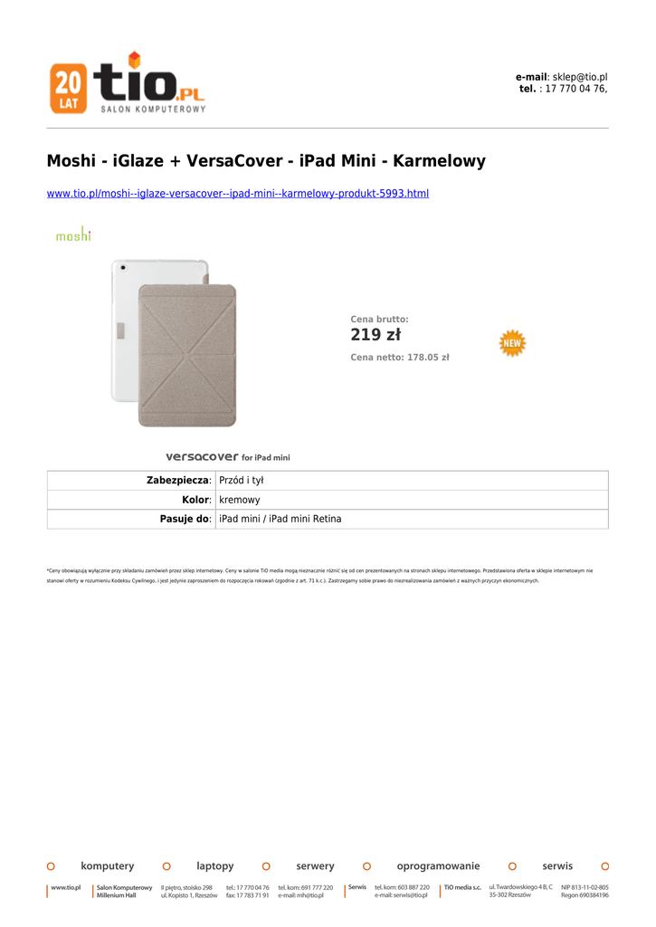 e-mail: [email protected] tel. : 17 770 04 76, Moshi - iGlaze + VersaCover - iPad Mini - Karmelowy www.tio.pl/moshi--iglaze-versacover--ipad-mini--karmelowy-produkt-5993.html Cena brutto: 219 zł Cena netto: 178.05 zł Zabezpiecza: Przód i tył Kolor: kremowy Pasuje do: iPad mini / iPad mini Retina *Ceny obowiązują wyłącznie przy składaniu zamówień przez sklep internetowy. Ceny w salonie TiO media mogą nieznacznie różnić się od cen prezentowanych na stronach sklepu internetowego. Przedstawiona oferta w sklepie internetowym nie stanowi oferty w rozumieniu Kodeksu Cywilnego, i jest jedynie zaproszeniem do rozpoczęcia rokowań (zgodnie z art. 71 k.c.). Zastrzegamy sobie prawo do niezrealizowania zamówień z ważnych przyczyn ekonomicznych.