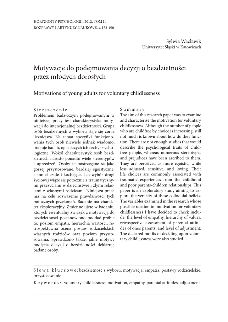 HORYZONTY PSYCHOLOGII, 2012, TOM II ROZPRAWY I ARTYKUŁY NAUKOWE, s. 173-190 Sylwia Wacławik Uniwersytet Śląski w Katowicach Motywacje do podejmowania decyzji o bezdzietności przez młodych dorosłych Motivations of young adults for voluntary childlessness Streszczenie Problemem badawczym podejmowanym w niniejszej pracy jest charakterystyka motywacji do intencjonalnej bezdzietności. Grupa osób bezdzietnych z wyboru staje się coraz liczniejsza. Na temat specyfiki funkcjonowania tych osób niewiele jednak wiadomo, brakuje badań, opisujących ich cechy psychologiczne. Wokół charakterystyk osób bezdzietnych narosło ponadto wiele stereotypów i uprzedzeń. Osoby te postrzegane są jako gorzej przystosowane, bardziej egoistyczne, a mniej czułe i kochające. Ich wybór drogi życiowej wiąże się potocznie z traumatycznymi przeżyciami w dzieciństwie i złymi relacjami z własnymi rodzicami. Niniejsza praca ma na celu rozważenie prawdziwości tych potocznych przekonań. Badanie ma charakter eksploracyjny. Zmienne ujęte w badaniu, których ewentualny związek z motywacją do bezdzietności postanowiono poddać próbie to: poziom empatii, hierarchia wartości, retrospektywna ocena postaw rodzicielskich własnych rodziców oraz poziom przystosowania. Sprawdzono także, jakie motywy podjęcia decyzji o bezdzietności deklarują badane osoby. Summary The aim of this research paper was to examine and characterise the motivation for voluntary childlessness. Although the number of people who are childfree by choice is increasing, still not much is known about how do they function. There are not enough studies that would describe the psychological traits of childfree people, whereas numerous stereotypes and prejudices have been ascribed to them. They are perceived as more egoistic, while less adjusted, sensitive, and loving. Their life choices are commonly associated with traumatic experiences from the childhood and poor parents-children relationships. This paper is an exploratory study aiming to explore the veracity of these colloquial beliefs. The variables examined in the research whose possible relation to motivation for voluntary childlessness I have decided to check include: the level of empathy, hierarchy of values, retrospective assessment of parental attitudes of one’s parents, and level of adjustment. The declared motifs of deciding upon voluntary childlessness were also studied. S ł o w a k l u c z o w e : bezdzietność z wyboru, motywacja, empatia, postawy rodzicielskie, przystosowanie K e y w o r d s : voluntary childlessness, motivation, empathy, parental attitudes, adjustment 174 S. Wacławik, Motywacje do podejmowania decyzji o bezdzietności przez młodych dorosłych HORYZONTY PSYCHOLOGII, 2012, TOM II – ROZPRAWY I ARTYKUŁY NAUKOWE Wstęp Współcześnie mamy do czynienia z doniosłymi zmianami demograficznymi, które uznawane są za jedną z wyraźniejszych oznak głębokich przemian makrospołecznych (Kotowska 1999, Fukuyama 2000, Adamski 2002, Slany 2002, Kocik 2006). Nastąpiło znaczne obniżenie poziomu dzietności kobiet tak, że w wielu krajach spadł on poniżej progu prostej zastępowalności pokoleń. Spadła również iliczba zawieranych małżeństw oraz wzrosła liczba rozwodów. Zwiększa się także liczba kohabitacji i dzieci urodzonych poza małżeństwem, jak również coraz liczniejsze są rodziny monoparentalne. Zauważalny jest wzrost zjawiska bezdzietności dobrowolnej. Przyczyny zmian w funkcjonowaniu rodziny wyjaśnia teoria II przejścia demograficznego zaproponowana przez Lesthaeghe i Van de Kaa (Kotowska 1999). Podłoża przemian rodziny upatruje się tu w zmianach strukturalnych związanych z modernizacją, zmianach kulturowych w sferze wartości i norm oraz zmianach technologicznych – nowych technikach antykoncepcji, transformacji technologii informacyjnych i komunikacyjnych. Czynniki te wpłynęły na zmianę pozycji kobiet oraz dzieci w rodzinie i w społeczeństwie. Istotę przemian Van De Kaa widzi w procesie indywidualizacji (Kocik 2006, s. 278). Charakterystyczny jest wzrost oczekiwań wobec związku i partnera, wzrost potrzeby autonomii i samorealizacji oraz nacisk na wypełnianie przez związek funkcji emocjonalnej przy równoczesnym osłabianiu wypełniania funkcji społecznych (Adamski 2002). Teoretyczne podstawy analizy Odpowiedzi na pytanie o to, dlaczego niektórzy ludzie nie chcą mieć dzieci, nie podejmowało się dotąd zbyt wielu badaczy. W Polsce jest to temat pomijany, ewentualnie ujmowany tylko pod kątem charakterystyki demograficznej i socjologicznej tej grupy (por. Kalus 2001, Slany 2002, Kocik 2006). W Europie Zachodniej i w Stanach Zjednoczonych Ameryki badania na grupie osób deklarujących chęć pozostania bezdzietnymi prowadzi się od początku lat 70. XX wieku. Można wyróżnić pewne nurty badań w tej tematyce (Kalus 2001, Agrillo, Nelini 2008). Przede wszystkim badano motywy podejmowania decyzji o bezdzietności – zarówno wśród osób samotnych, jak i wśród małżeństw. Określano również status społeczny i zmienne demograficzne wiążące się z intencjonalną bezdzietnością. W pewnych badaniach dąży się do wyszczególnienia podgrup wśród ludzi trwale bezdzietnych, biorąc pod uwagę czynniki podjęcia świadomej decyzji odrzucającej dziecko oraz czas podjęcia tej decyzji. Ważnym problemem badawczym podejmowanym przez zajmujących się tym tematem naukowców jest społeczny odbiór grupy bezdzietnych z wyboru – ich stygmatyzacja, treść stereotypów i uprzedzeń, S. Wacławik, Motywacje do podejmowania decyzji o bezdzietności przez młodych dorosłych HORYZONTY PSYCHOLOGII, 2012, TOM II – ROZPRAWY I ARTYKUŁY NAUKOWE 175 także tych rozpowszechnionych w teoriach psychologicznych. Innym istotnym tematem badań jest zadowolenie z życia osób bezdzietnych oraz jakość ich więzi małżeńskich. Nieliczne badania zmierzały do ustalenia charakterystyki osobowościowej osó