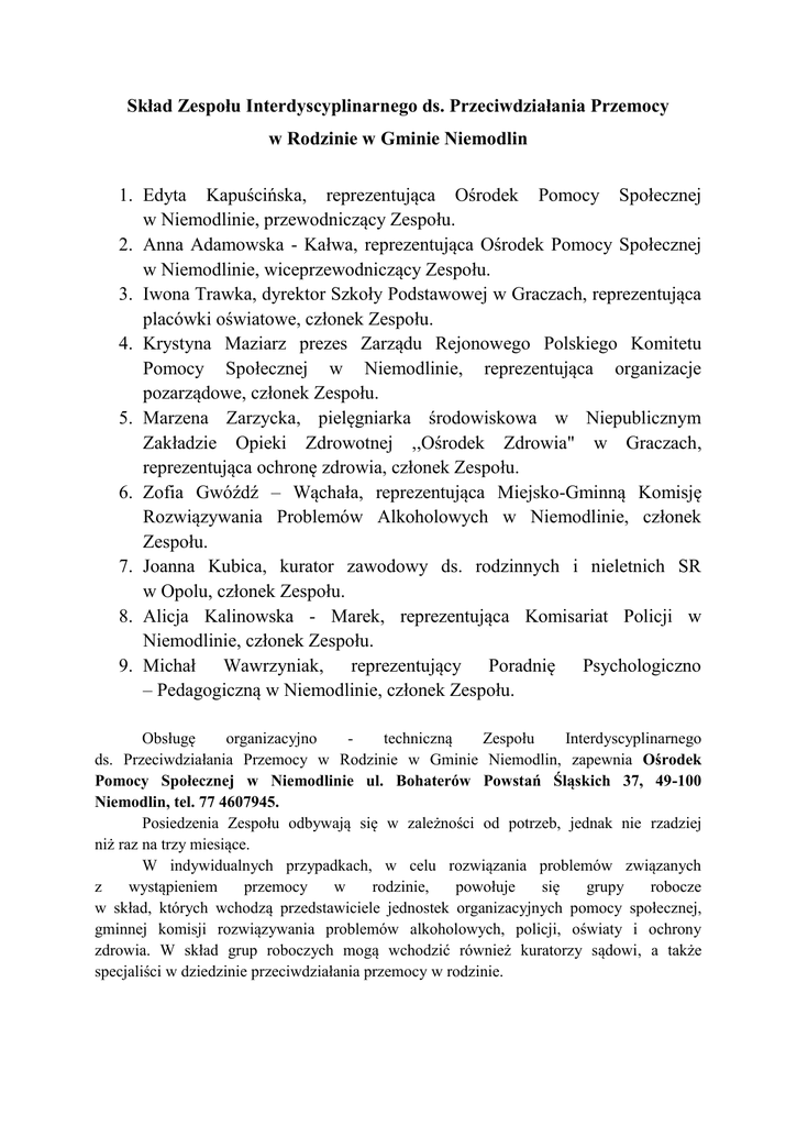 Skład Zespołu Interdyscyplinarnego ds. Przeciwdziałania Przemocy w Rodzinie w Gminie Niemodlin 1. Edyta Kapuścińska, reprezentująca Ośrodek Pomocy Społecznej w Niemodlinie, przewodniczący Zespołu. 2. Anna Adamowska - Kałwa, reprezentująca Ośrodek Pomocy Społecznej w Niemodlinie, wiceprzewodniczący Zespołu. 3. Iwona Trawka, dyrektor Szkoły Podstawowej w Graczach, reprezentująca placówki oświatowe, członek Zespołu. 4. Krystyna Maziarz prezes Zarządu Rejonowego Polskiego Komitetu Pomocy Społecznej w Niemodlinie, reprezentująca organizacje pozarządowe, członek Zespołu. 5. Marzena Zarzycka, pielęgniarka środowiskowa w Niepublicznym Zakładzie Opieki Zdrowotnej ,,Ośrodek Zdrowia" w Graczach, reprezentująca ochronę zdrowia, członek Zespołu. 6. Zofia Gwóźdź – Wąchała, reprezentująca Miejsko-Gminną Komisję Rozwiązywania Problemów Alkoholowych w Niemodlinie, członek Zespołu. 7. Joanna Kubica, kurator zawodowy ds. rodzinnych i nieletnich SR w Opolu, członek Zespołu. 8. Alicja Kalinowska - Marek, reprezentująca Komisariat Policji w Niemodlinie, członek Zespołu. 9. Michał Wawrzyniak, reprezentujący Poradnię Psychologiczno – Pedagogiczną w Niemodlinie, członek Zespołu. Obsługę organizacyjno techniczną Zespołu Interdyscyplinarnego ds. Przeciwdziałania Przemocy w Rodzinie w Gminie Niemodlin, zapewnia Ośrodek Pomocy Społecznej w Niemodlinie ul. Bohaterów Powstań Śląskich 37, 49-100 Niemodlin, tel. 77 4607945. Posiedzenia Zespołu odbywają się w zależności od potrzeb, jednak nie rzadziej niż raz na trzy miesiące. W indywidualnych przypadkach, w celu rozwiązania problemów związanych z wystąpieniem przemocy w rodzinie, powołuje się grupy robocze w skład, których wchodzą przedstawiciele jednostek organizacyjnych pomocy społecznej, gminnej komisji rozwiązywania problemów alkoholowych, policji, oświaty i ochrony zdrowia. W skład grup roboczych mogą wchodzić również kuratorzy sądowi, a także specjaliści w dziedzinie przeciwdziałania przemocy w rodzinie.