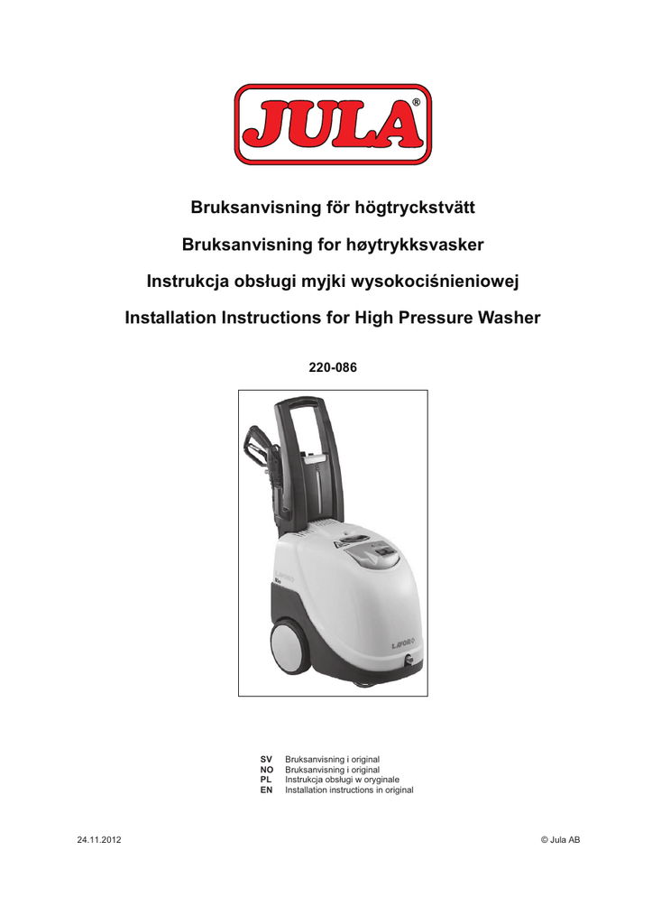 SVENSK A Bruksanvisning för högtryckstvätt Bruksanvisning for høytrykksvasker ,QVWUXNFMDREVáXJLP\MNLZ\VRNRFLĞQLHQLRZHM Installation Instructions for High Pressure Washer 220-086 SV NO PL EN 24.11.201 Bruksanvisning i original Bruksanvisning i original ,QVWUXNFMDREVáXJLZRU\JLQDOH Installation instructions in original © Jula AB SVENSKA 1 SÄKERHETSANVISNINGAR ....................................................................................................................... 4 Symboler .............................................................................................................................................. 5 TEKNISKA DATA ......................................................................................................................................... 5 BESKRIVNING ............................................................................................................................................. 6 MONTERING................................................................................................................................................ 6 Montering av lans och högtrycksslang................................................................................................. 7 HANDHAVANDE .......................................................................................................................................... 7 Allmänt före start.................................................................................................................................. 7 Förberedelser....................................................................................................................................... 7 Start...................................................................................................................................................... 8 UNDERHÅLL .............................................................................................................................................. 10 Reparationer ...................................................................................................................................... 11 Förvaring ............................................................................................................................................ 11 FELSÖKNING............................................................................................................................................. 11 NORSK 13 SIKKERHETSANVISNINGER .................................................................................................................... 13 Symboler ............................................................................................................................................ 14 TEKNISKE DATA ....................................................................................................................................... 14 BESKRIVNING ........................................................................................................................................... 15 MONTERING.............................................................................................................................................. 15 Montering av lanse og høytrykksslange ............................................................................................ 16 BRUK.......................................................................................................................................................... 16 Generelt før du begynner................................................................................................................... 16 Forberedelser..................................................................................................................................... 16 Oppstart ............................................................................................................................................. 17 VEDLIKEHOLD .......................................................................................................................................... 19 Reparasjoner ..................................................................................................................................... 19 Oppbevaring ...................................................................................................................................... 19 FEILSØKING .............................................................................................................................................. 20 POLSKI 22 =$6$'<%(=3,(&=(ē67:$ Symbole ............................................................................................................................................. 23 DANE TECHNICZNE ................................................................................................................................. 23 OPIS ........................................................................................................................................................... 24 0217$ĩ 0RQWDĪODQF\LZĊĪDZ\VRNRFLĞQLHQLRZHJR 2%6à8*$ Ogólne wskazówki przed uruchomieniem ......................................................................................... 25 Przygotowania ................................................................................................................................... 25 Rozruch.............................................................................................................................................. 26 KONSERWACJA........................................................................................................................................ 28 Naprawy............................................................................................................................................. 29 Przechowywanie .......................................................................................